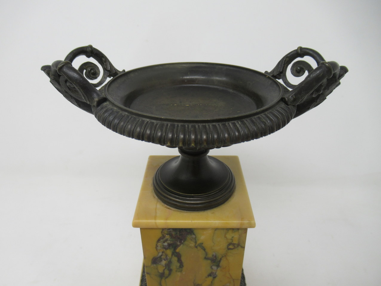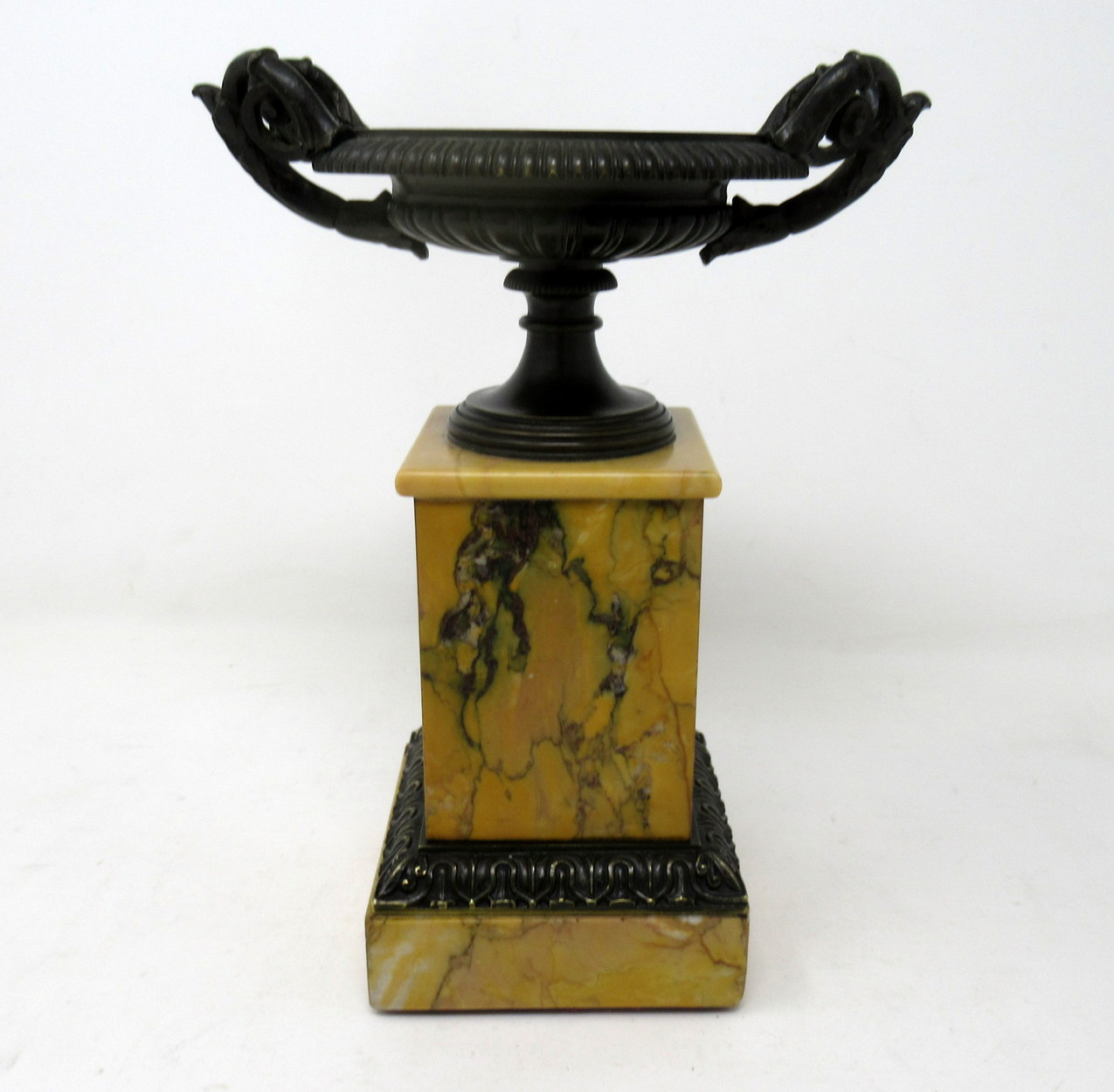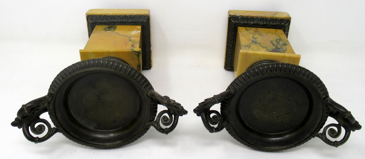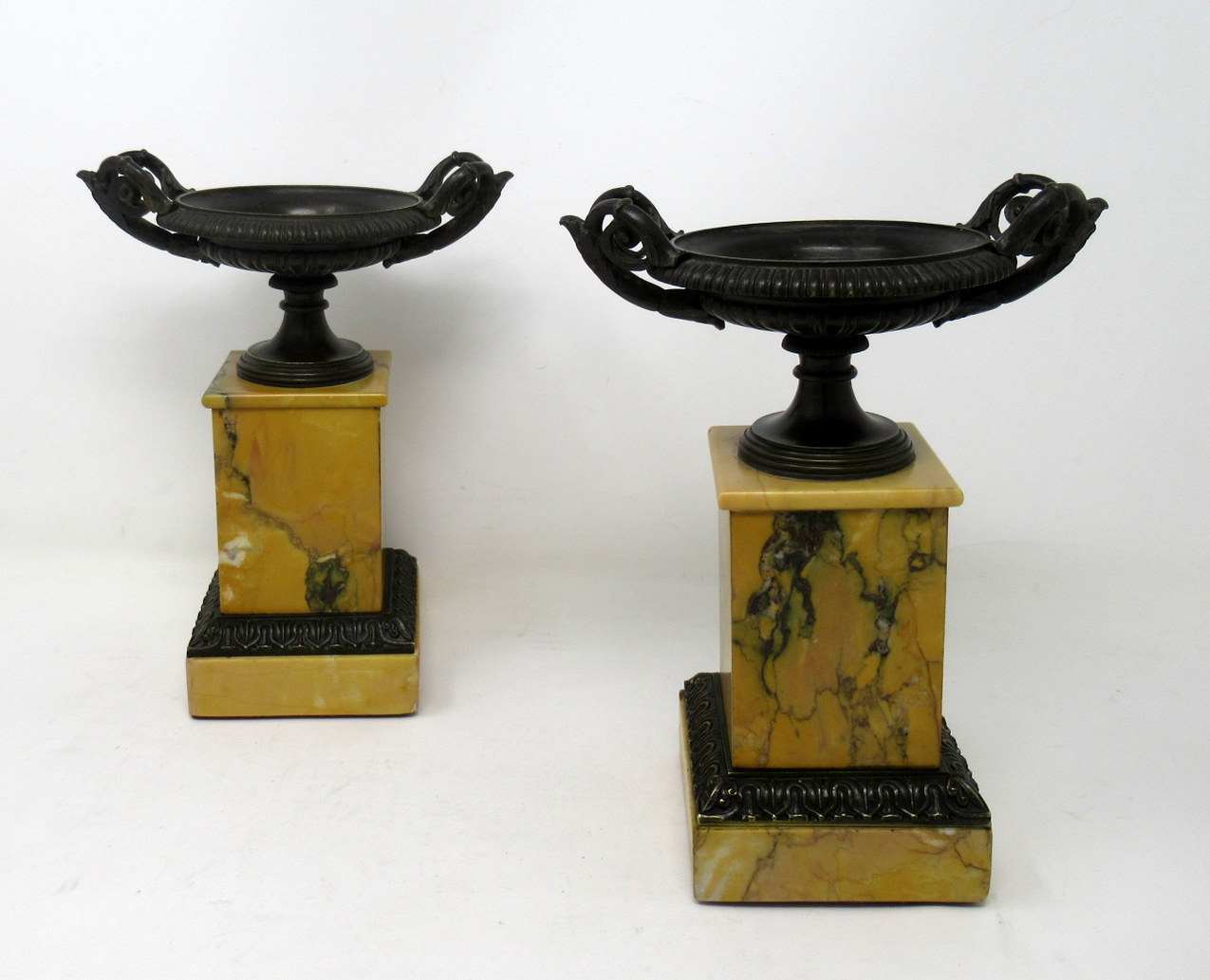 A Very Fine Pair of French Patinated Bronze & Well Grained Sienna Marble Grand Tour Twin Handle Tazza of compact and heavy proportions. First quarter of the Nineteenth Century, possibly Regency period.