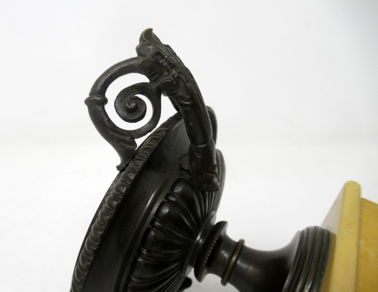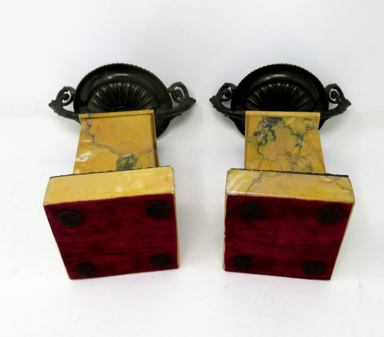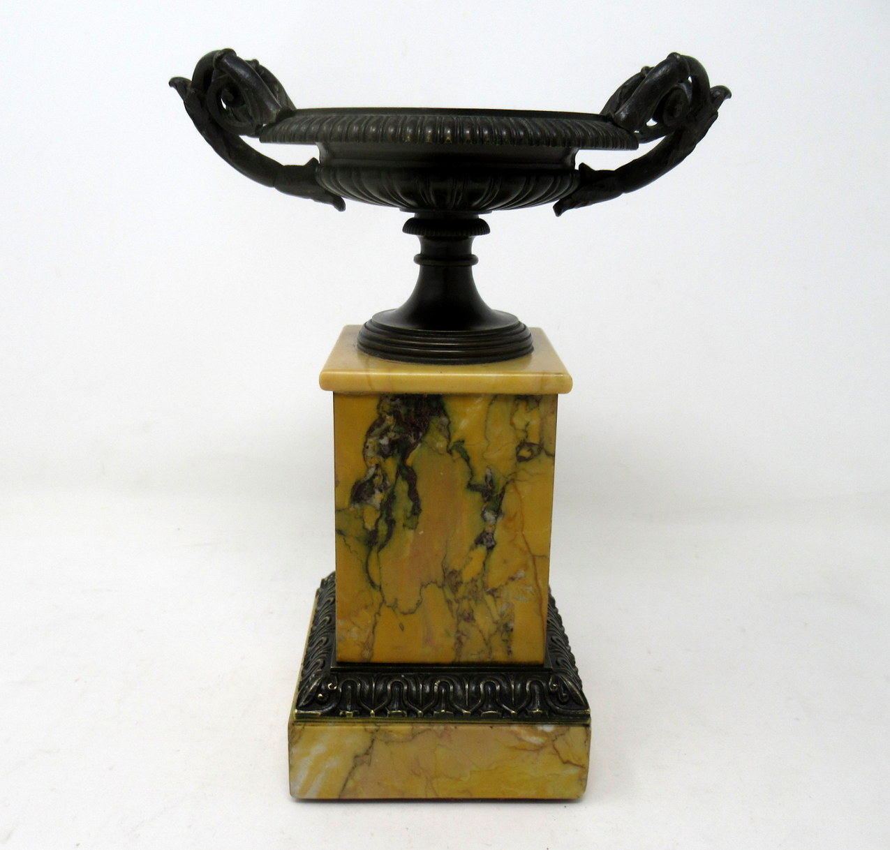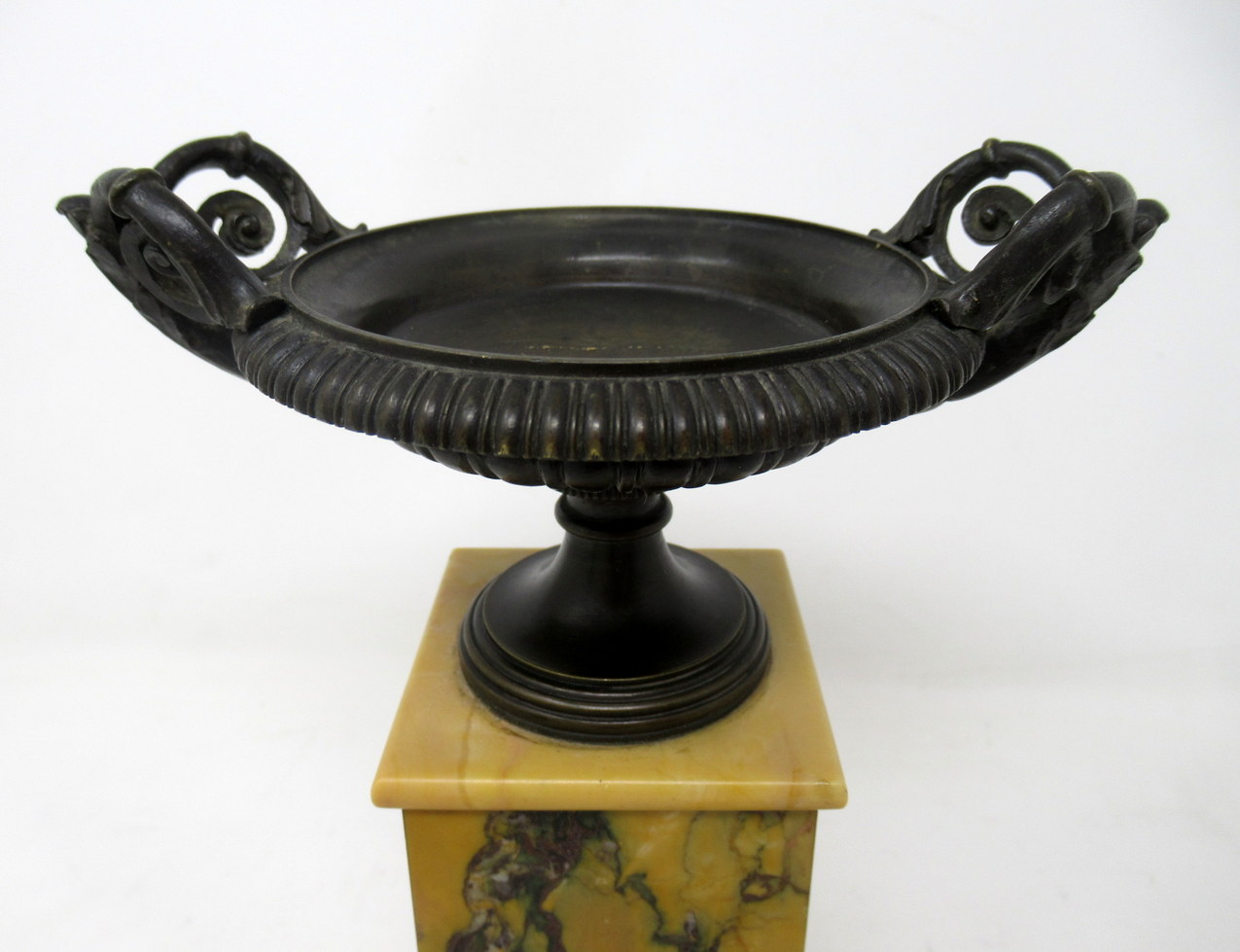 A Very Fine Pair of French Patinated Bronze & Well Grained Sienna Marble Grand Tour Twin Handle Tazza of compact and heavy proportions. First quarter of the Nineteenth Century, possibly Regency period.