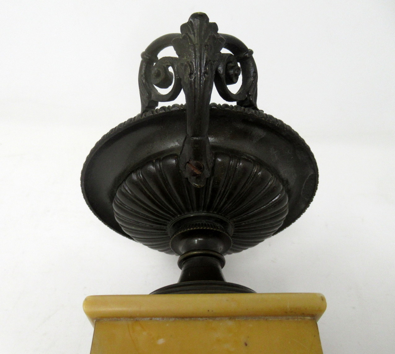 Each circular bowl with lobed reeded body and decorative moulded reeded detail rims and twin bronze handles raised on a central two ring socle on circular spreading base above a square shaped and stepped marble plinth base with a band of acanthus leaf bronze mount.