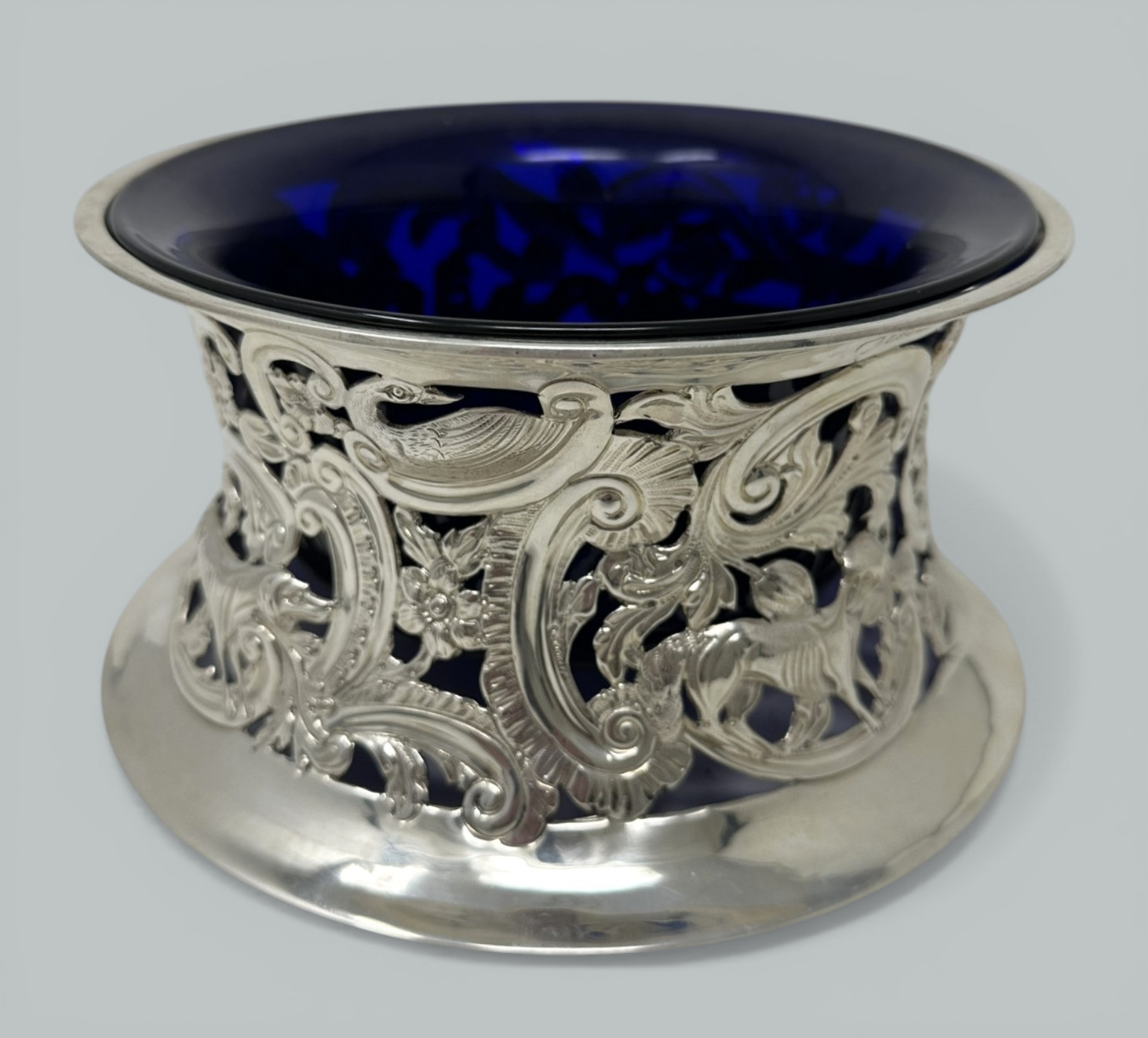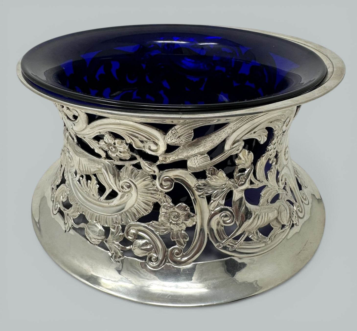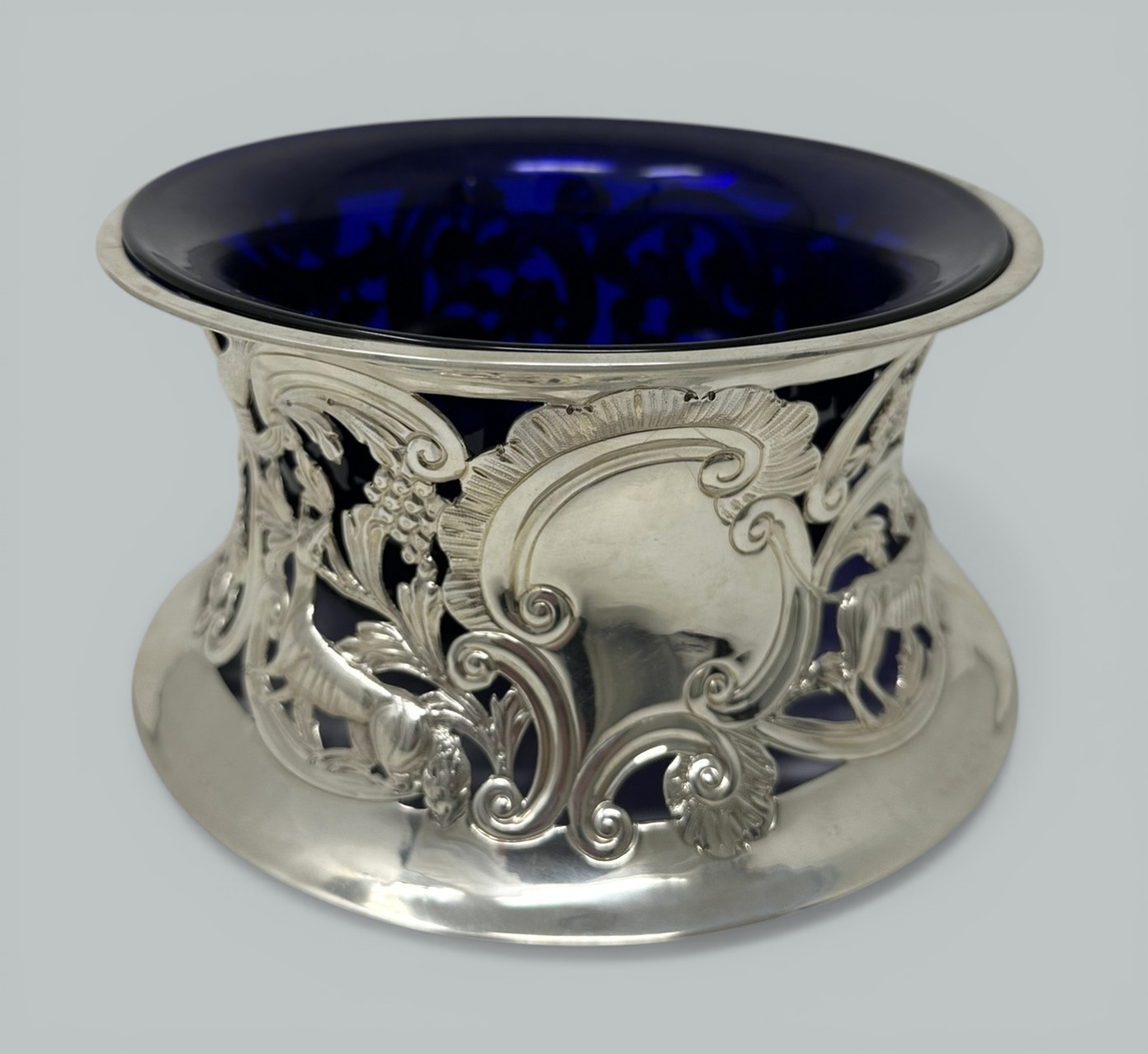 Table Dish Rings (sometimes erroneously referred to as Potato Rings) were first made in Ireland and also in England from around about 1780, were originally of silver and highly ornamented. They were usually elliptical in outline and wider in each dimension below than above. The largest know examples were up to ten inches in diameter and up to four inched in height. Use was made of both piercing and repousse work to obtain the highest decorative effects, this style of decoration was necessary to help the heat escape from hot table dishes through the piercing, blue (sometimes green or clear) hand blown glass liners were a later addition. This is a stunning example in wonderful condition.