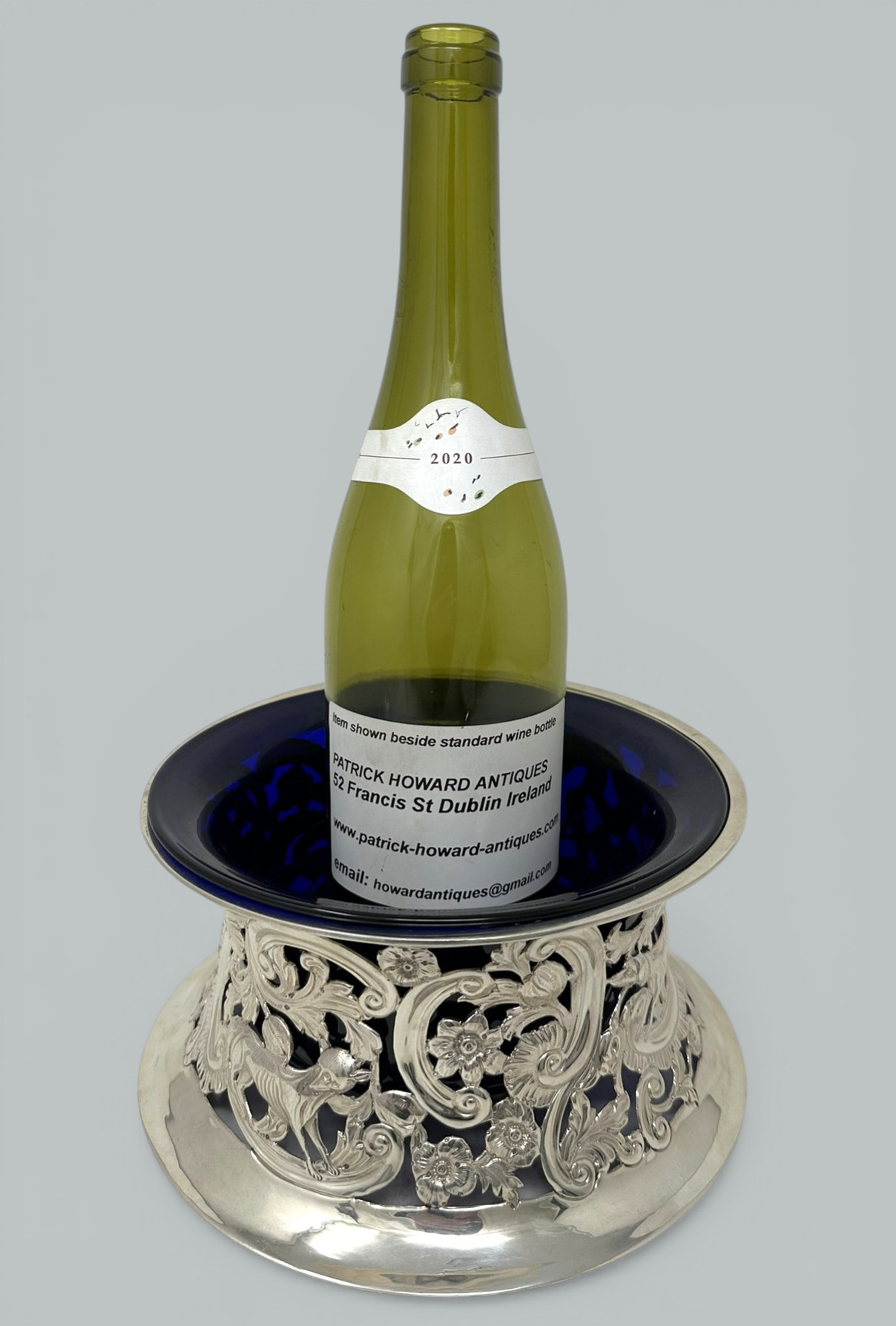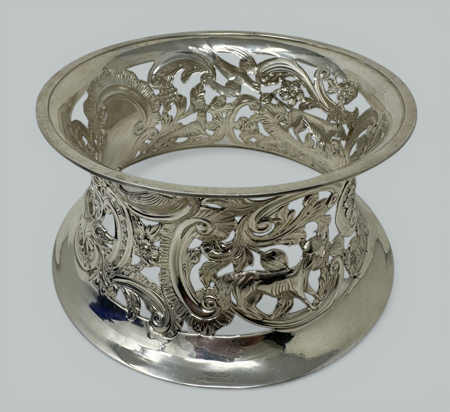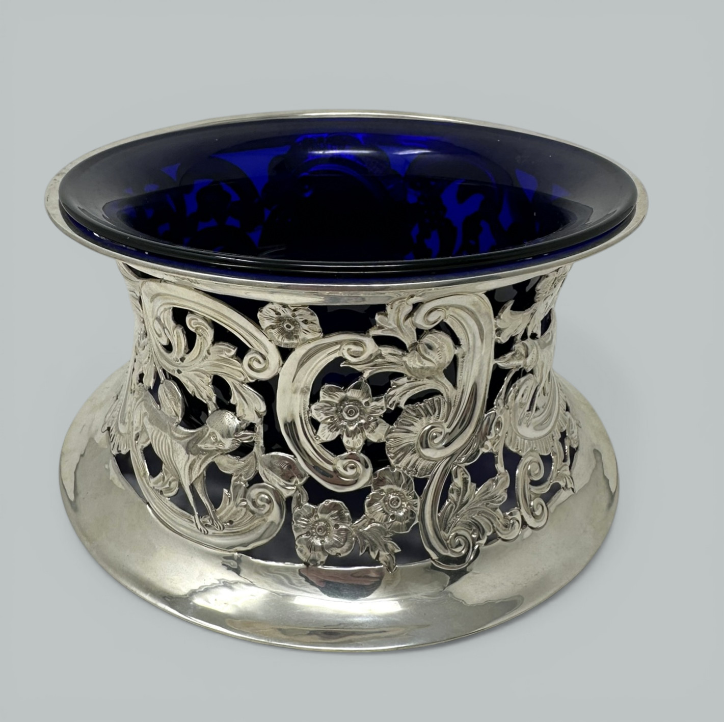 Table Dish Rings (sometimes erroneously referred to as Potato Rings) were first made in Ireland and also in England from around about 1780, were originally of silver and highly ornamented. They were usually elliptical in outline and wider in each dimension below than above. The largest know examples were up to ten inches in diameter and up to four inched in height. Use was made of both piercing and repousse work to obtain the highest decorative effects, this style of decoration was necessary to help the heat escape from hot table dishes through the piercing, blue (sometimes green or clear) hand blown glass liners were a later addition. This is a stunning example in wonderful condition.