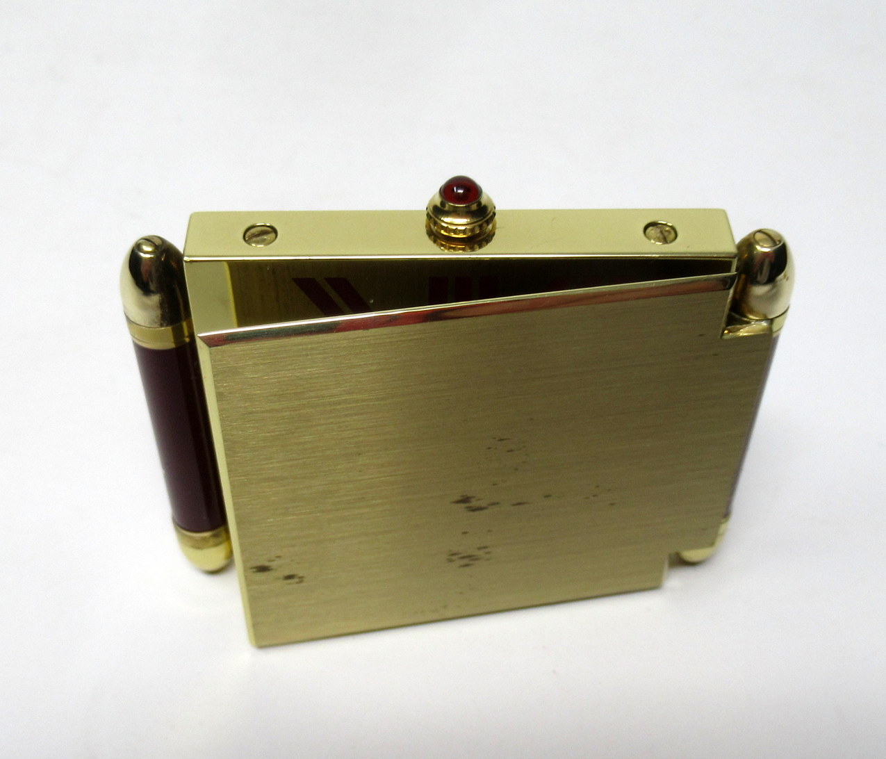 The attractive white dial with Roman Numerals in burgundy coloured enamel on the outer bezel. Displays on its flip-over hinged base stand. Classical same colour cabochon for adjusting time and alarm. The spear shaped hands are possibly gold.