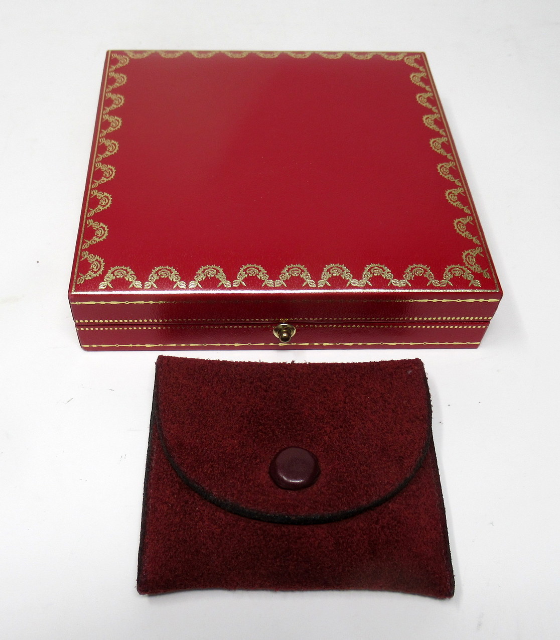 Condition: Good working condition recently serviced to include a new battery. There is light surface wear to back areas. Original Cartier red case and suede pouch, both are of used appearance. Authentic Reg. No.355116210