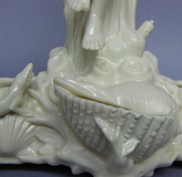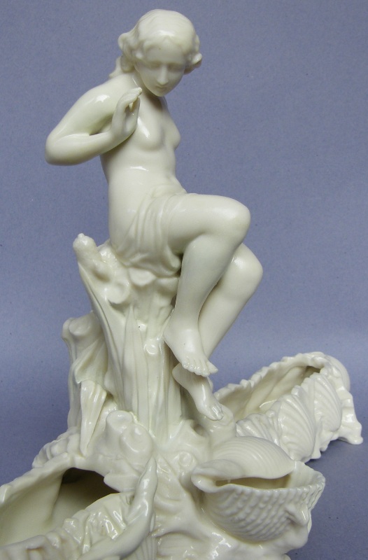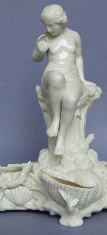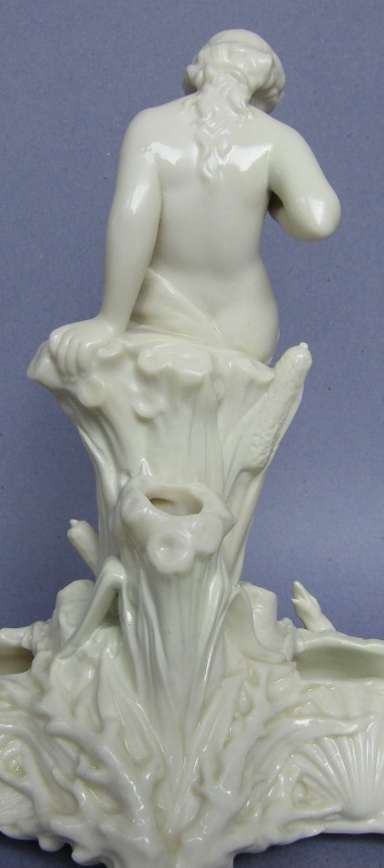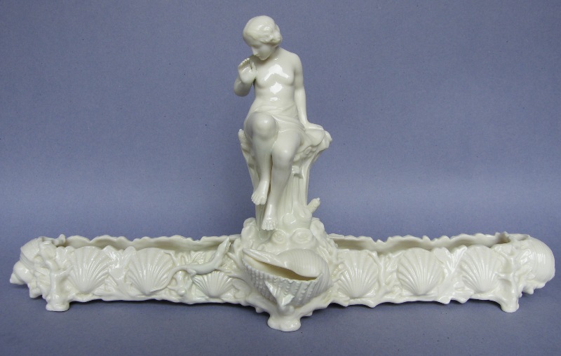 Each with a central scantily clad Maiden seated on a naturelistic tree trunk surrounded by foliage, looking down in fear of a lizard below. The main trough with applied scallop shells on all sides, with a large central shell at front.