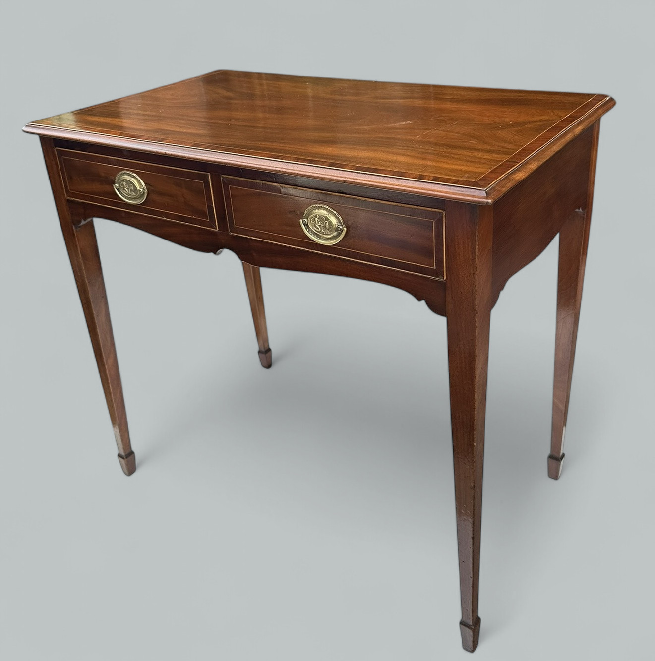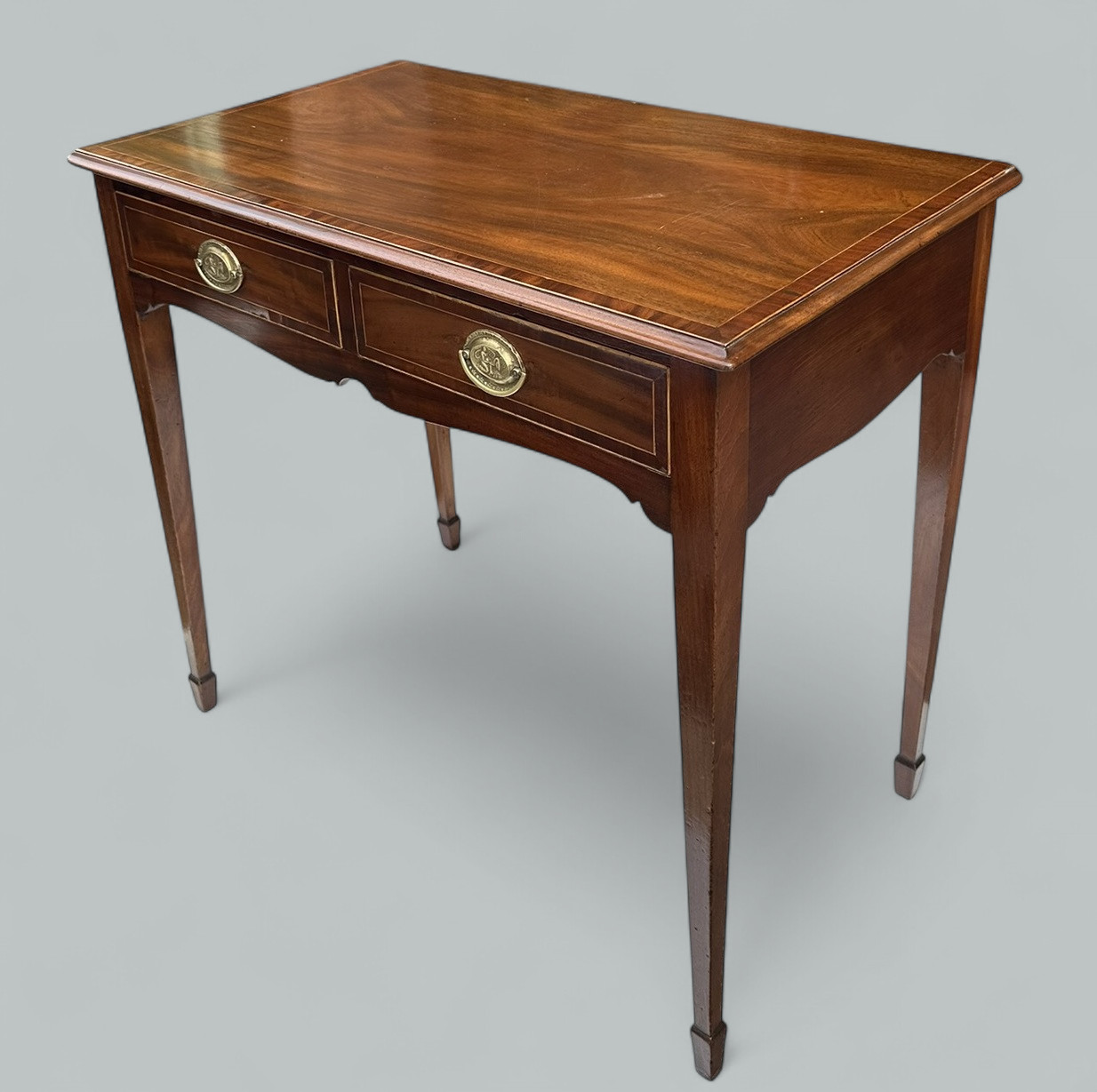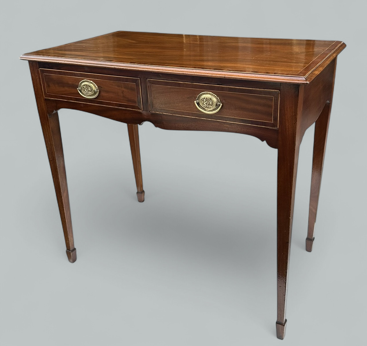 The rectangular surface above a shaped apron, enclosing oak lined twin drawers, complete with their decorative polished brass drop handle pulls. Supported on four elegant square tapering legs ending on spade feet.