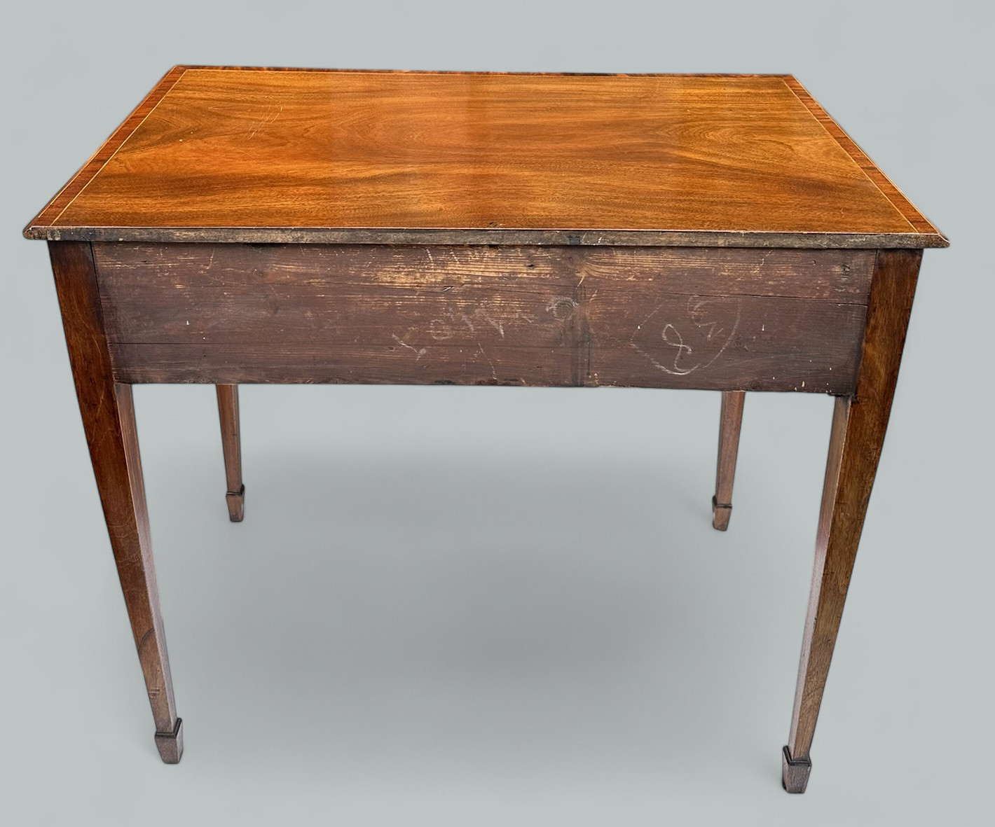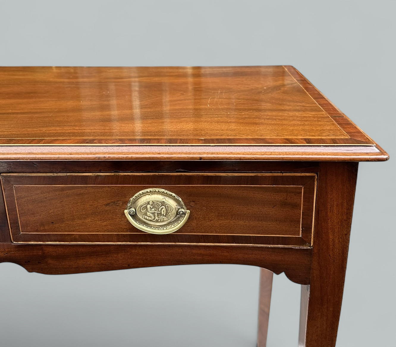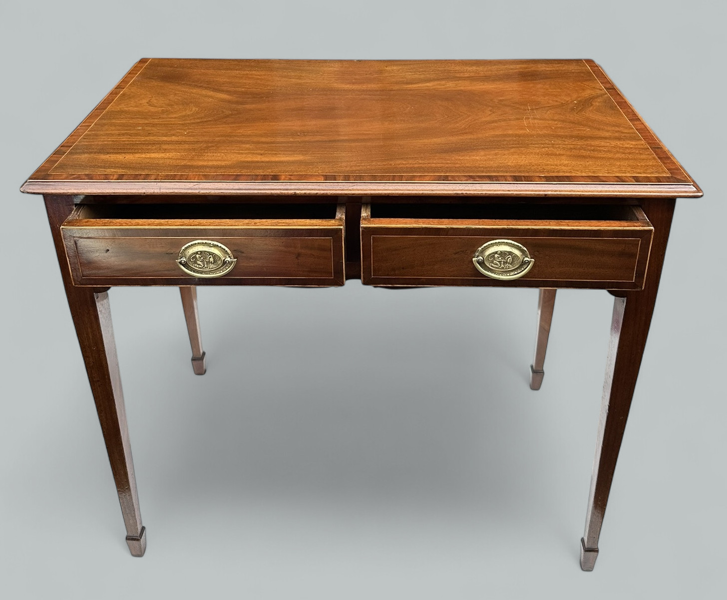The rectangular surface above a shaped apron, enclosing oak lined twin drawers, complete with their decorative polished brass drop handle pulls. Supported on four elegant square tapering legs ending on spade feet.