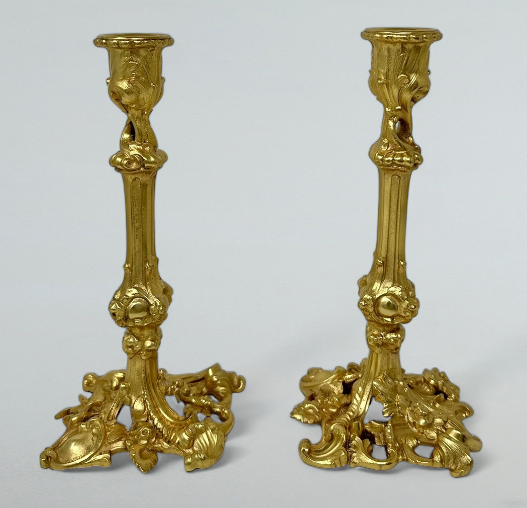 Stylish Pair of early Edwardian French heavy gauge Ormolu Single Light Table Candlesticks of outstanding quality and generous proportions.