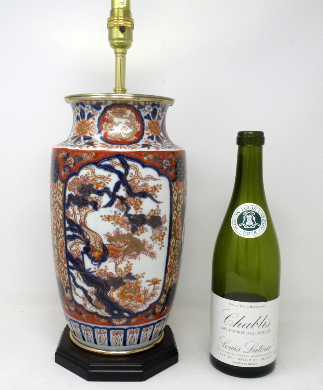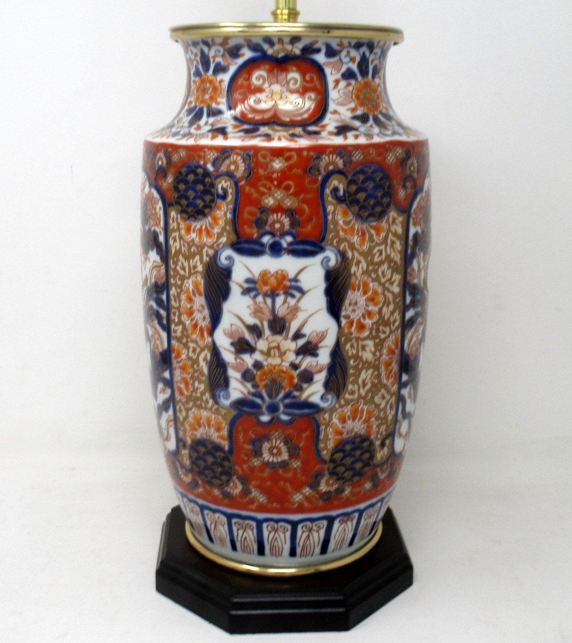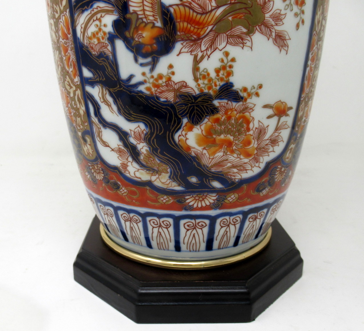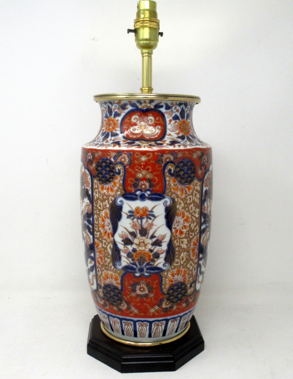 Stunning Traditional Japanese Imari hand decorated porcelain baluster form glazed porcelain Vase of good-sized proportions, now converted to an electric Table Lamp, complete with later plain heavy-duty Ormolu circular mount and ebonized wooden stepped base. Third quarter of the Nineteenth Century.