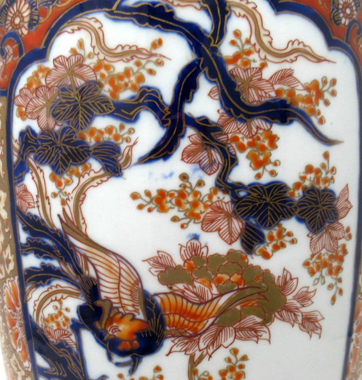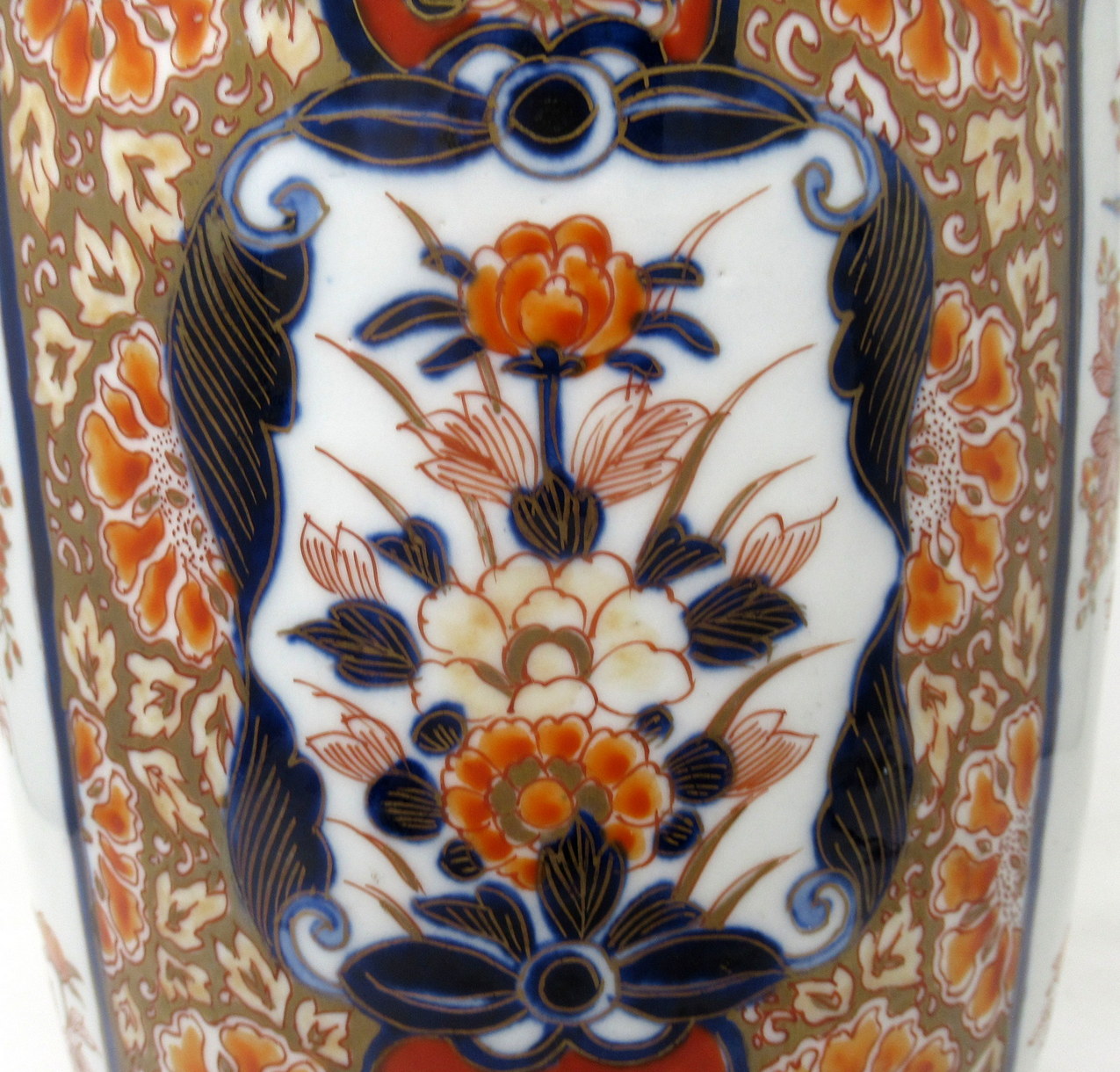 The main outer glazed porcelain body with plain surface detail, beautifully hand decorated with all over typical decorative Imari palette in colours of iron red and cobalt blue tones on an off-white ground, beautifully mounted with an ormolu mount