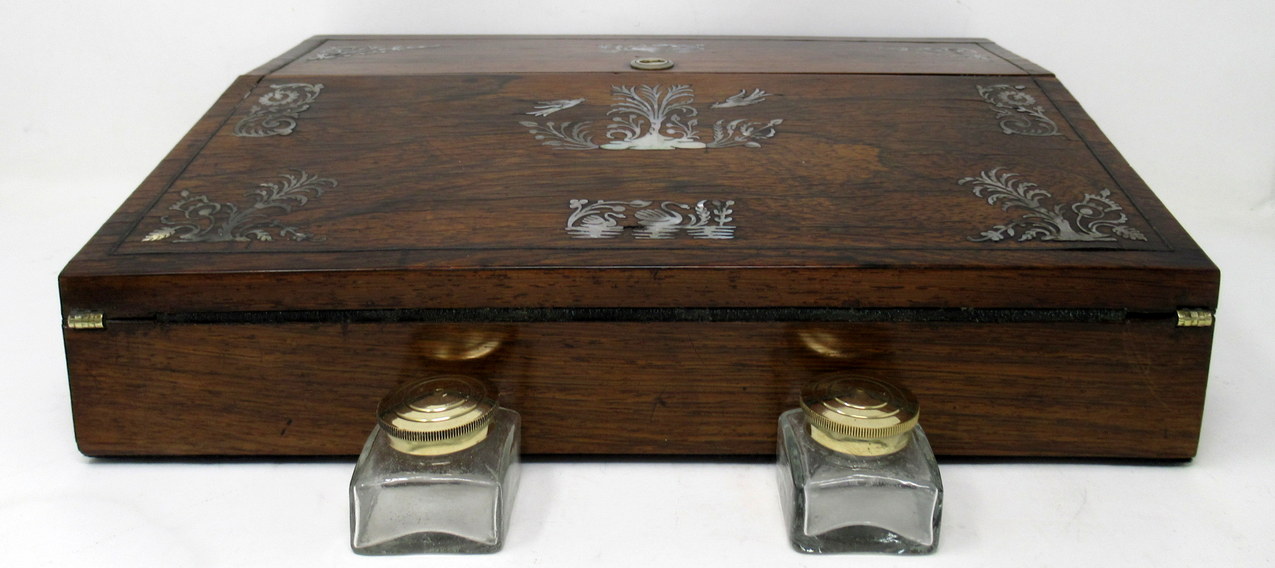 The entire outer main area with lavish Mother of Pearl inlays depicting scrolls and flowers, other areas with inlay of exotic flying birds and swans in waters, opening to reveal a wonderful fitted complete interior and a later dark green leather with lavish gold leaf tooling.