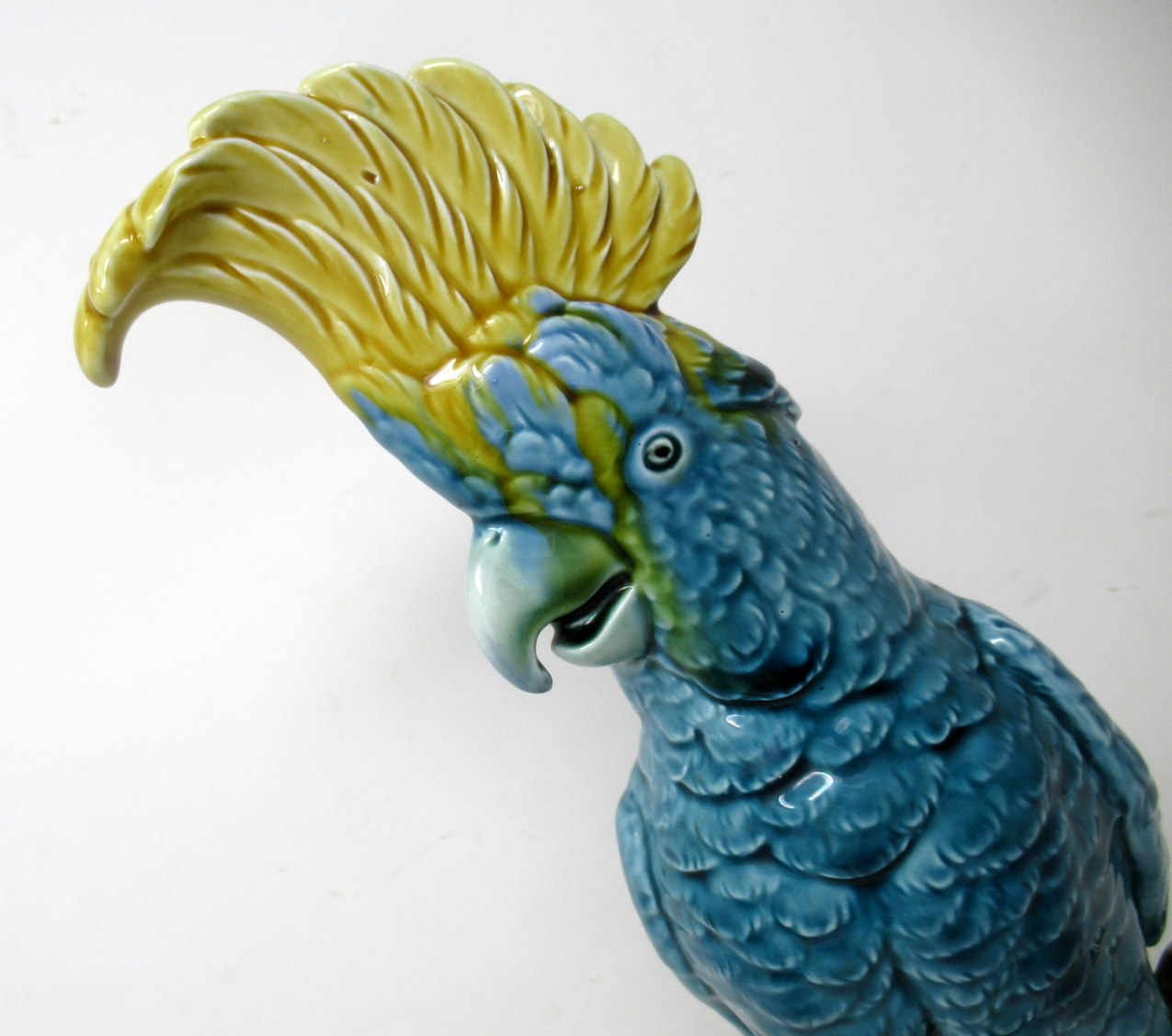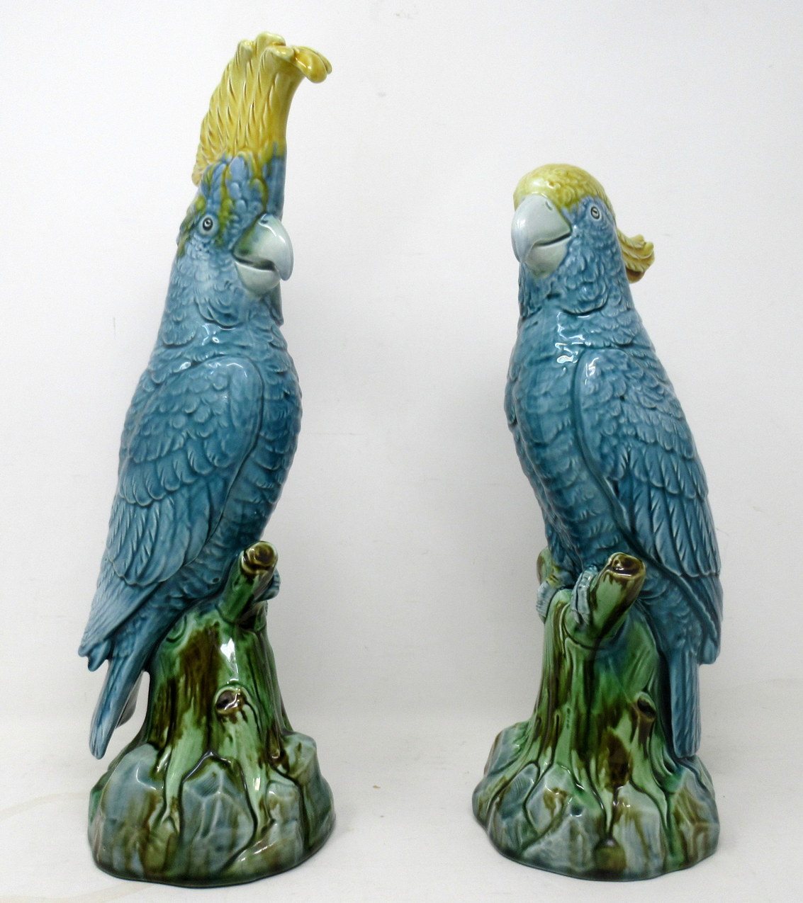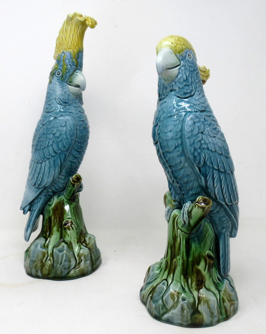 An Exceptionally Fine Quality Highly Detailed Pair of English pottery vivid Majolica Parrot Feathered Figures, firmly attributed to Mintons, last quarter of the Nineteenth Century.