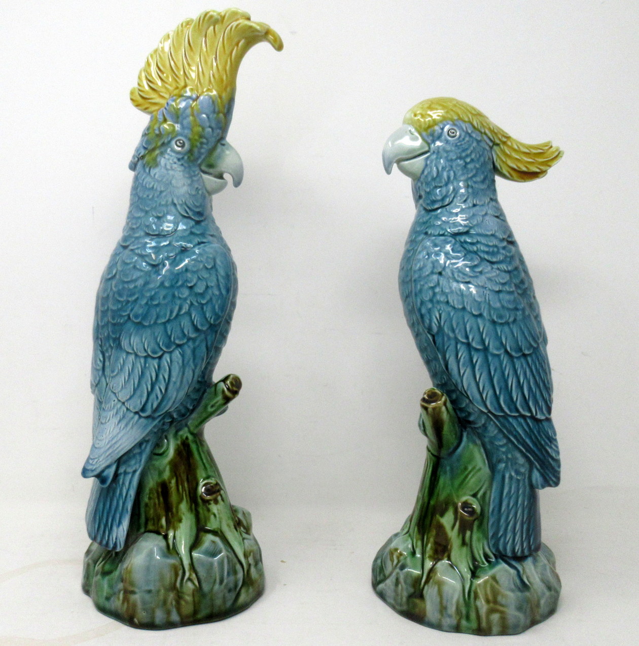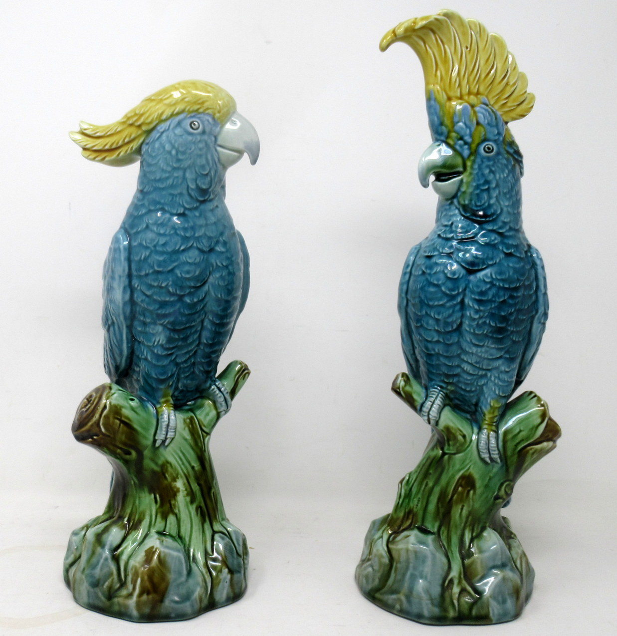 442. Pair Minton Majolica Staffordshire Porcelain Birds Parakeets Cockrels Cockatoo