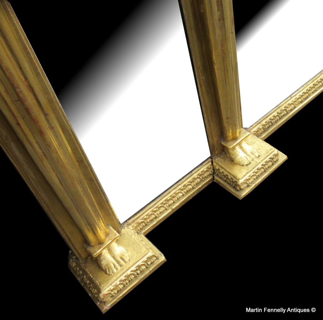 This beautiful Irish Gilt Three Comparmental Mirror is really stunning and of a useful size. It dates from Circa 1820. The Carved detail frame and cartouche are masterfully done and rare to find in such superb condition. This Mirror has the original Mirror and Back and deep rich patina.