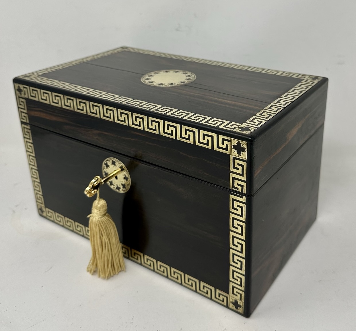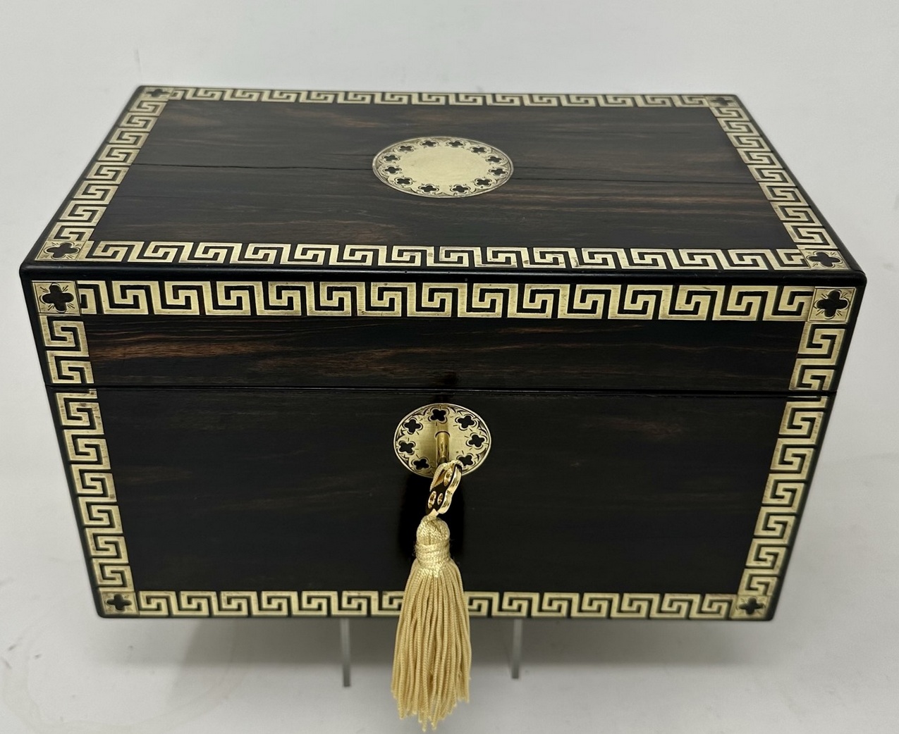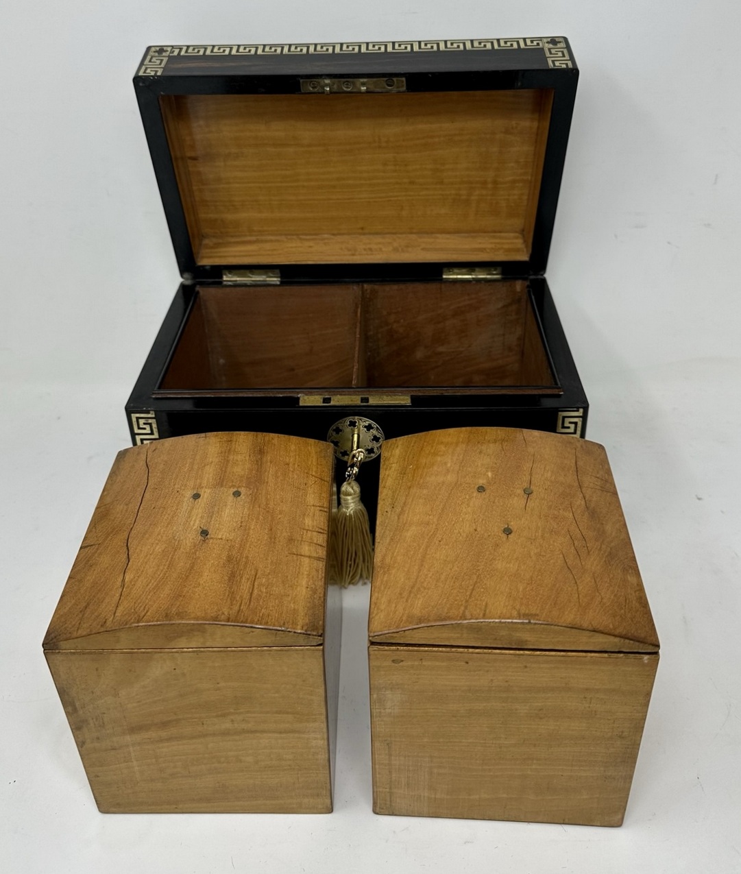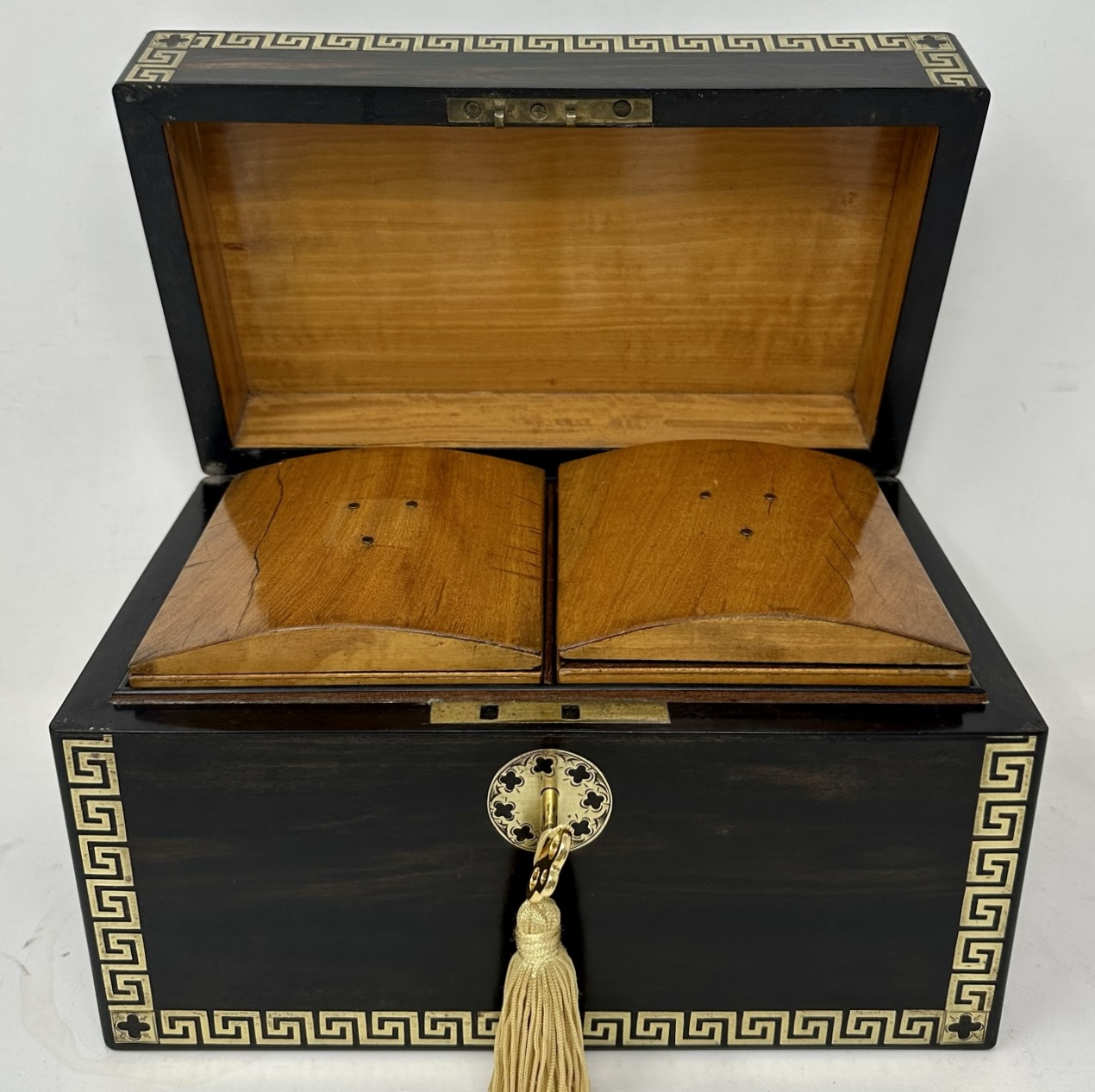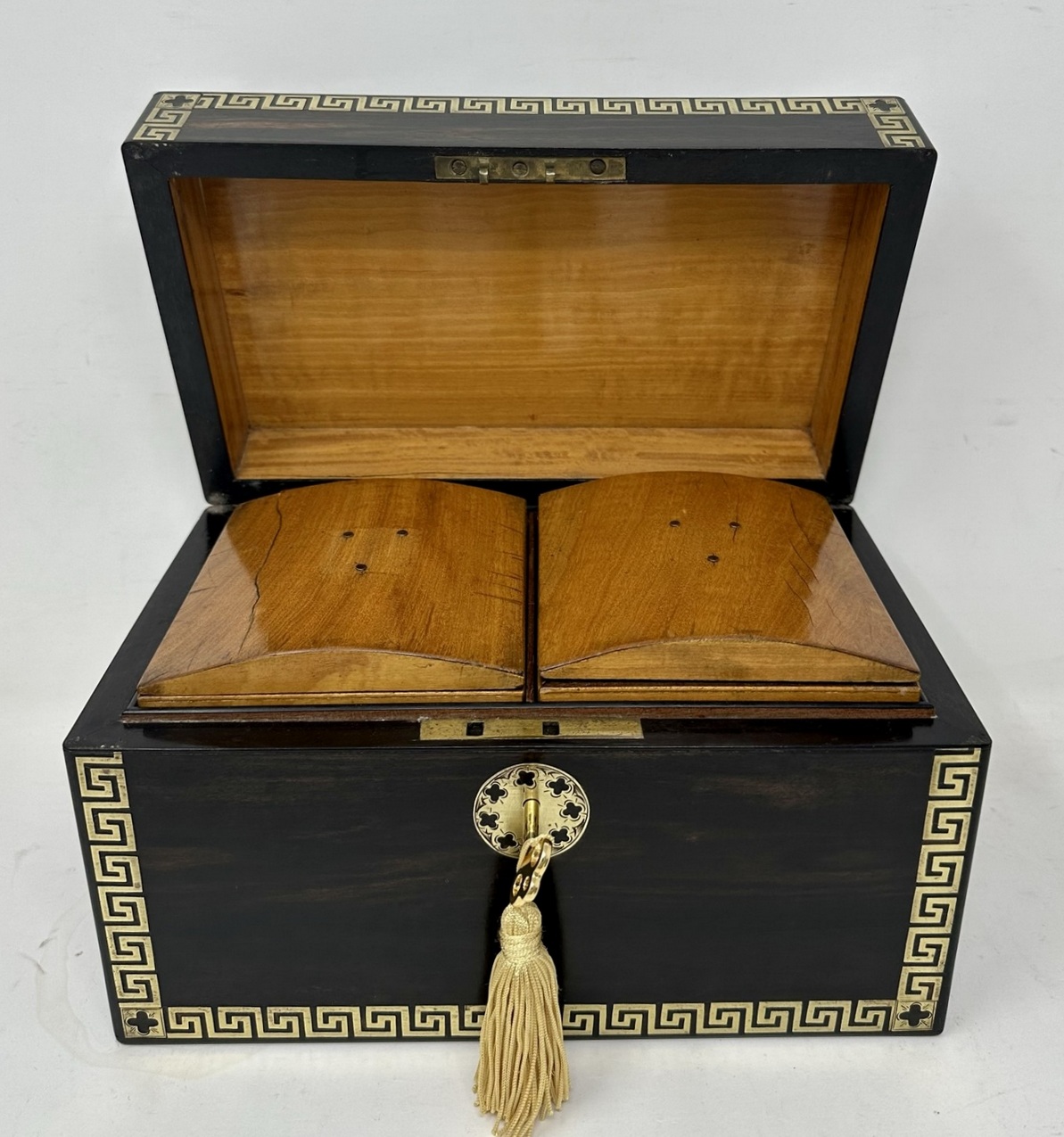 The rectangular hinged lid opening to reveal two lift out original interior satinwood tea cannisters complete with twin dome shaped covers, the outer body with lavish brass inlay Greek key decorative pattern inlay on edges of cover and front areas