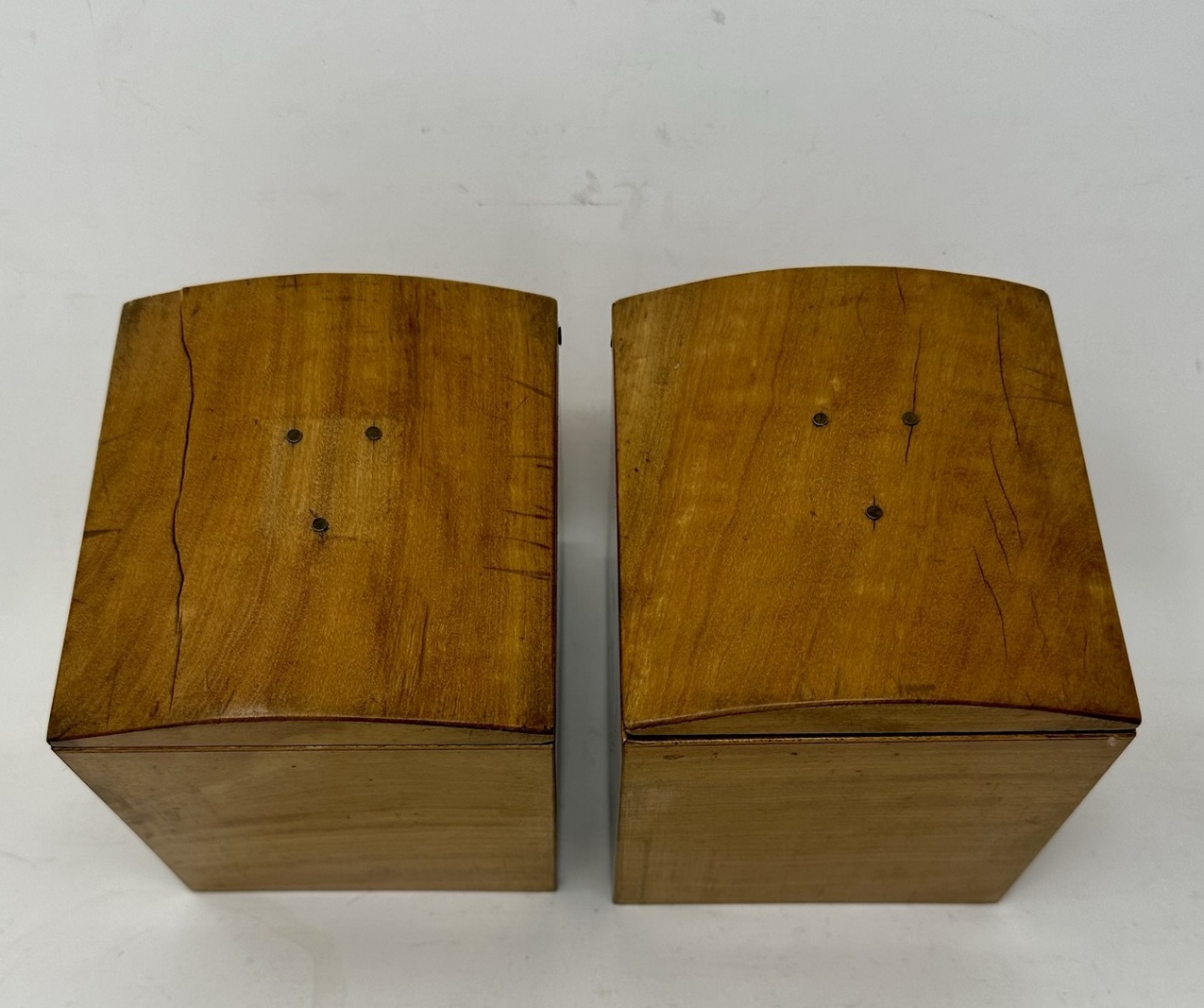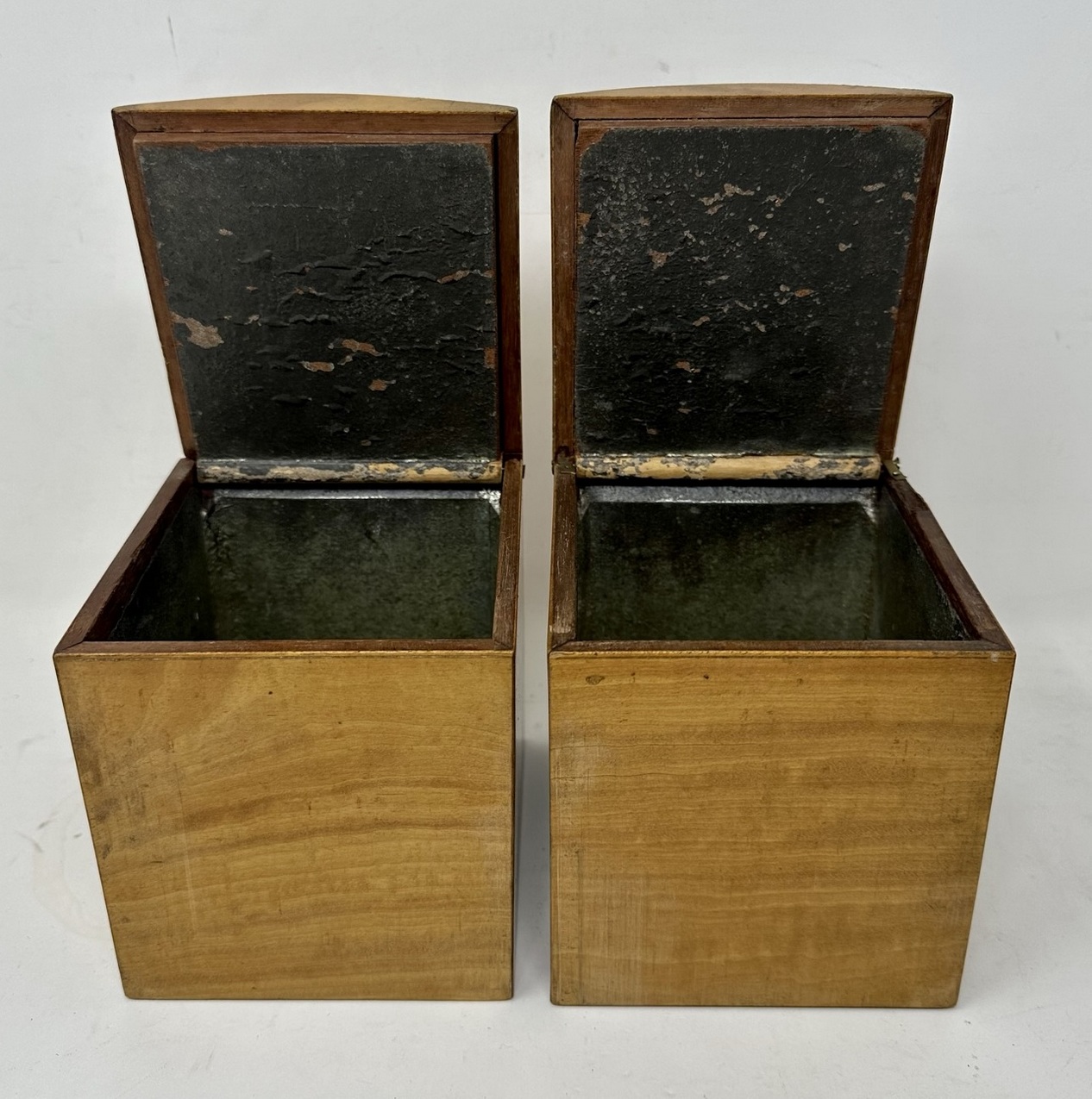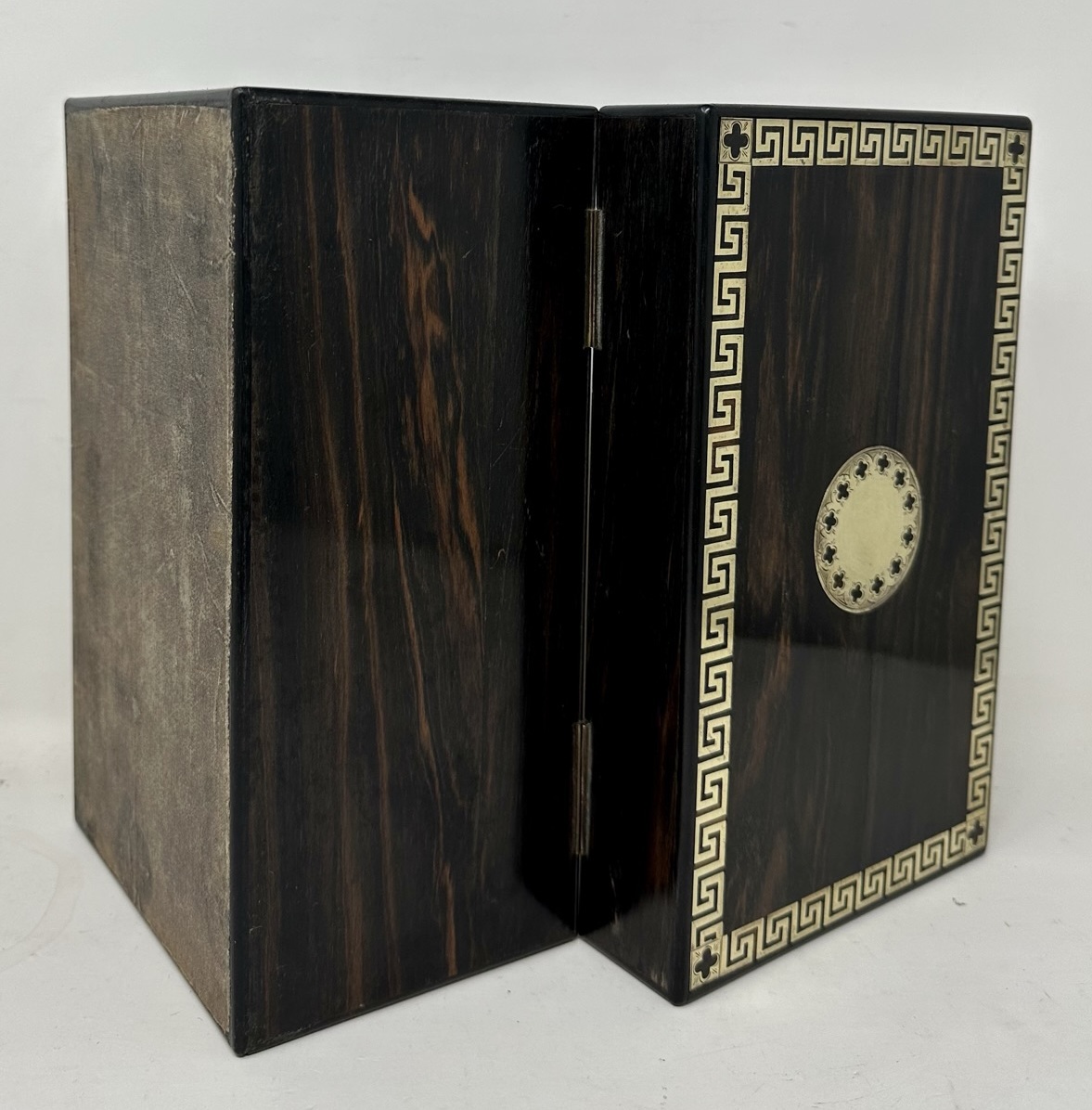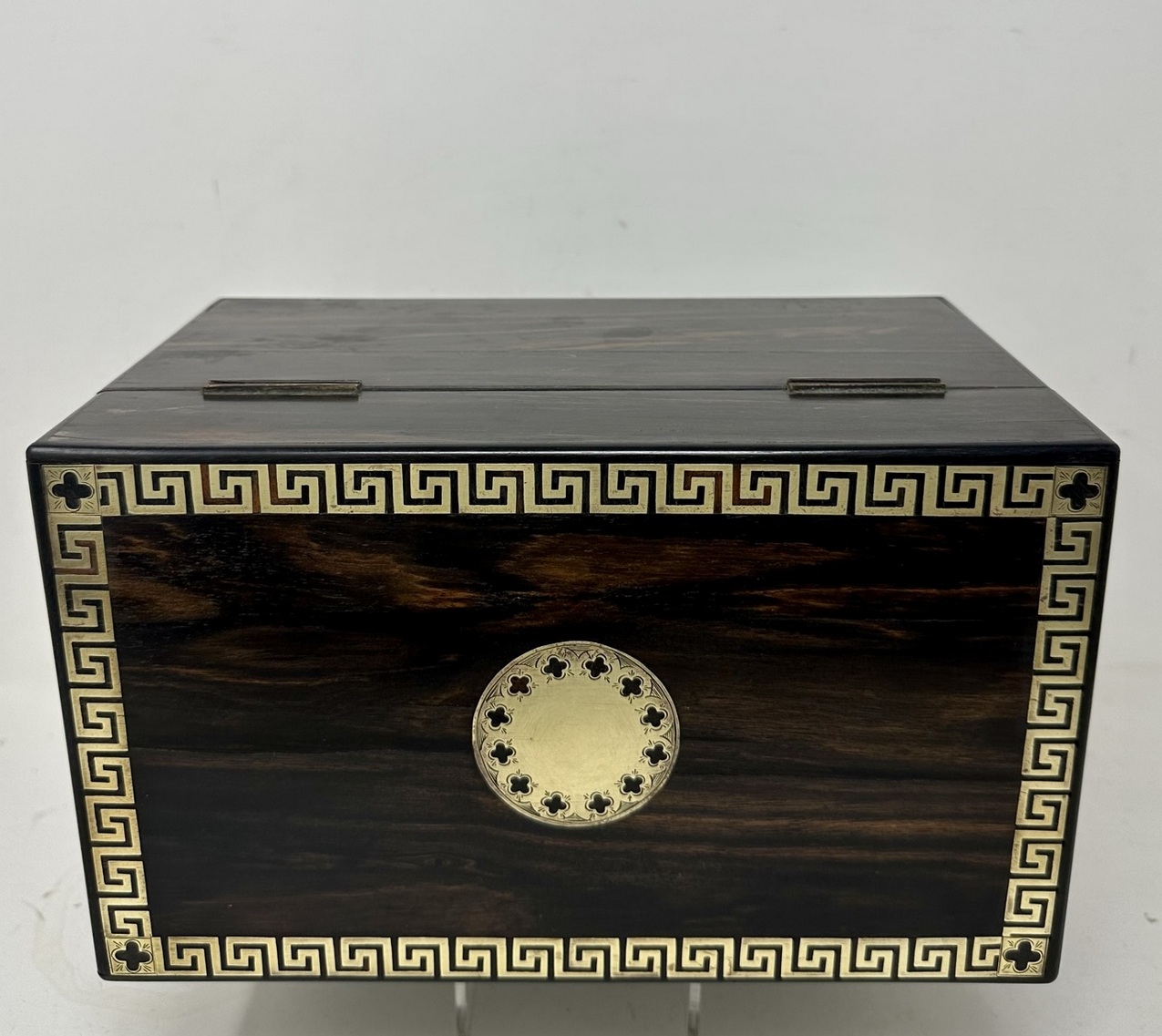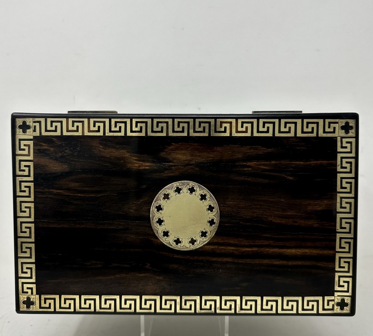 The rectangular hinged lid opening to reveal two lift out original interior satinwood tea cannisters complete with twin dome shaped covers, the outer body with lavish brass inlay Greek key decorative pattern inlay on edges of cover and front areas