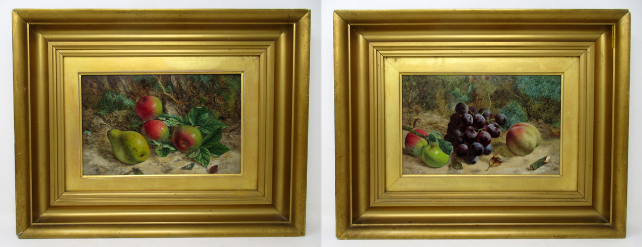 An exceptionally fine quality example of a pair of framed Still Life of fruits Oil Paintings on Artists board by well documented English Artist William Hughes, third quarter of the Nineteenth Century. Complete with good giltwood frames, one is signed lower left W. Hughes and dated 1863