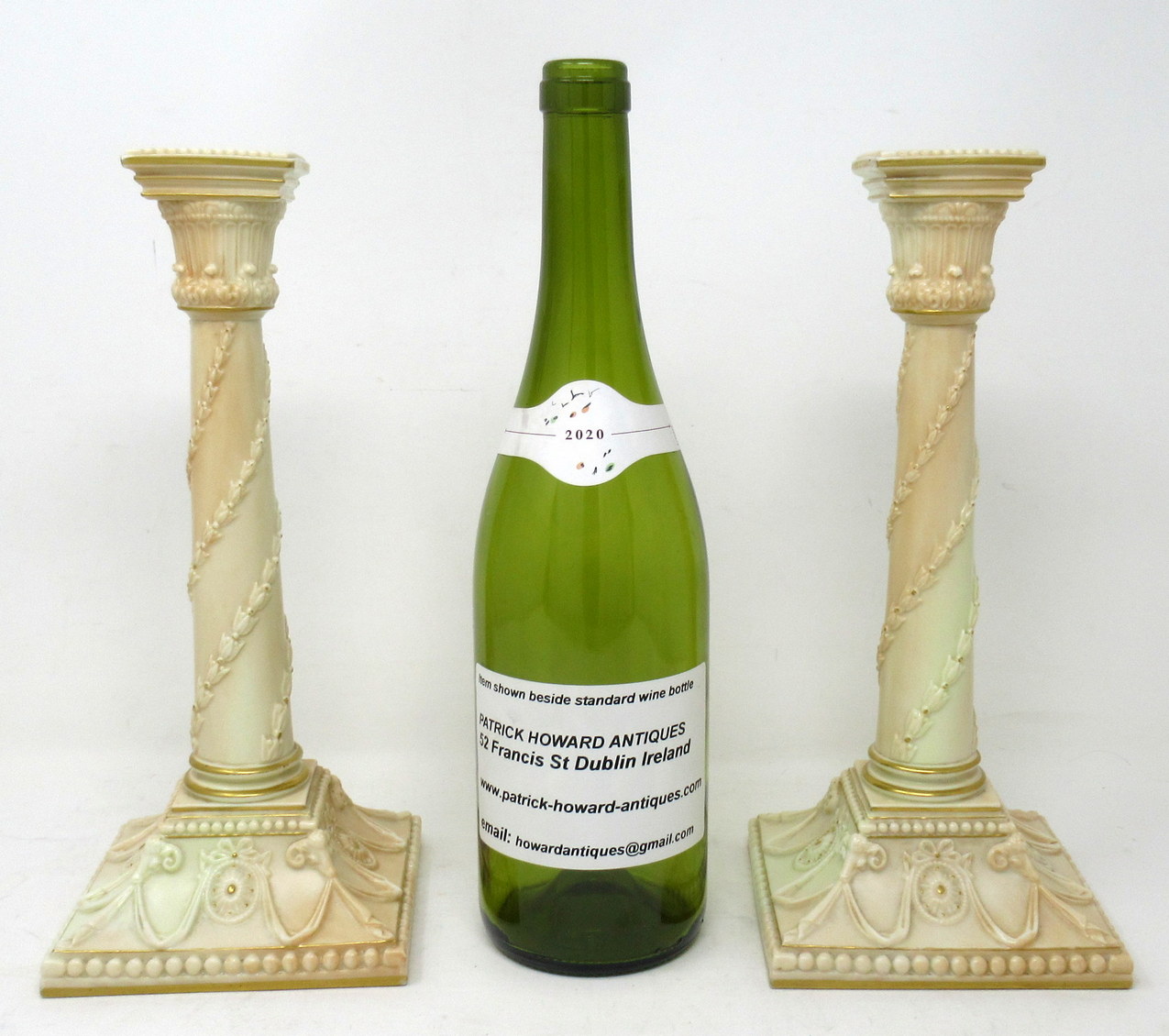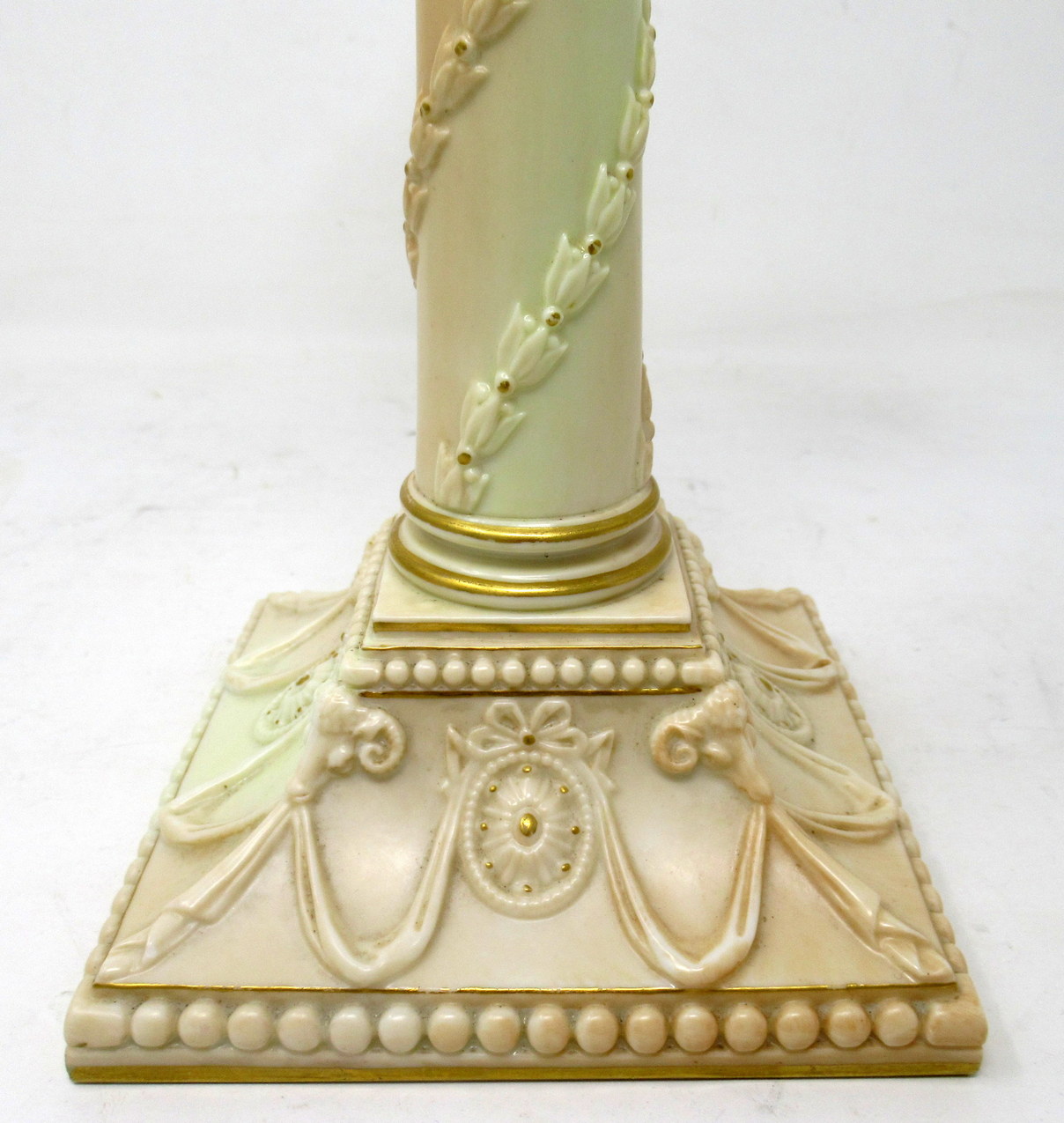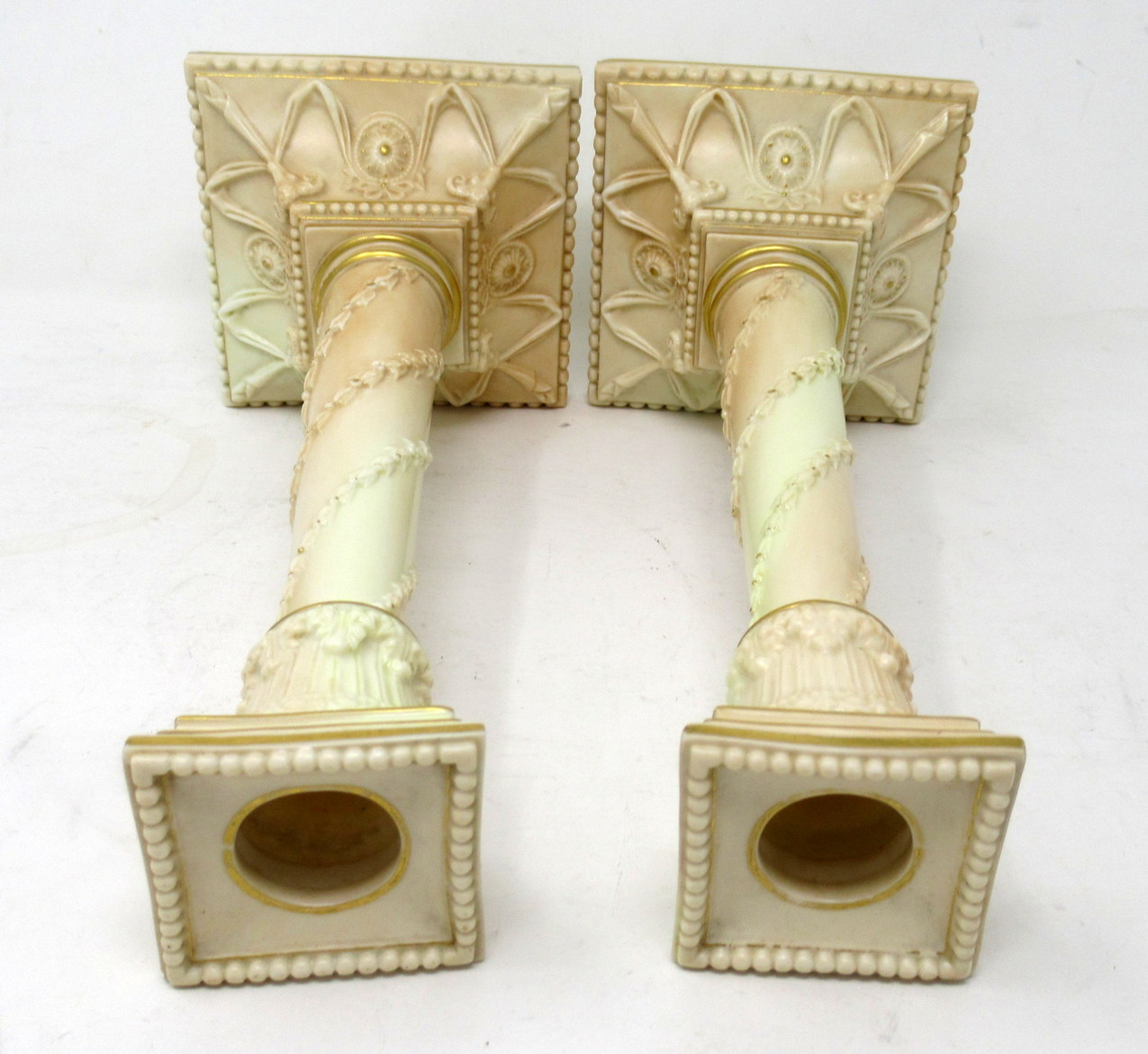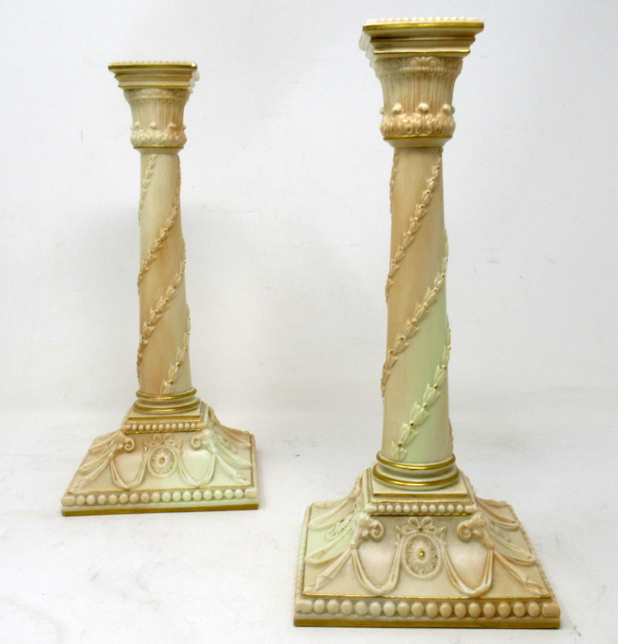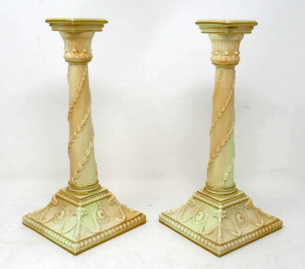An Exceptionally Fine Pair English Porcelain Royal Worcester Corinthian Column Single Light Candlesticks of Museum quality. Last quarter of the Nineteenth Century.