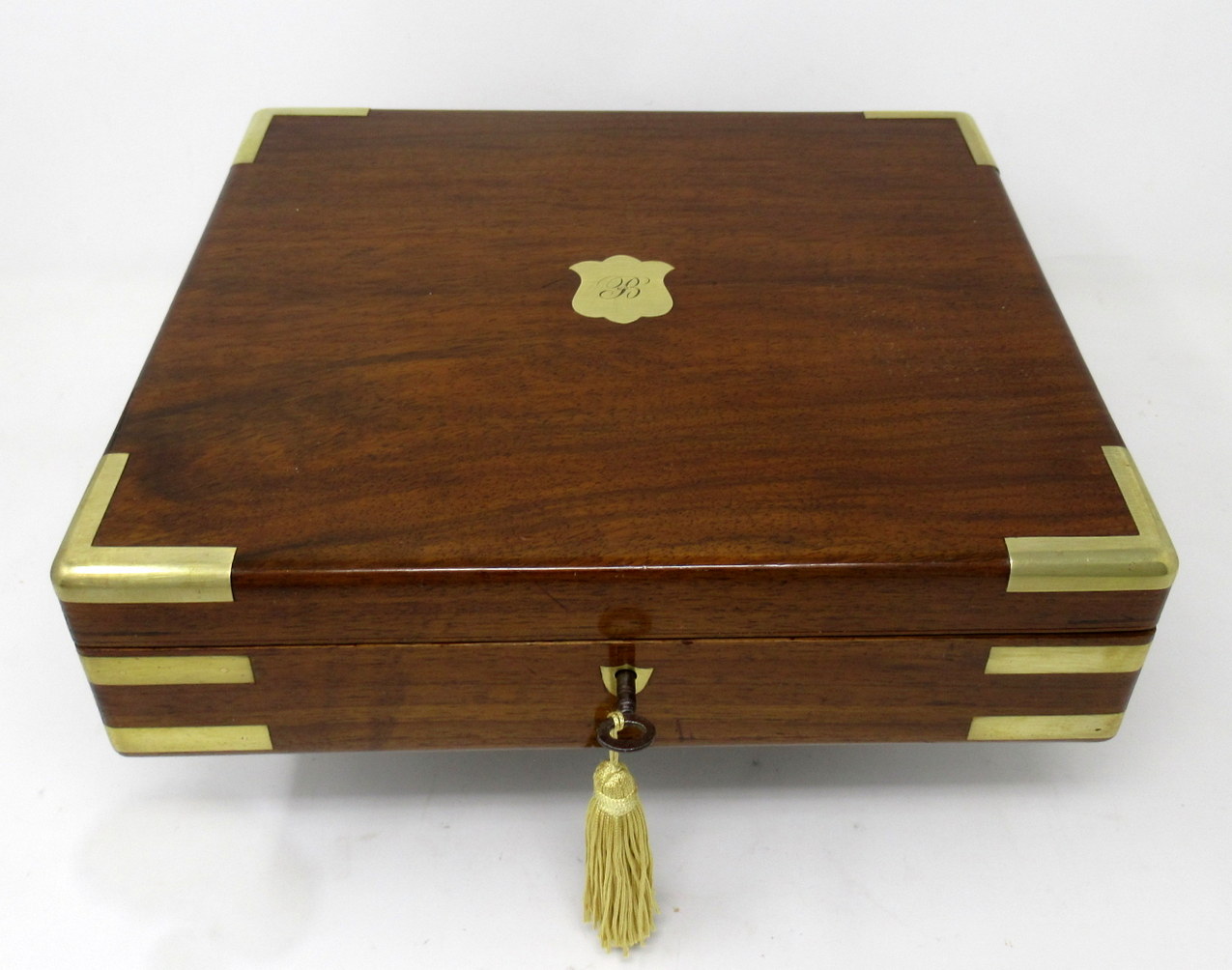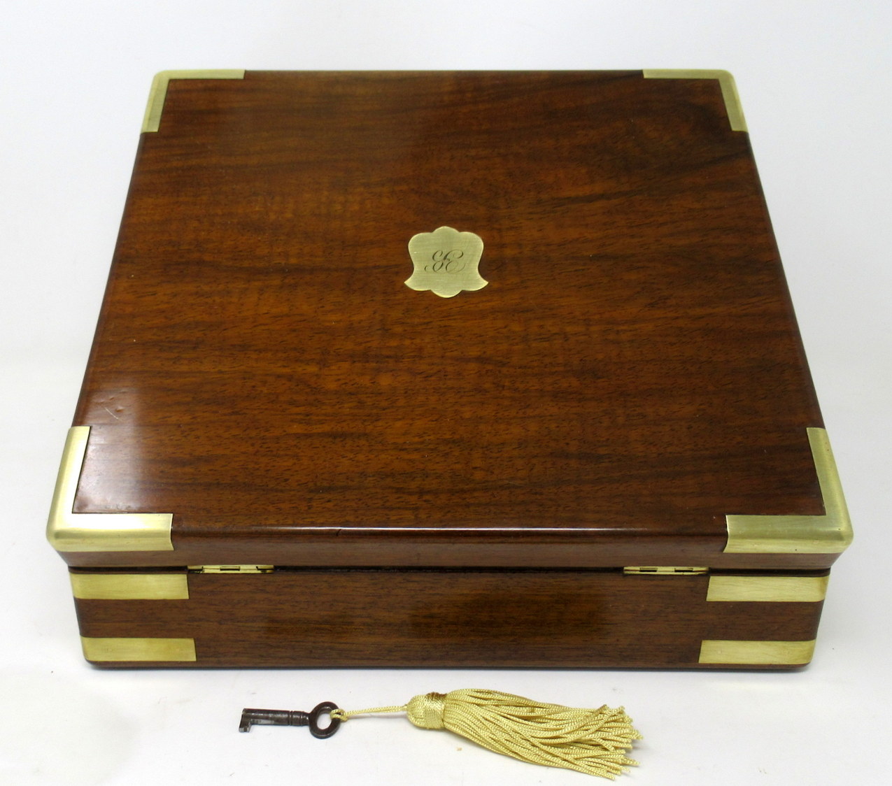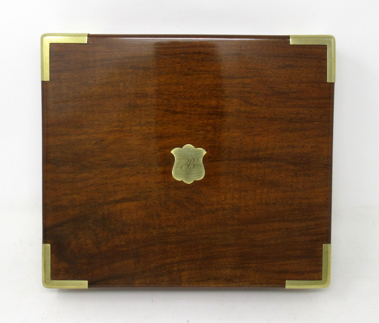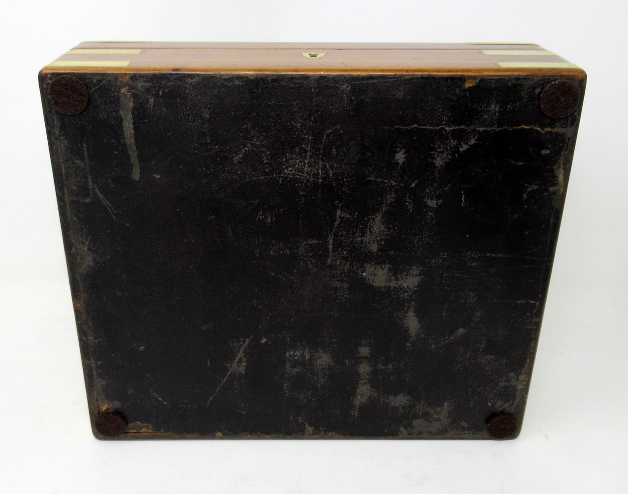 Condition: Professionally restored. Box closes firmly with no gaps. Initials on Brass Shield are FB. Lock and key are present and working well, nice original firm hinges. Lid engraved with initials FB.