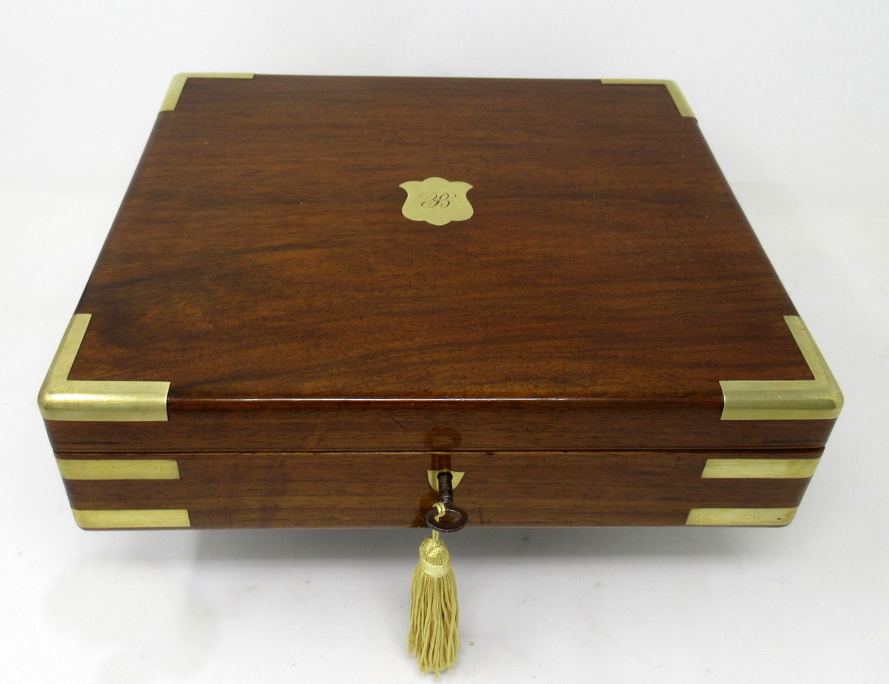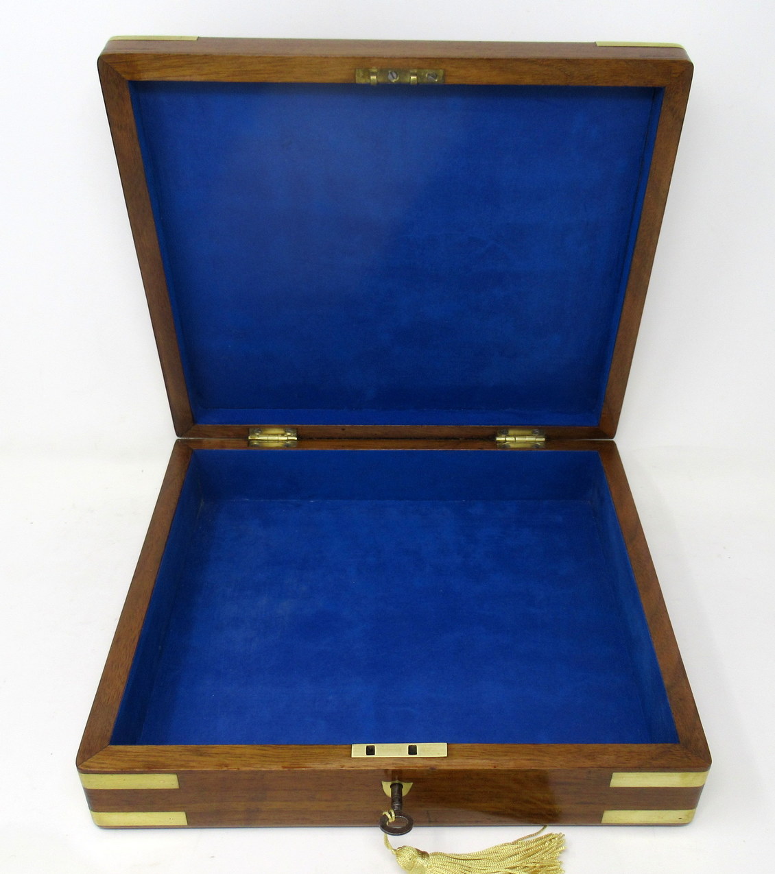 An Exceptionally Fine Quality English Well Figured Solid Mahogany Ladies or Gents Jewelry or Storage Box outstanding quality and medium proportions, with unusual moulded brass inlay decoration, flush hinges and polished brass shield form escutcheon, first half of the 19th Century, complete with later lined interior, which is very professionally done using a mid-blue heavy paper lining.