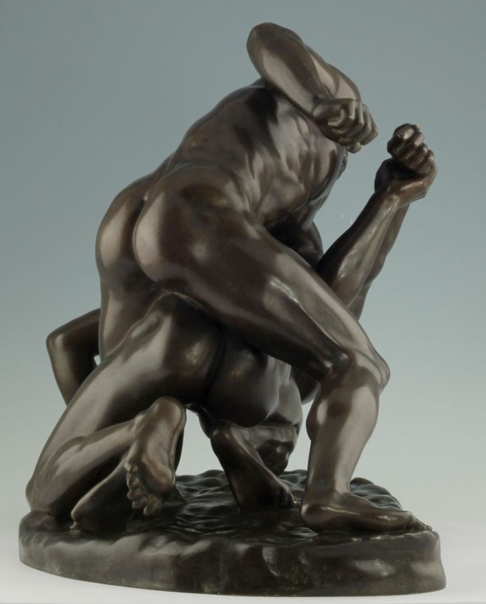 The two young male nude men are engaged in the sport called Pankration, a kind of wrestling similar to the present-day sport of "Mixed Martial Arts". The two figures are wrestling in a position now known as a "cross-body ride" in modern freestyle wrestling. The upper wrestler has his left leg entwined with his opponent’s left leg, with his body across the opponent’s body, lifting the opponent’s right arm. In a well known modern series of wrestling moves, the upper wrestler would now try to lift his opponent’s arm above his head to force a pinning move called the "Guillotine." Their muscular structure is very defined and exaggerated due to their physical and sustained effort.