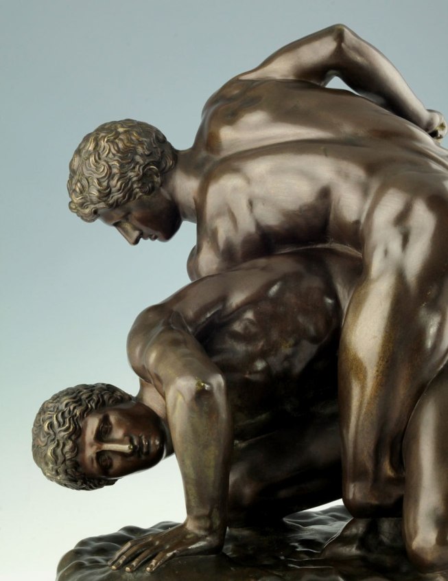 The Wrestlers also known as The Two Wrestlers, The Uffizi Wrestlers or The Pancrastinae is a famous Roman marble sculpture after a lost Greek original of the third century BCE. Discovered in 1583 near Porta S. Giovanni, Rome and the purchased by the Medici Family and is now exhibited at the Uffizi Gallery in Florence, Italy.