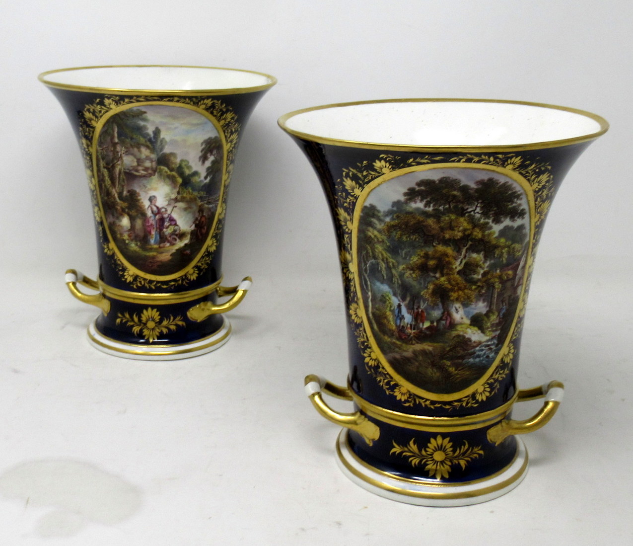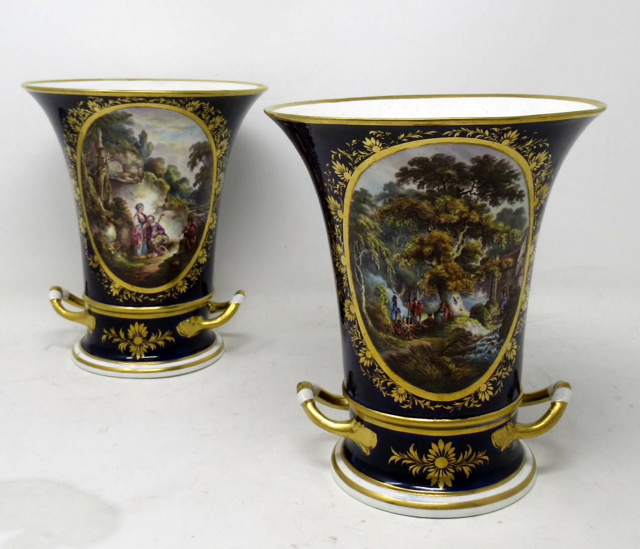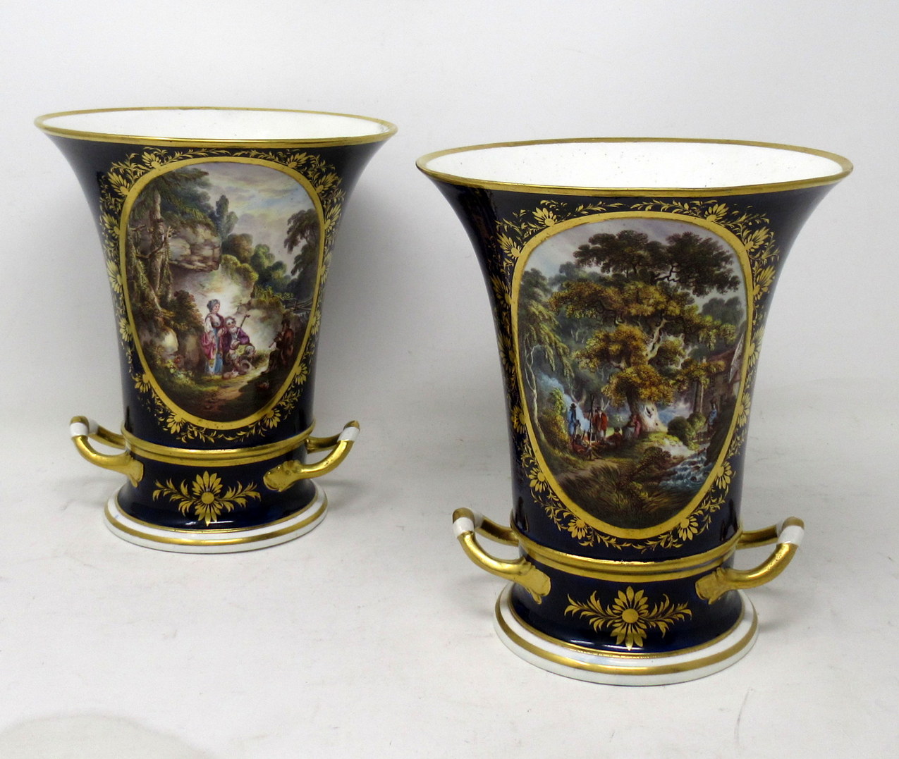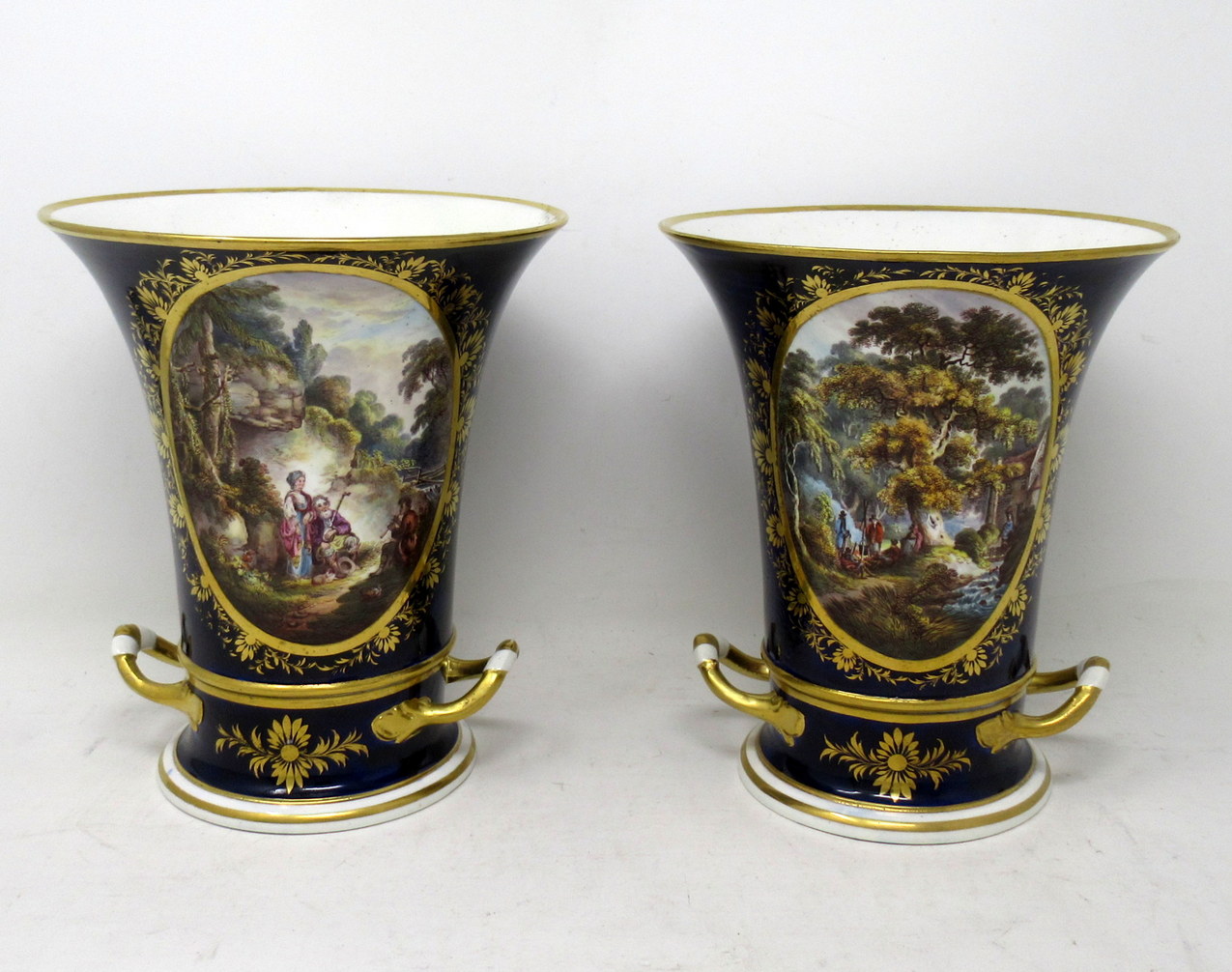 Each main central oval reserve with lavish gilt surround exquisitely hand painted depicting a pastoral Woodland scene, one depicts a romantic couple listening to a young boy playing a flute, the other with figures standing around a camp fire in a wooded landscape.
