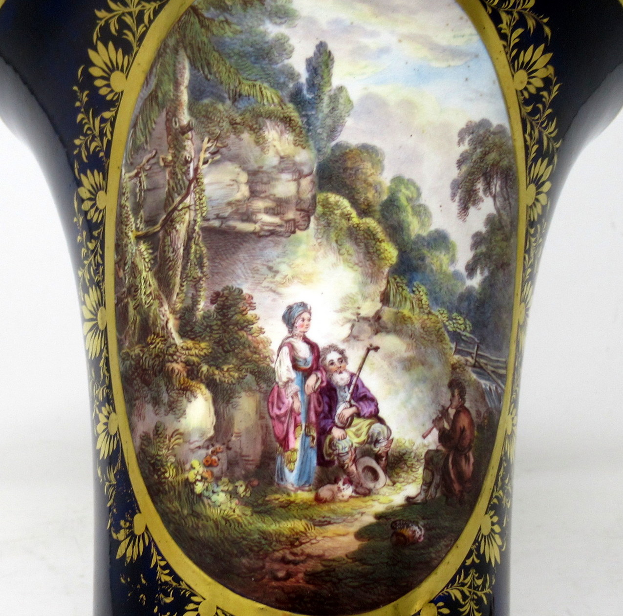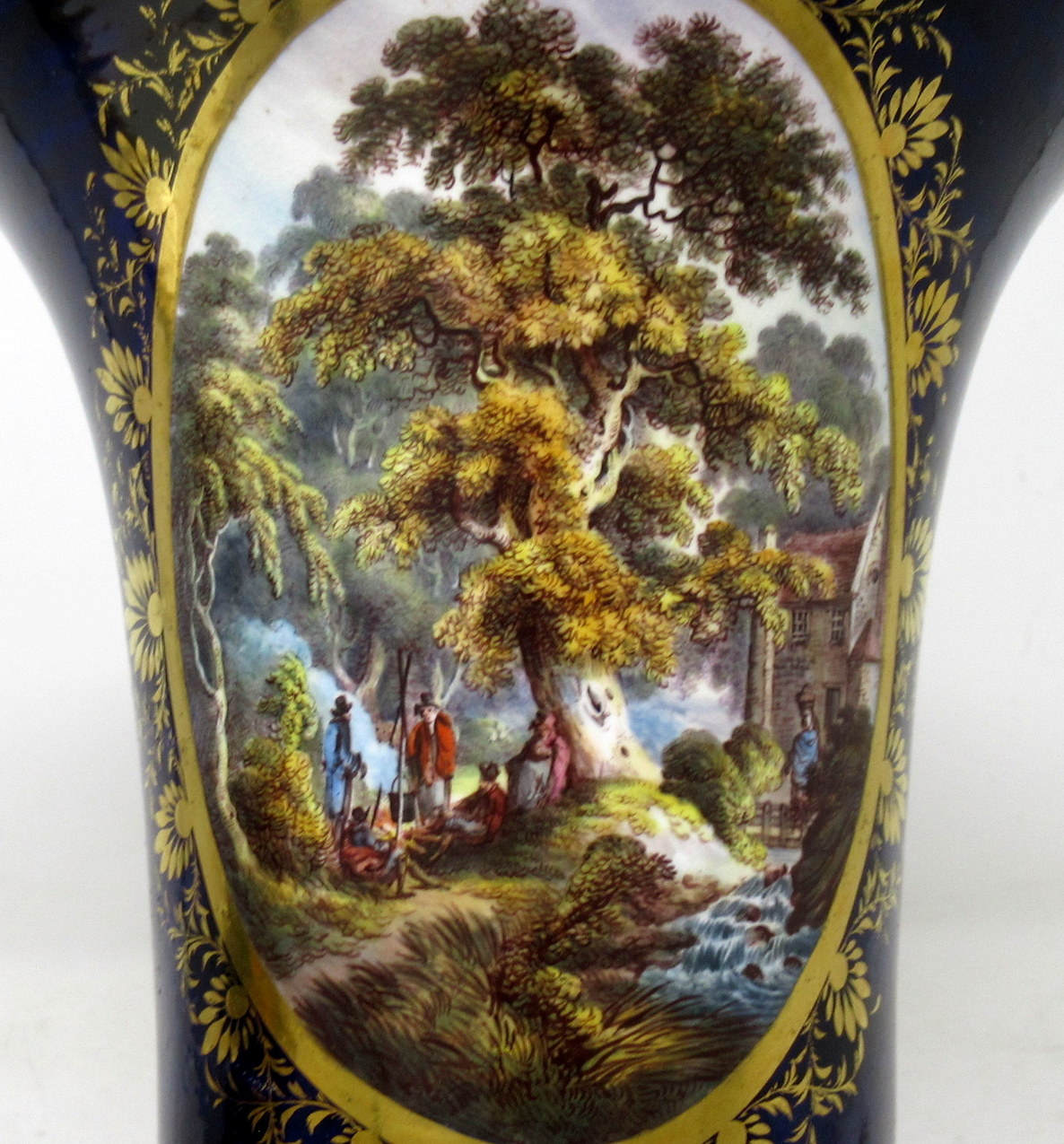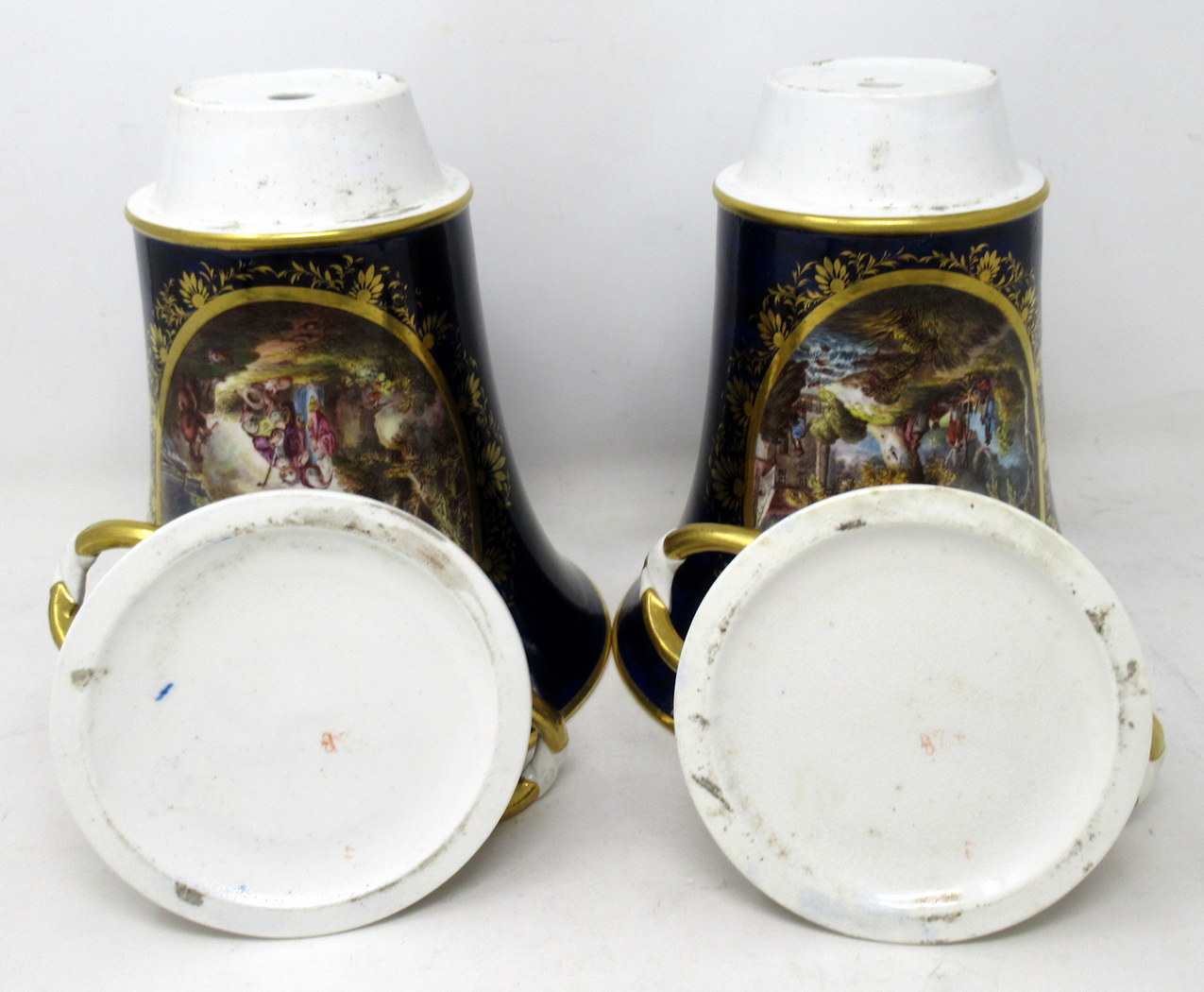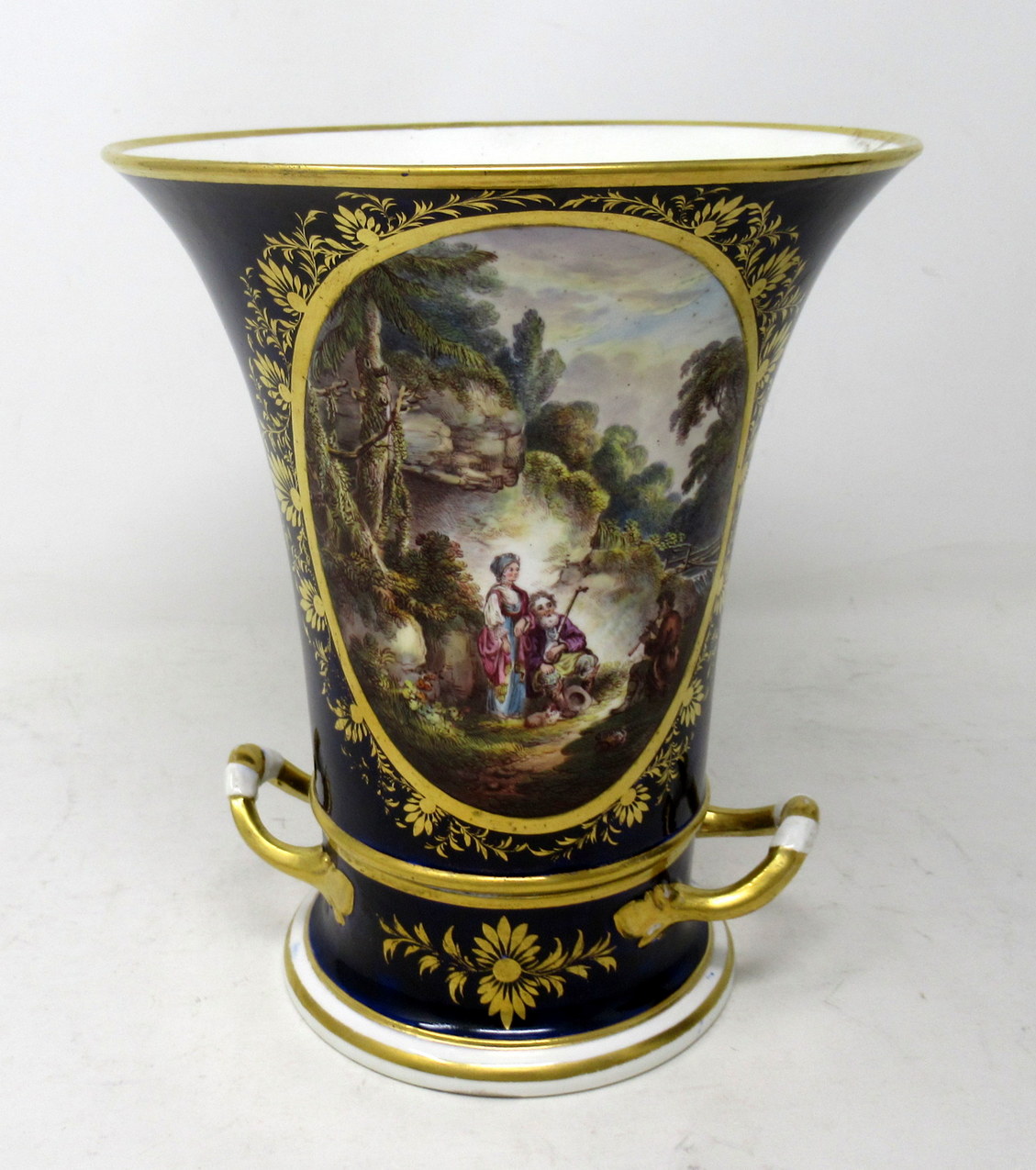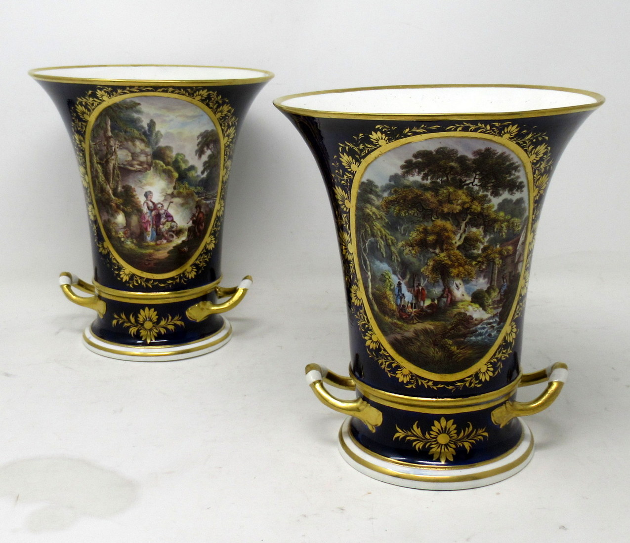 Each main central oval reserve with lavish gilt surround exquisitely hand painted depicting a pastoral Woodland scene, one depicts a romantic couple listening to a young boy playing a flute, the other with figures standing around a camp fire in a wooded landscape.