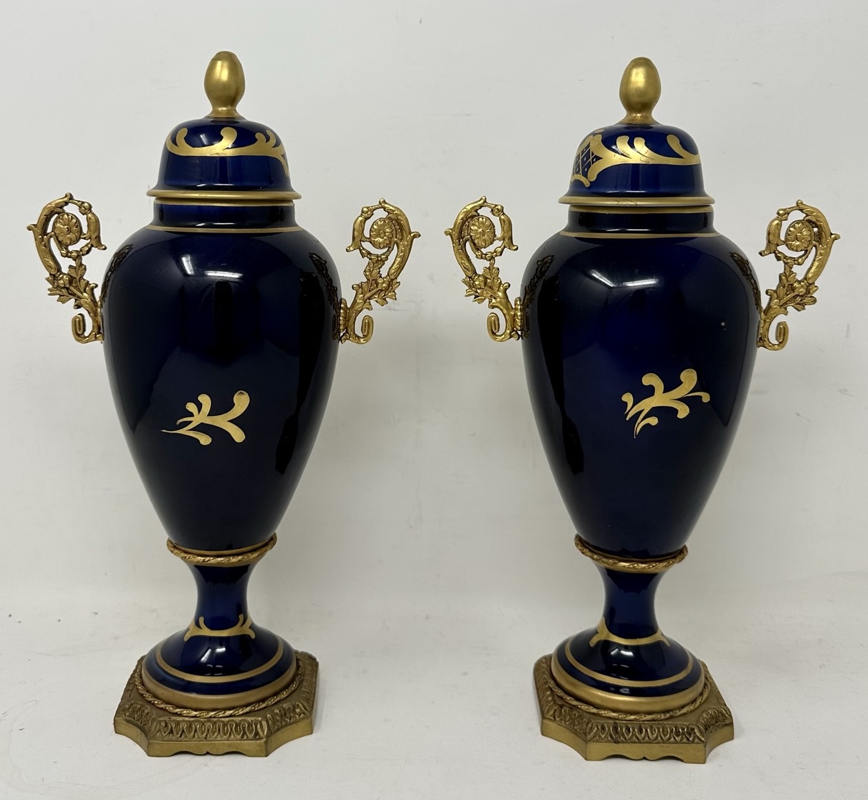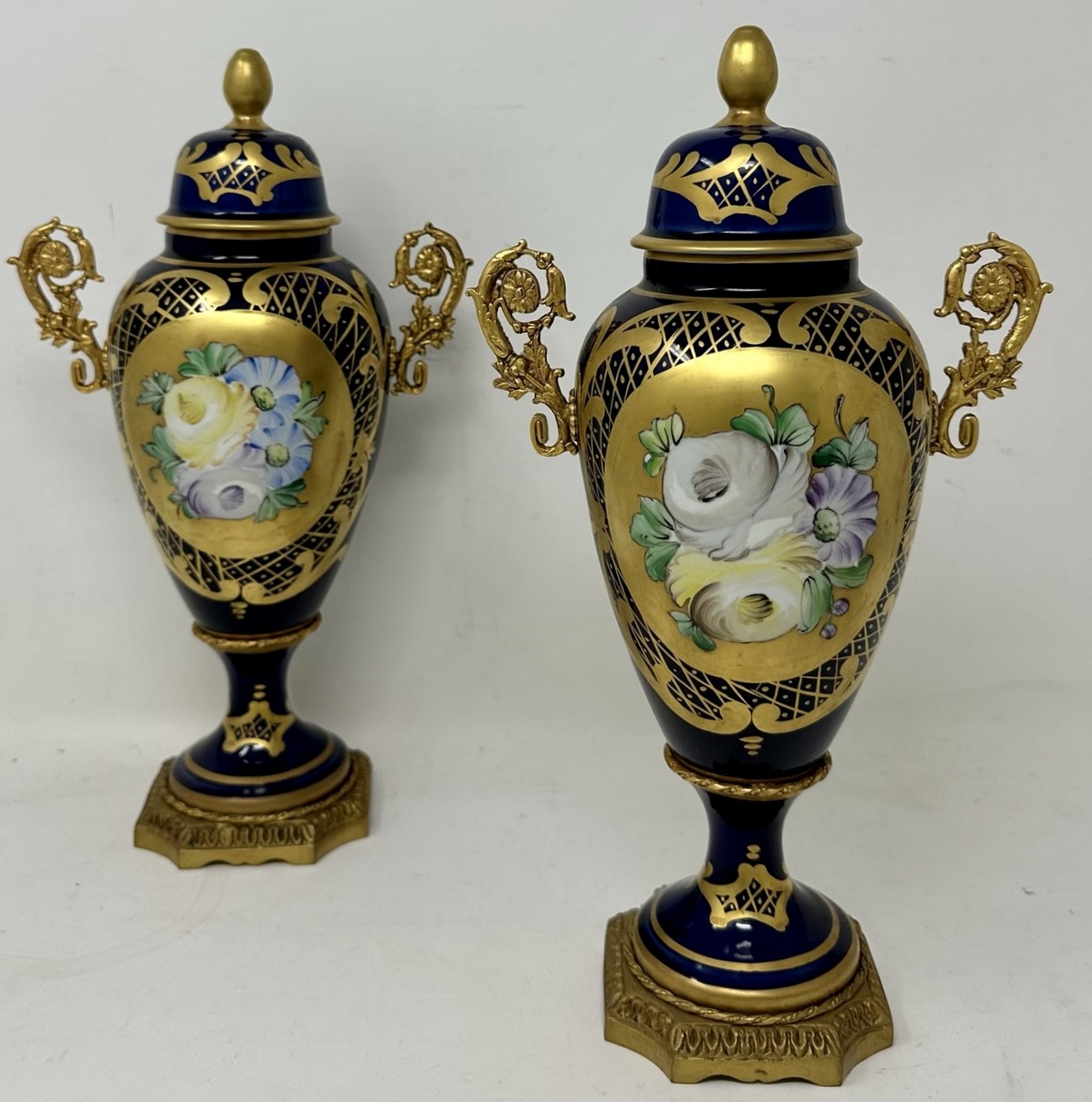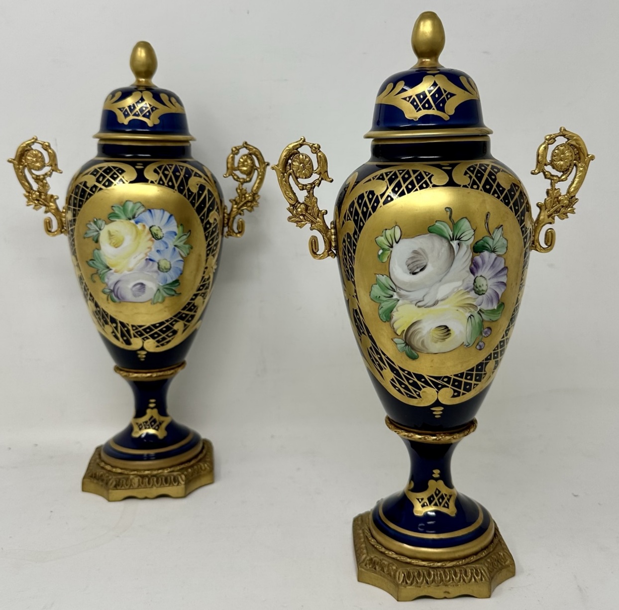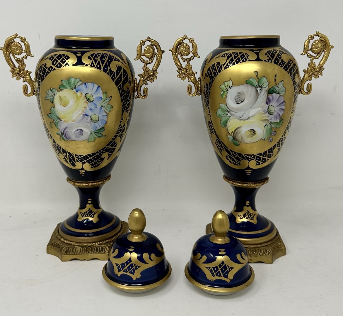 Stunning Pair of French Limoges Hard Paste Enameled Porcelain and Ormolu Twin Handle Table or Mantle Urns of traditional urn form and of outstanding quality, and good size proportions, each raised on a square stepped base with canted corners. Complete with original dome shaped covers with plain lobed finials. Late Nineteenth, early Twentieth Century.
