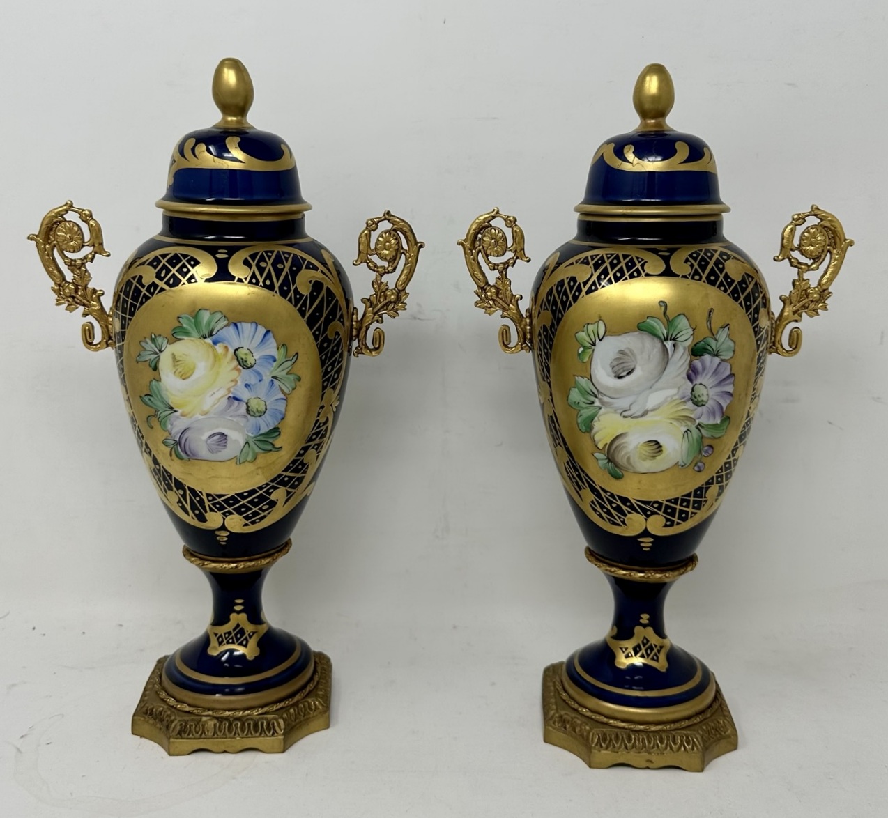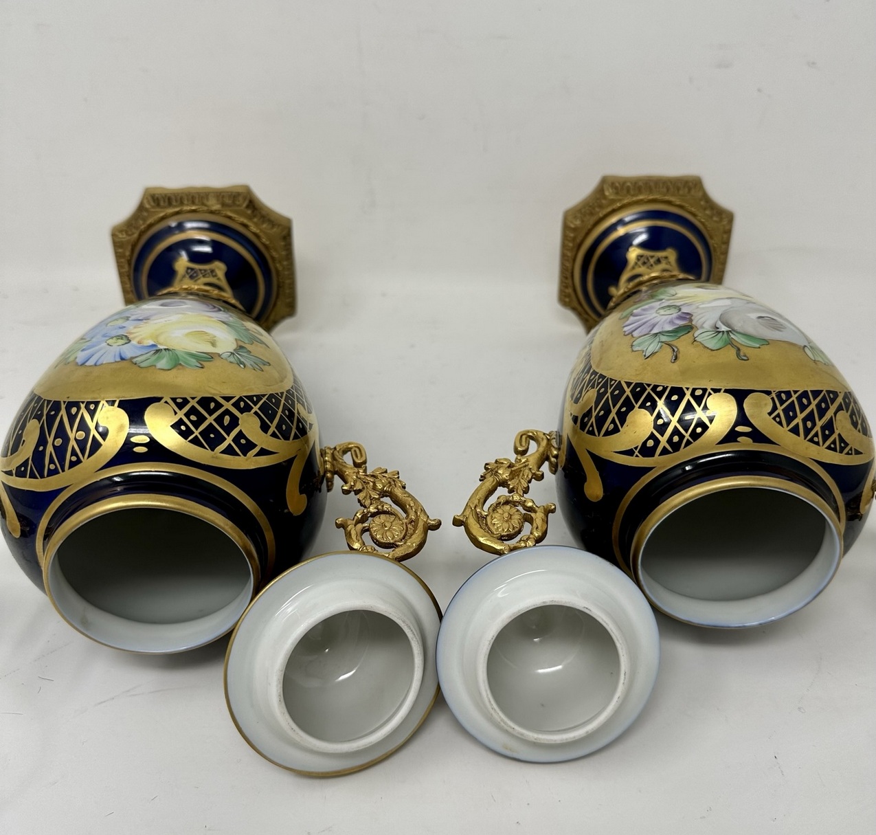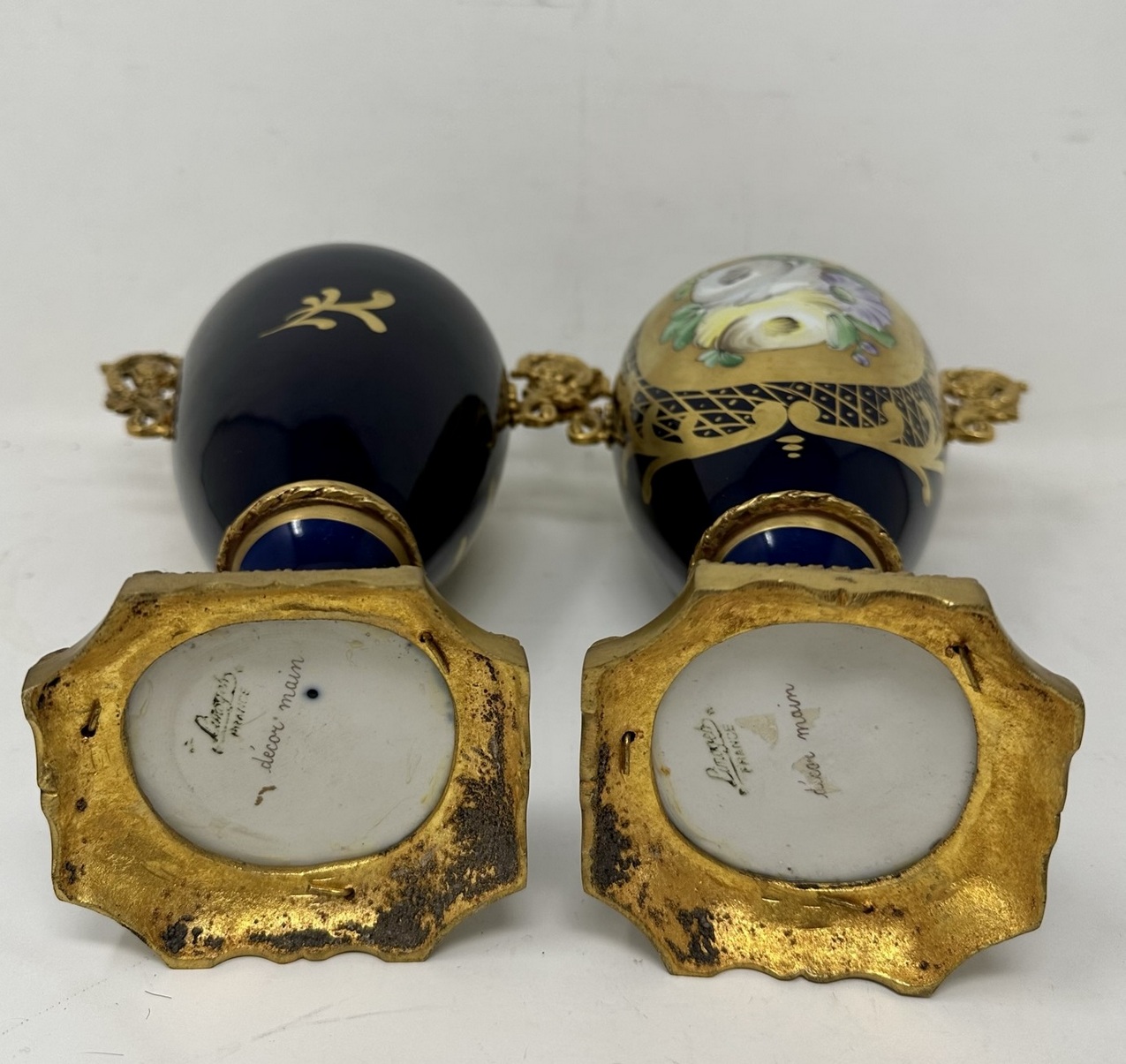 521. Antique Pair of French Limoges Porcelain Ormolu Mounted Urns Vases Centerpieces