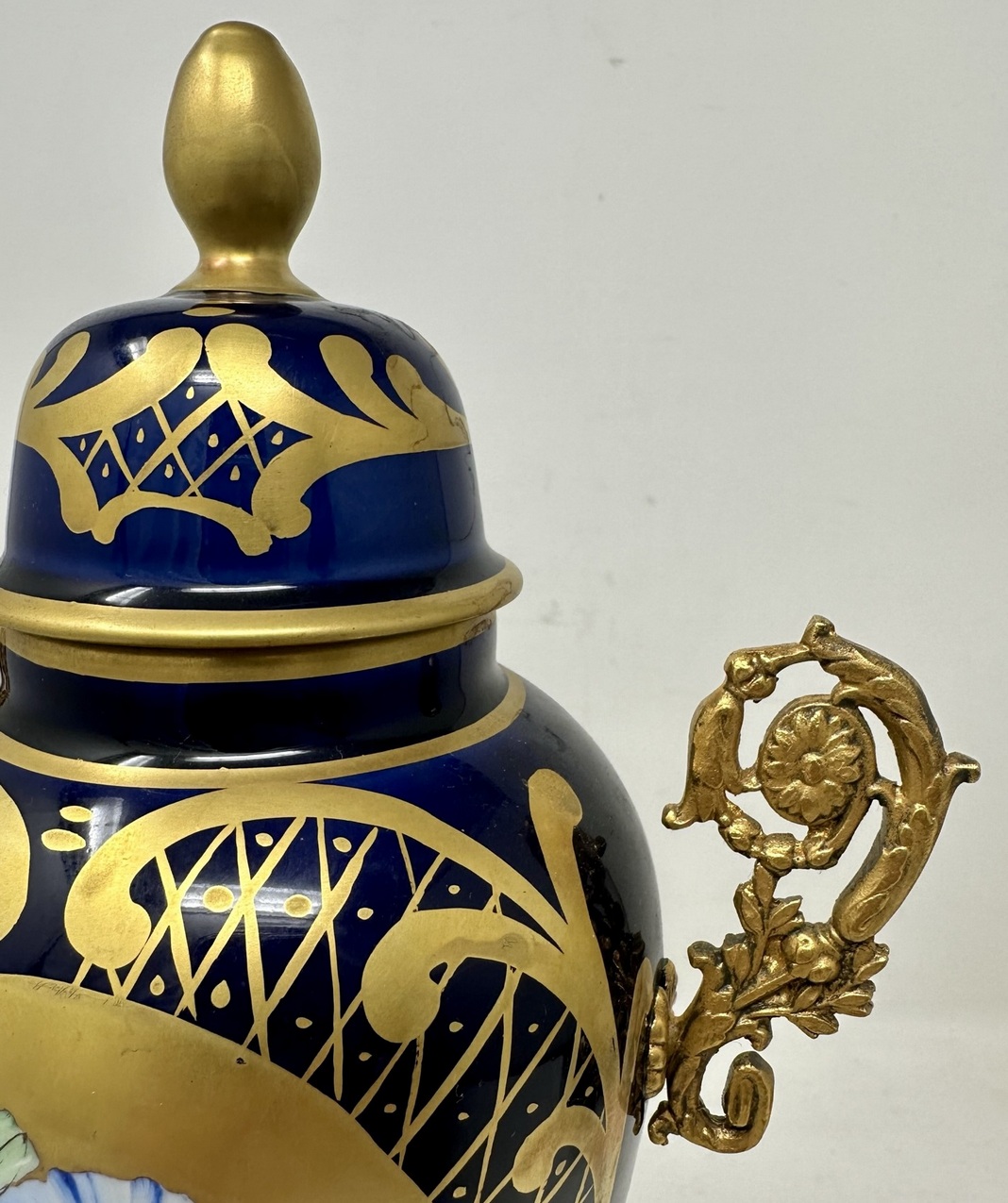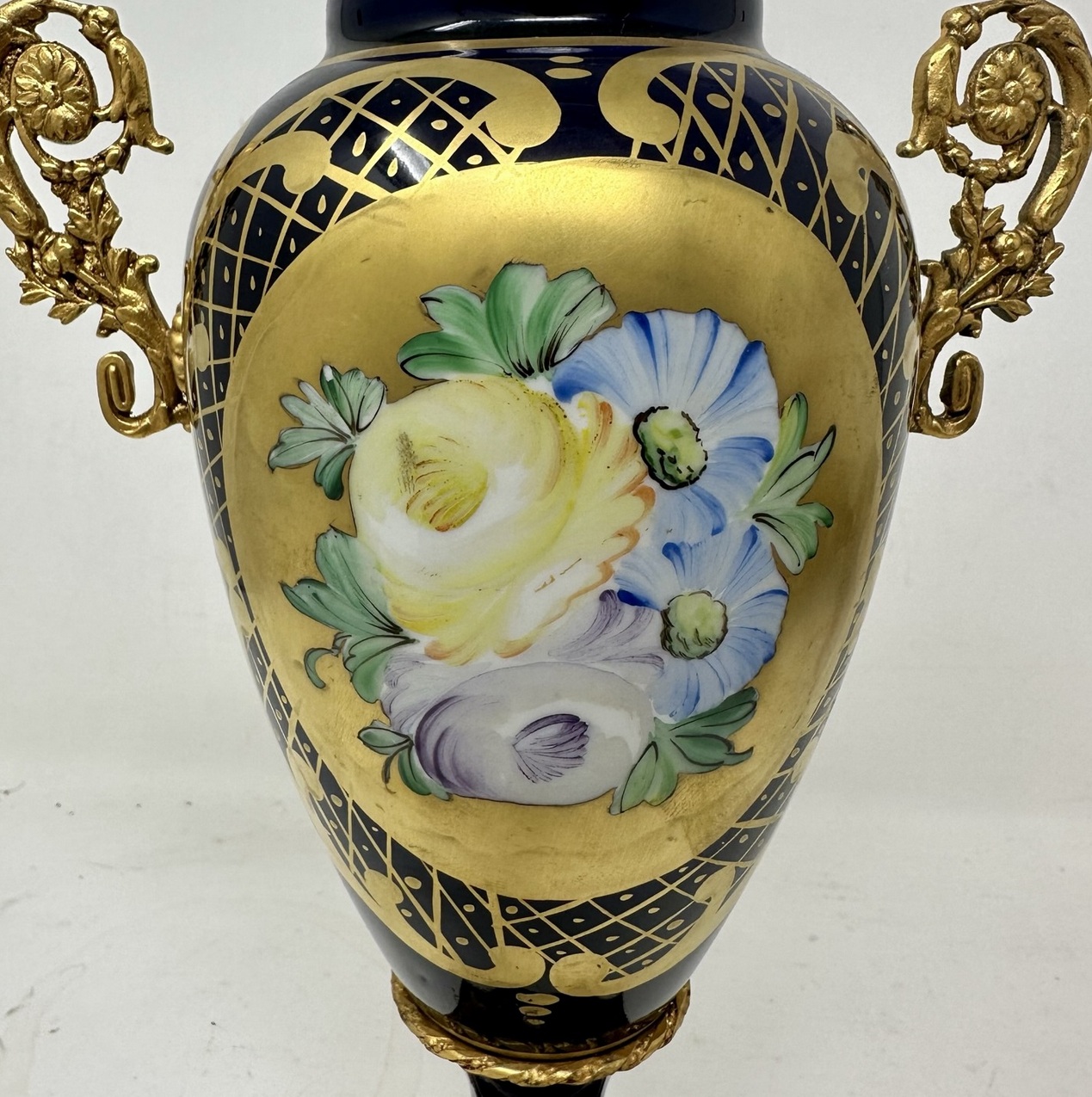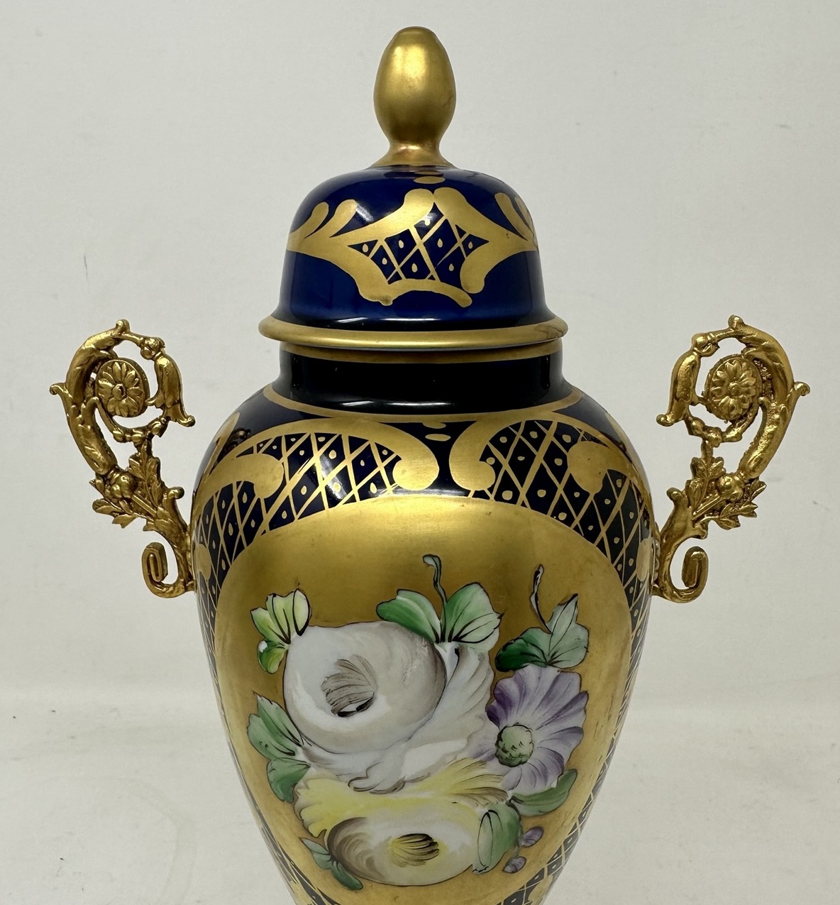 The twin handles exquisitely modelled as elegant scrolling foliage. The central front oval reserve depicting Summer Flowers with lavish gilt surround, back view as shown, see image, on a rich cobalt blue ground.