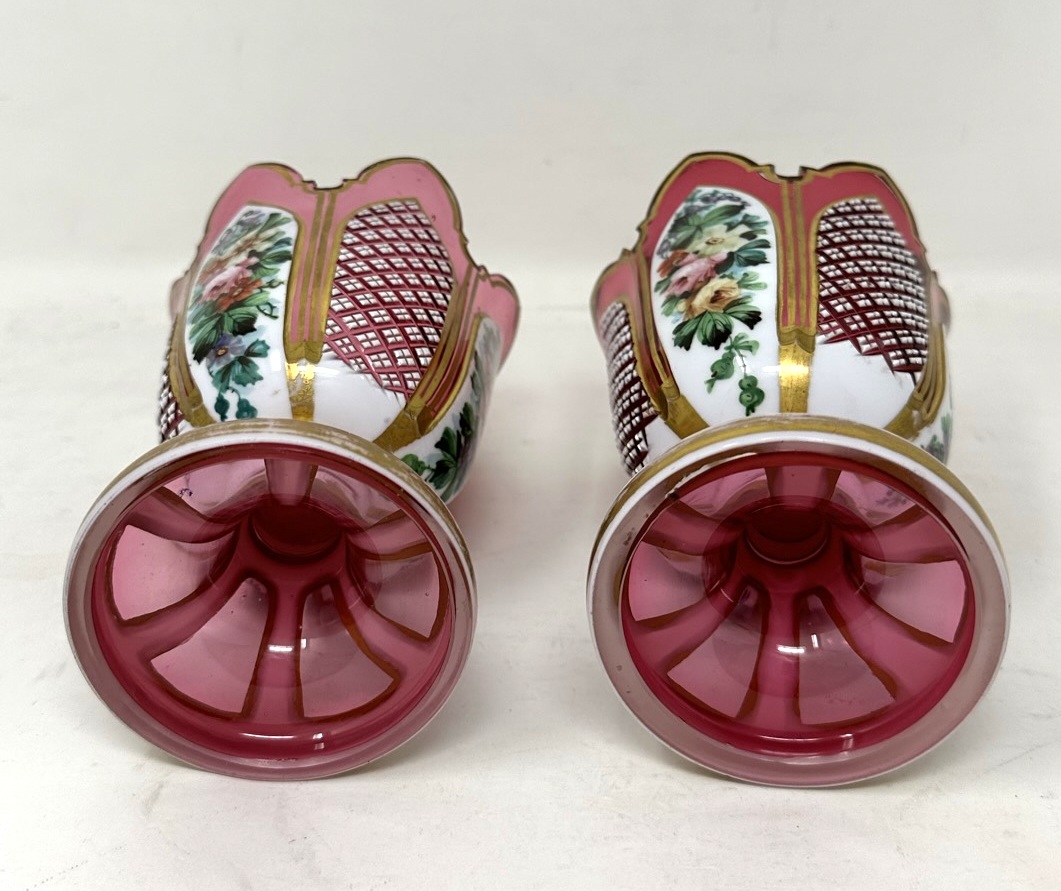 Each vase has been skillfully hand cut with six overlayed side panels, three of which have hand painted still life of summer flowers, other panels with raised diamond cut detail, all between richly gilded surrounds.