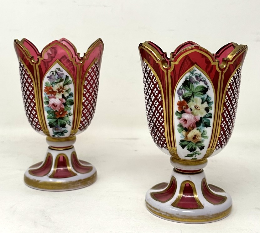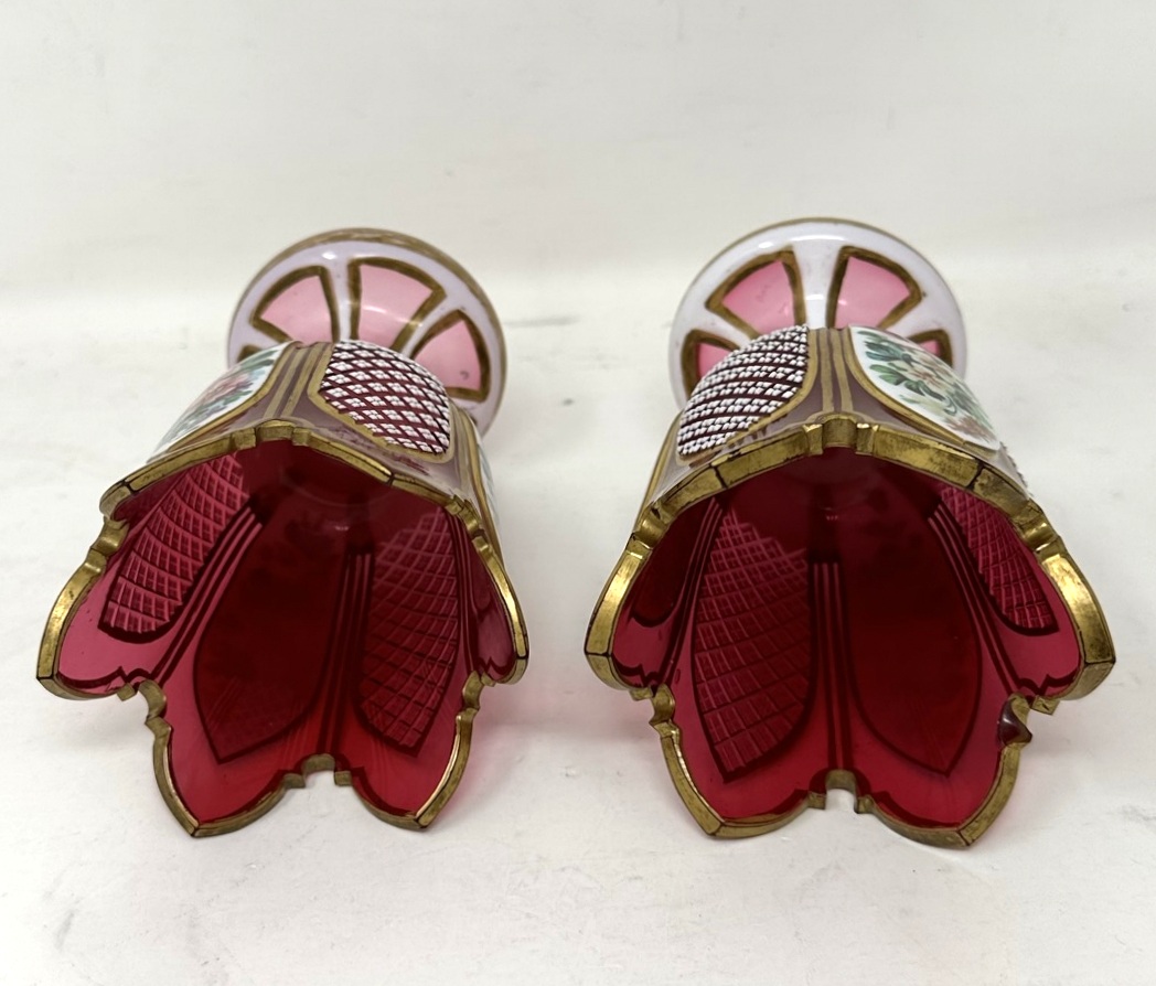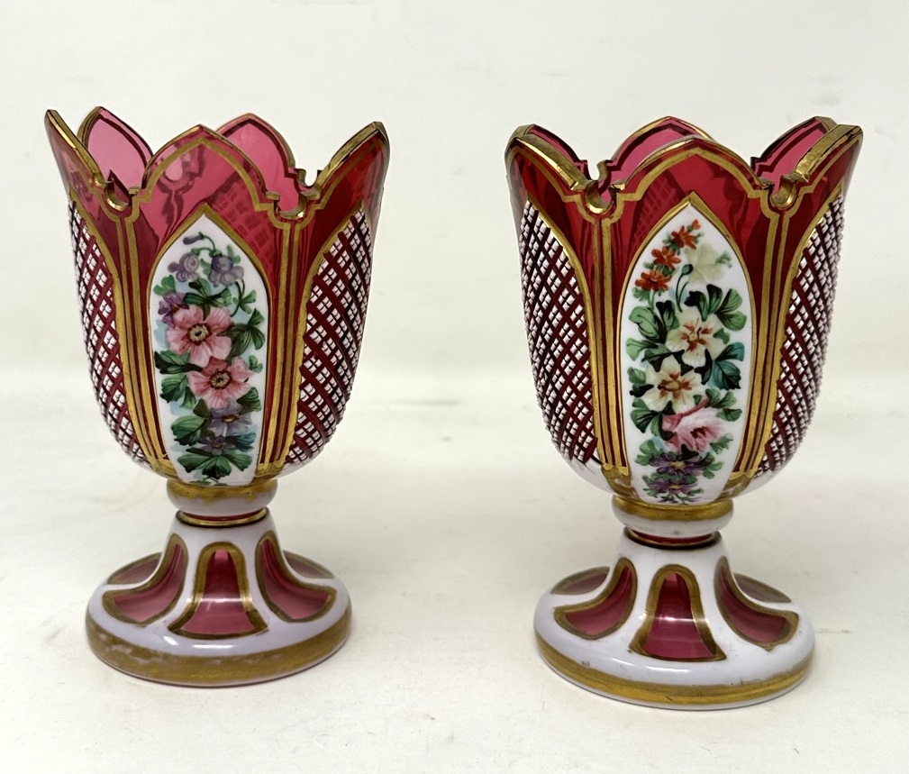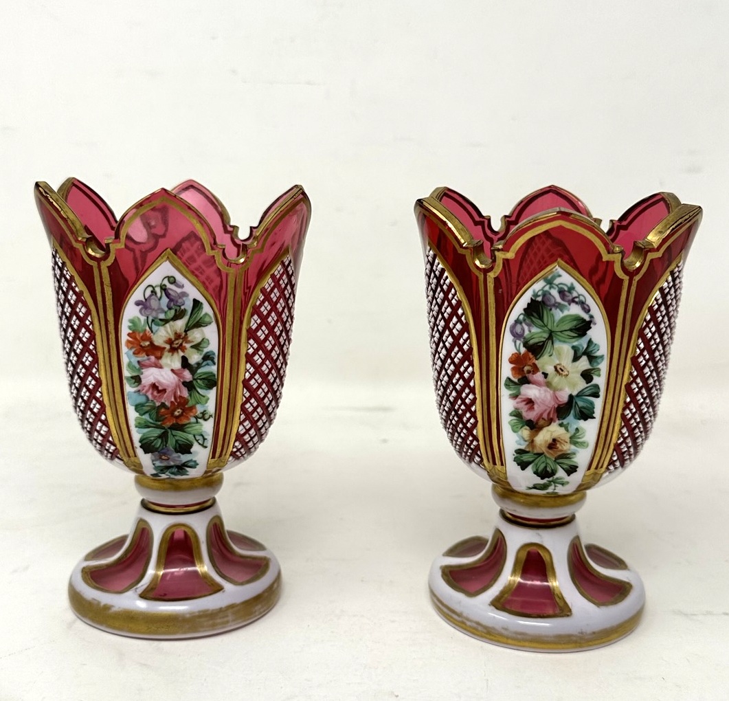 525. Antique Vintage Pair Moser Style Bohemian Hand Cut Crystal Ruby Cranberry Vases