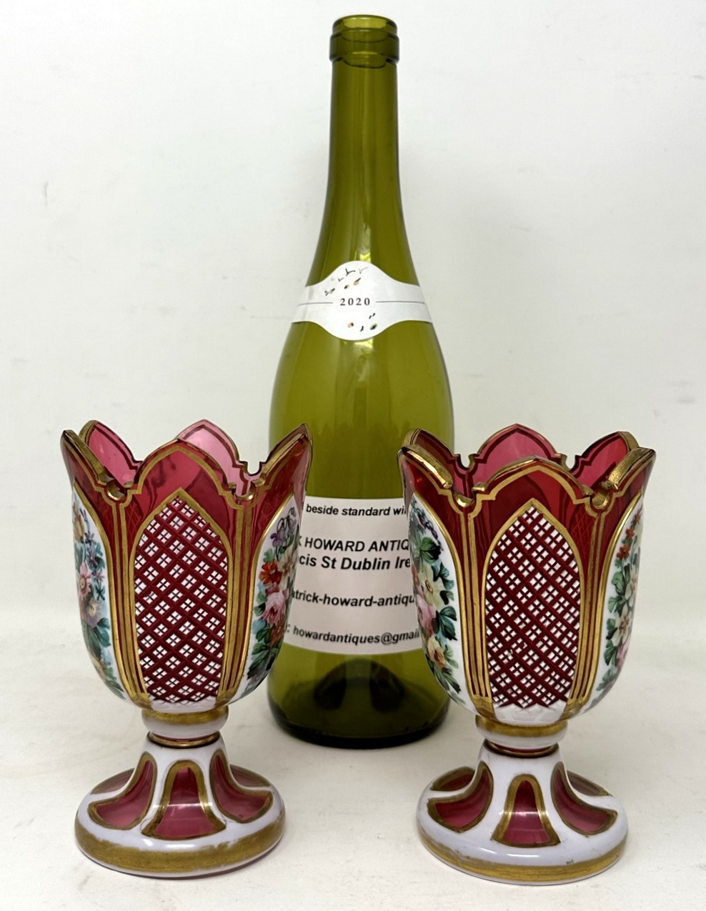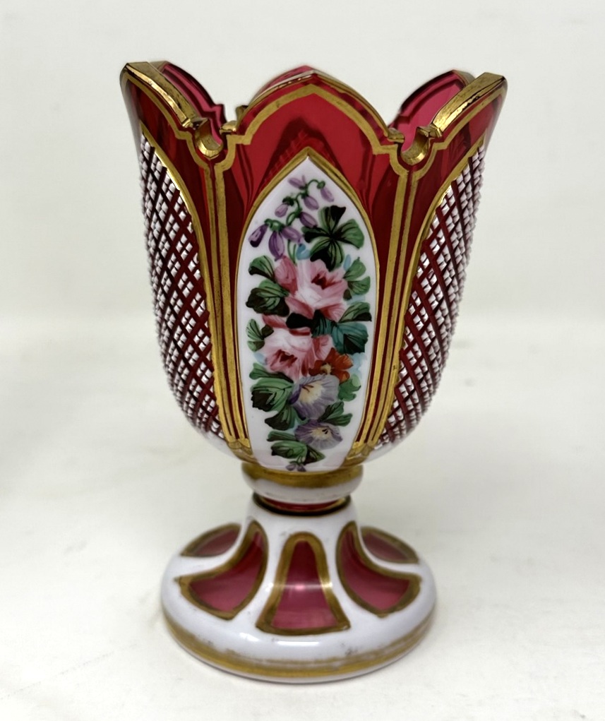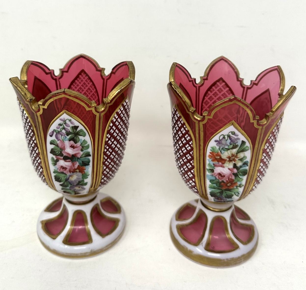 525. Antique Vintage Pair Moser Style Bohemian Hand Cut Crystal Ruby Cranberry Vases