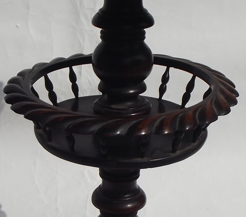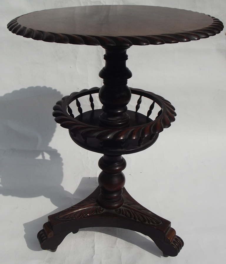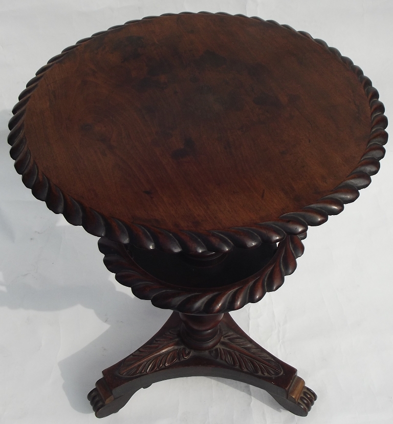 A Very Unusual William IV (1830-1837) Period Mahogany Lamp Table of medium proportions. The circular top with decorative gadrooned carved detail to edge above a central ring turned and bulbous support incorporating a very decorative and unusual gallery basket constructed with finely turned spindles and gadrooned rim all raised on a tripod base with Acanthus Leaf mouldings terminating on stepped scroll feet with original concealed metal castors.