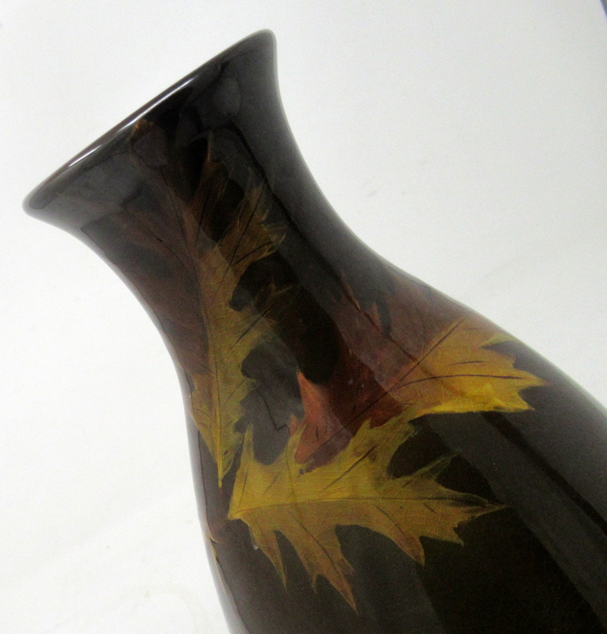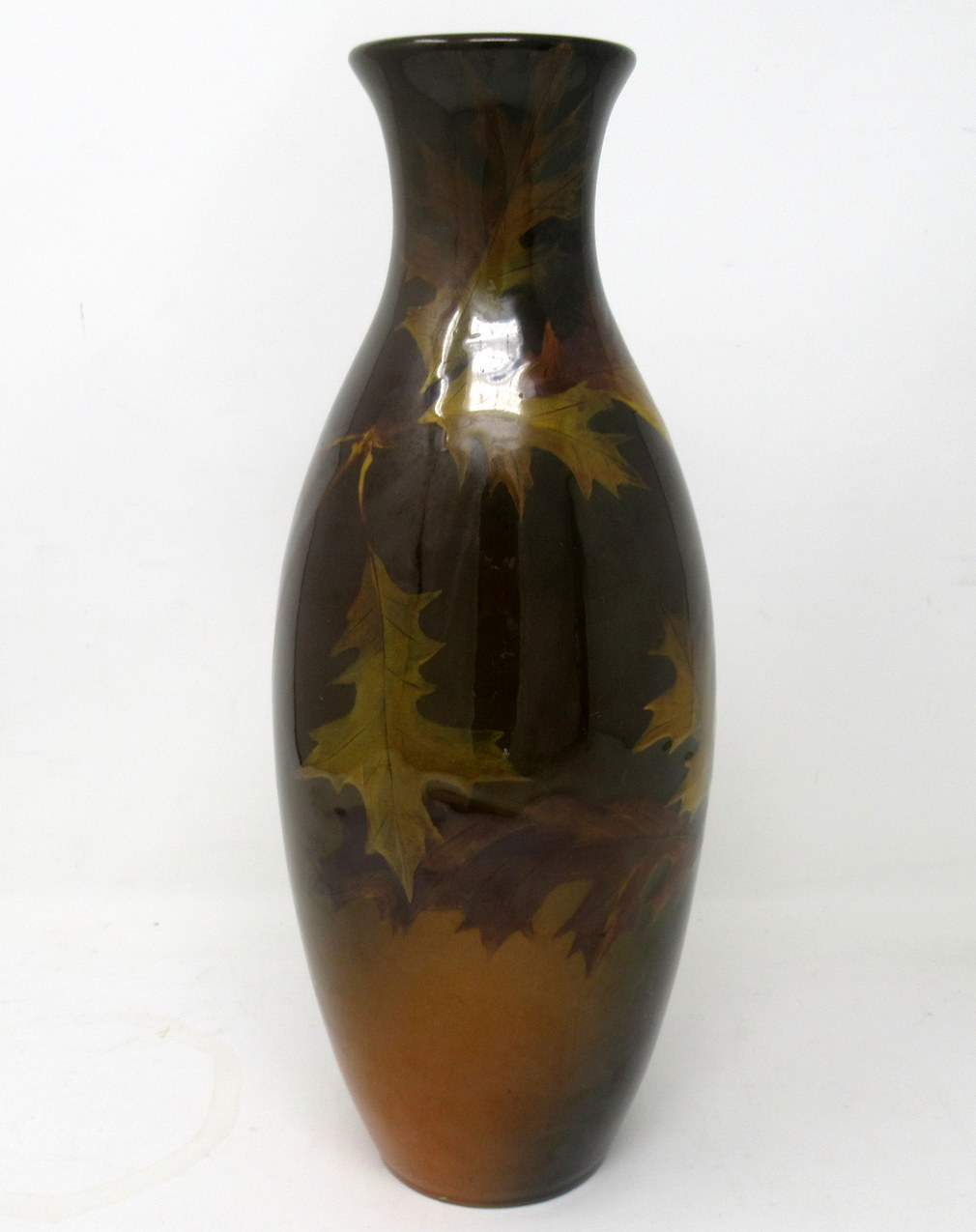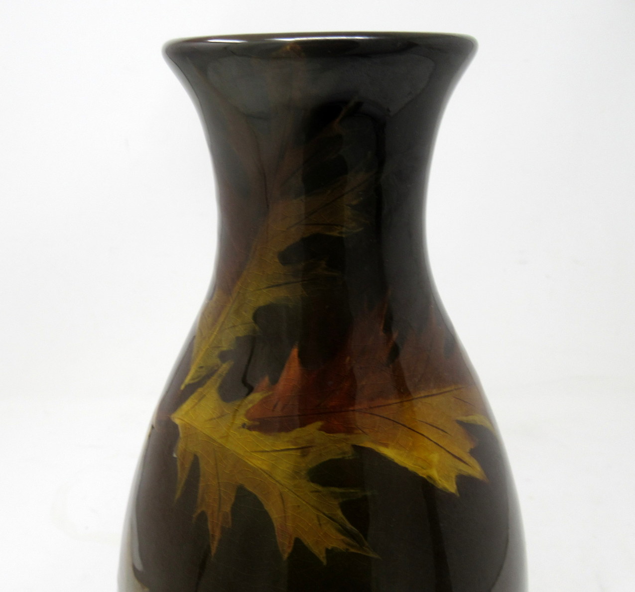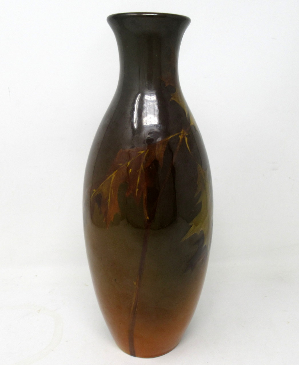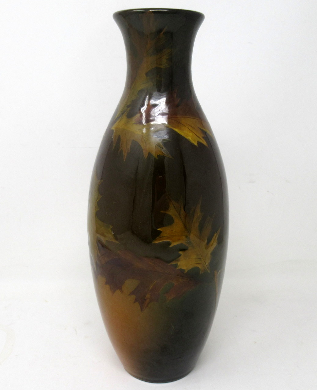 This exquisite red clay vessel is hand decorated with carved branches bearing curling Oak leaves and acorns in low relief on a rich Autumnal brown highly glazed ground. Although this piece was created in late Nineteenth Century, the rich warm palette would perfectly compliment any Arts and Crafts interior décor.