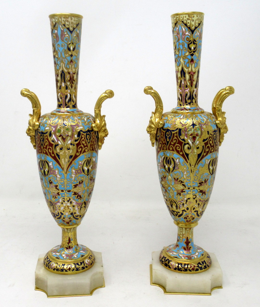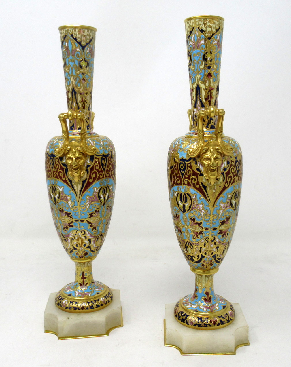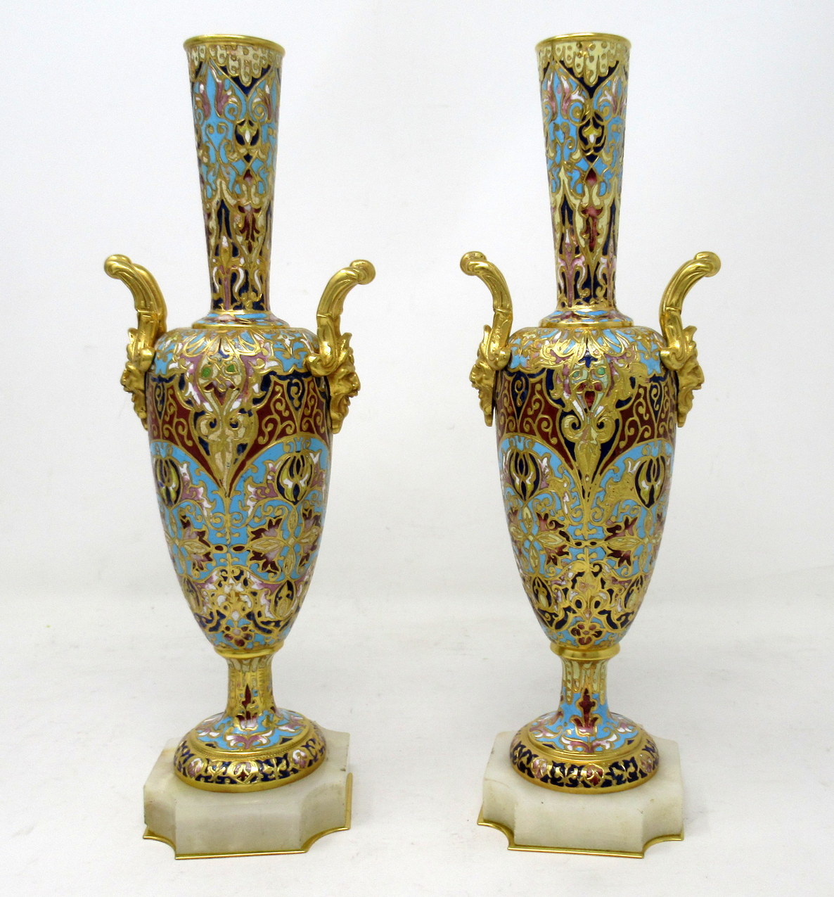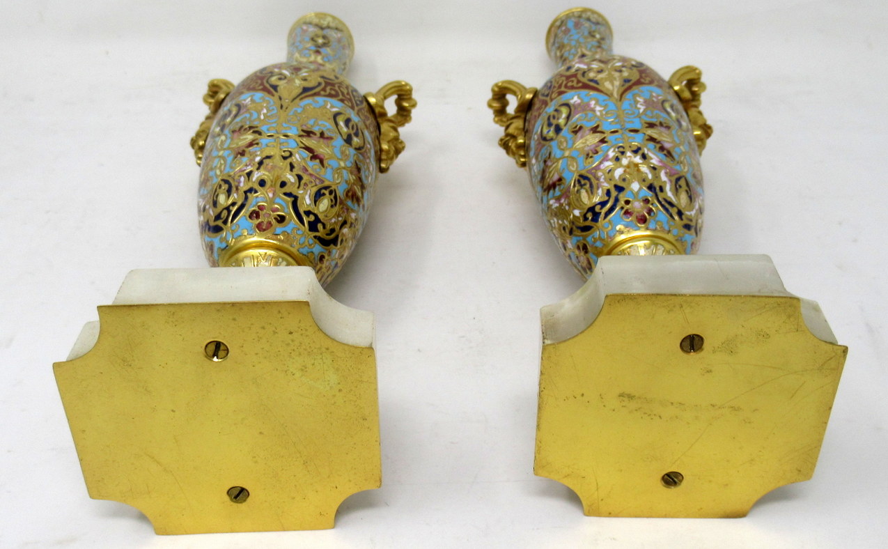 Each ovoid form body is profusely adorned with champleve enamels which is fashioned into scrolling arabesques, flowers and other geometrical motifs, all executed in colours of navy, iron red, sea green and ivory enamels. Each vase stands on a square alabaster base with canted corners and Ormolu beveled plates underneath. Gilt bronze upward handles are mounted to shoulders of each superbly cast as Satyrs