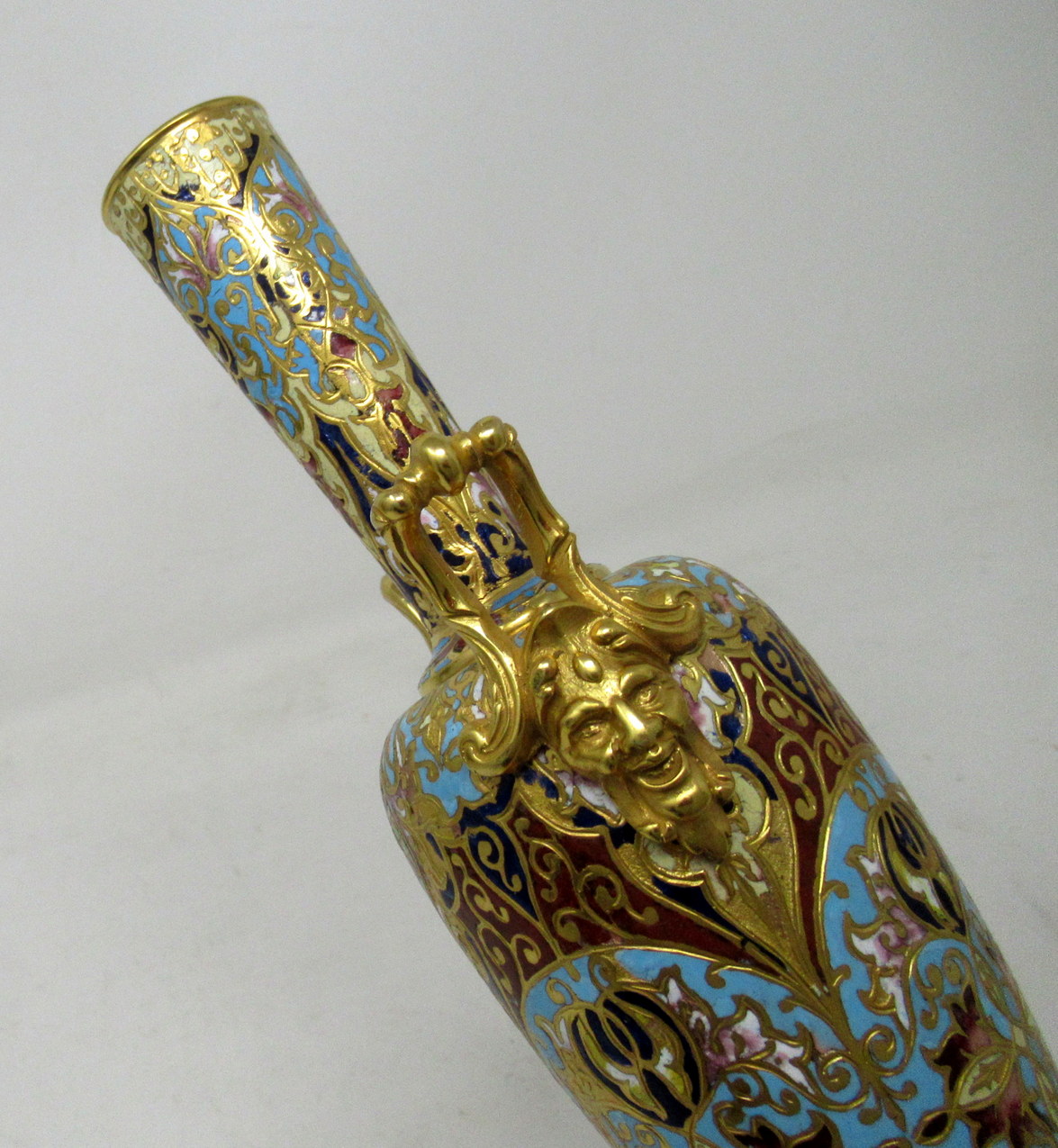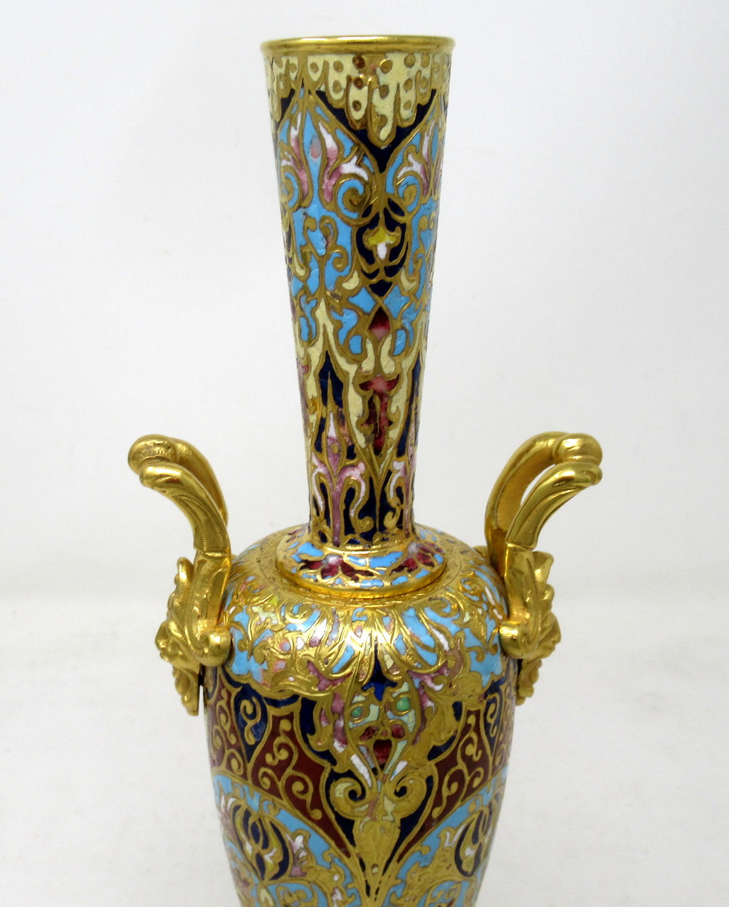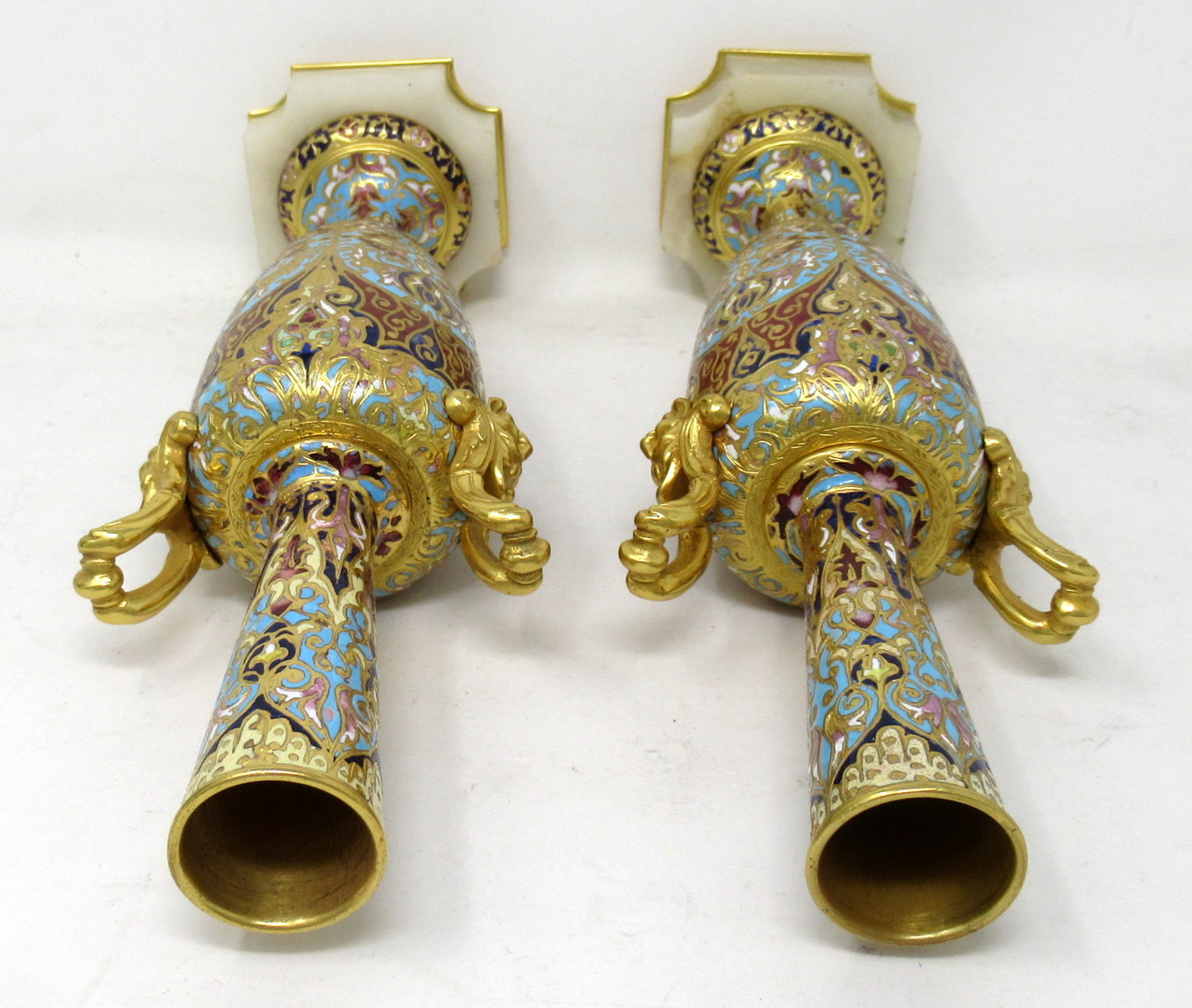Each ovoid form body is profusely adorned with champleve enamels which is fashioned into scrolling arabesques, flowers and other geometrical motifs, all executed in colours of navy, iron red, sea green and ivory enamels. Each vase stands on a square alabaster base with canted corners and Ormolu beveled plates underneath. Gilt bronze upward handles are mounted to shoulders of each superbly cast as Satyrs