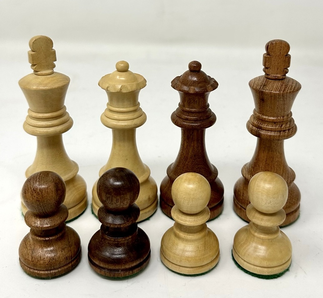 A Very Substantial Decorative French Polished Well Grained Dark Mahogany and Boxwood Folding Chess Set of outstanding quality, good weight and seldom offered generous proportions (20" square) complete with its original Jacques Type Staunton pattern Boxwood and light Mahogany Chess pieces of generous weight, late Twentieth Century.