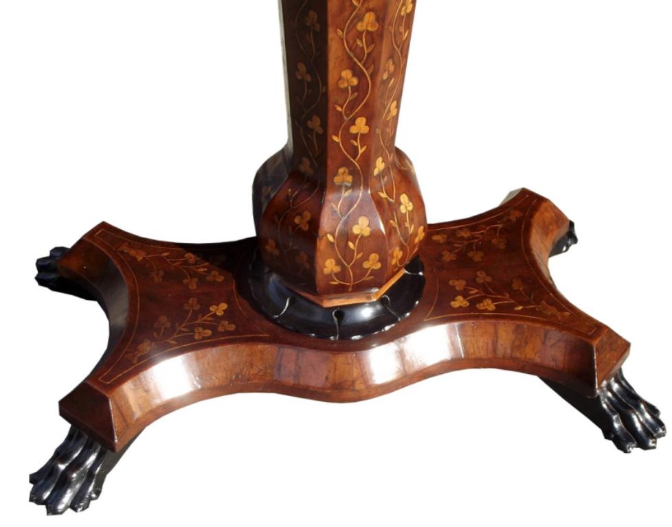 Inlaid overall with scrolling flowers and foliage, the central reserve of the hinged lid inlaid with an attractive star bust inlay design surrounded by trailing shamrocks and flowers, above a central octagonal pod with similar inlays over an incurved quadripartite base with four scroling feet on original castors.