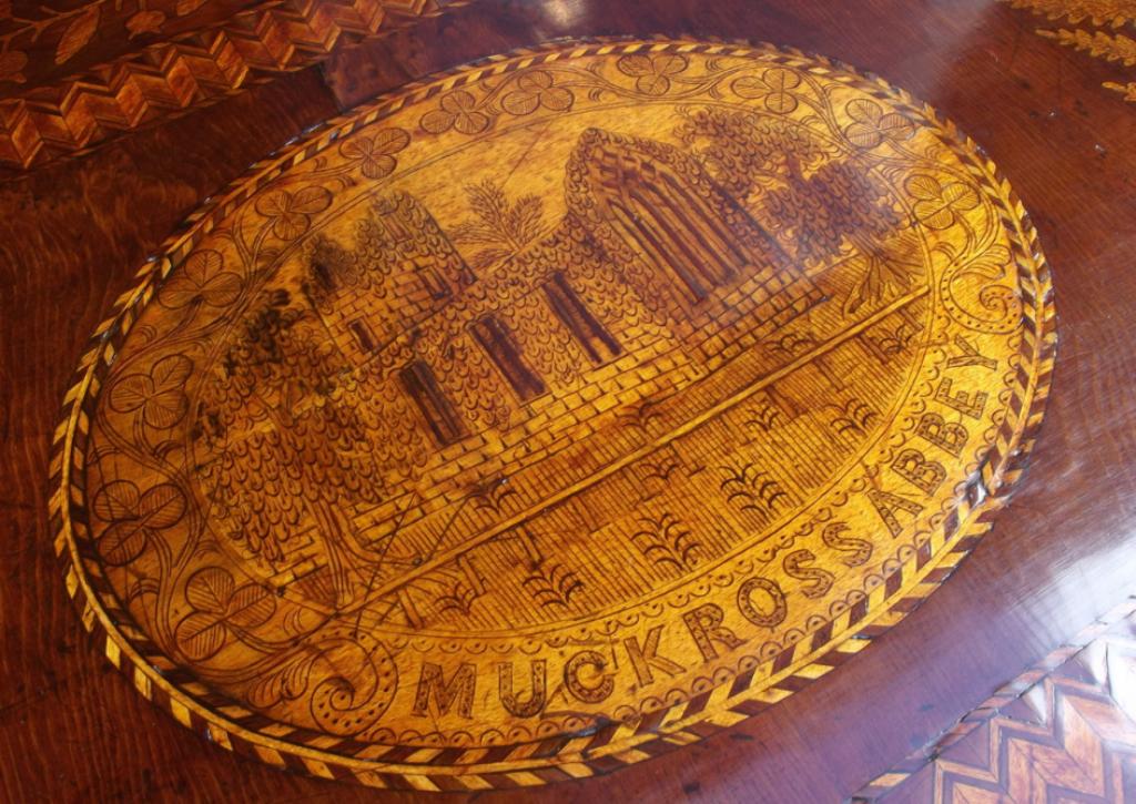 Arbutus is one of the main timbers used in Killarney marquetry, versatile in the effect created by the use of its veneers with the root, trunk and branches. Other local timbers were used, for example holly, sycamore, laburnum, maple and yew. The scenes of local tourist spots were based on engravings in guidebooks and topographical works of the area and the animals and plants applied were those seen whilst touring the countryside.