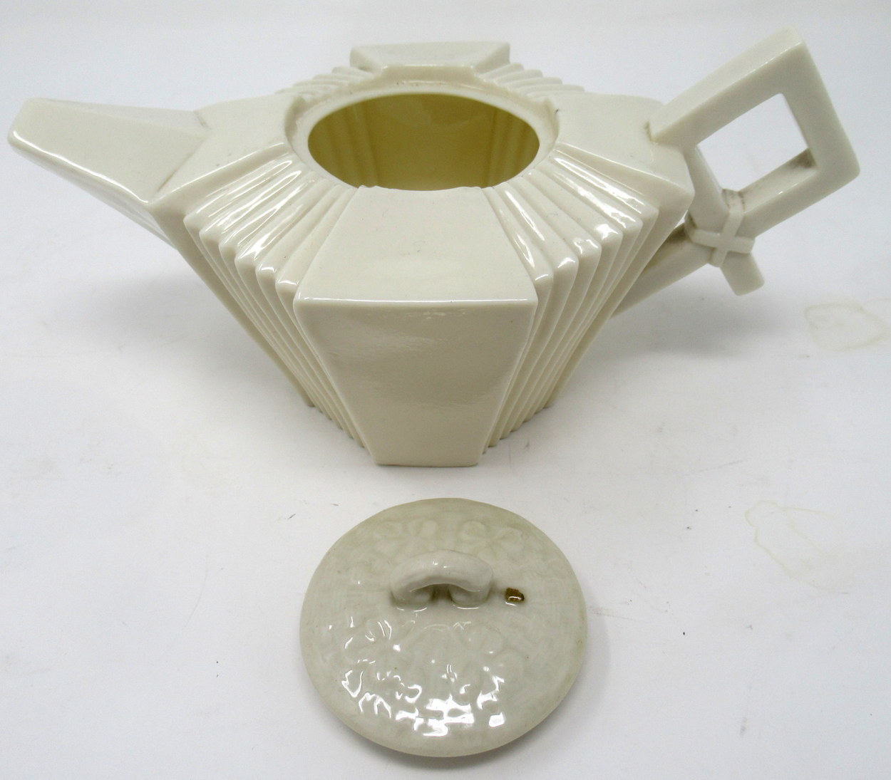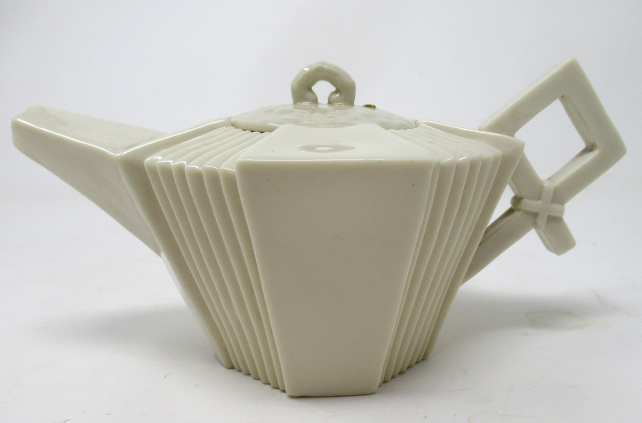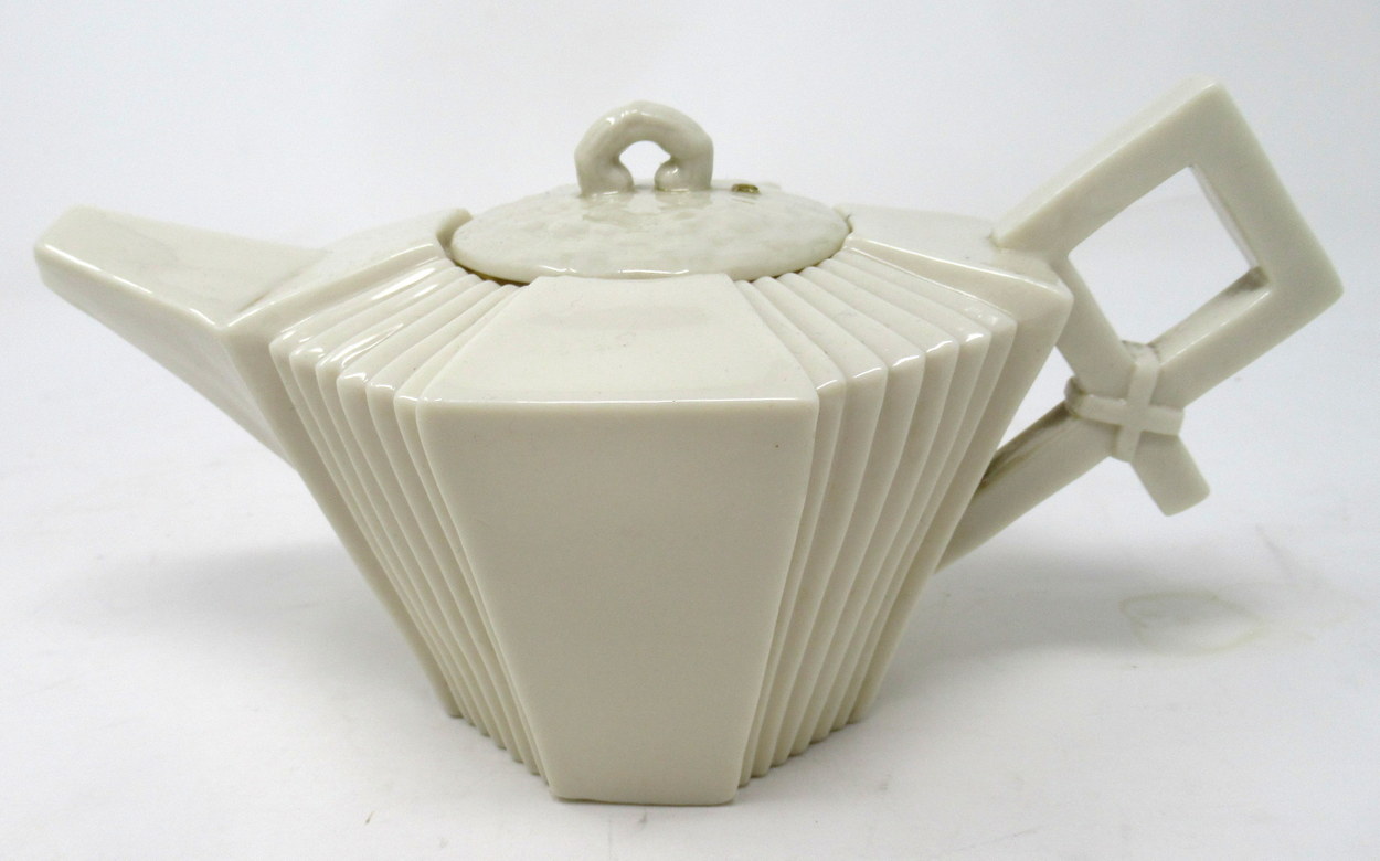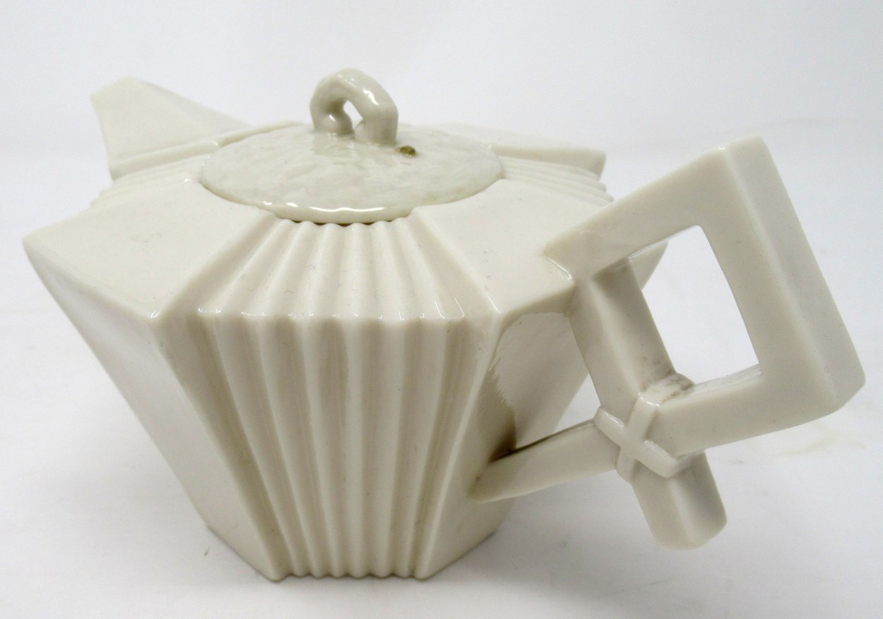 Early Irish Belleek Porcelain Art Deco Period Tea Pot of Octagon Form with alternating panels of plain and reeded detail, complete with original firm fitting circular cover.
