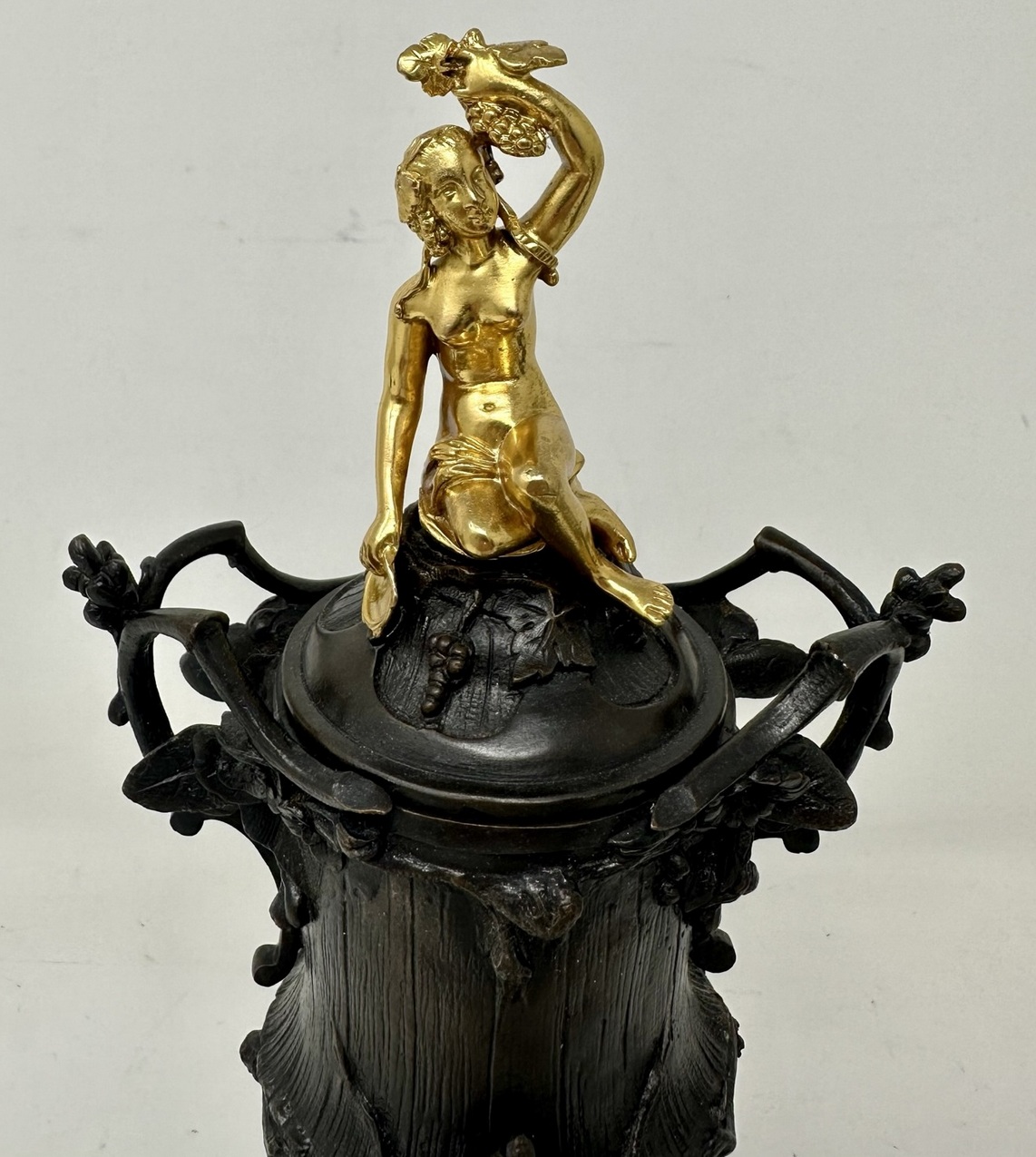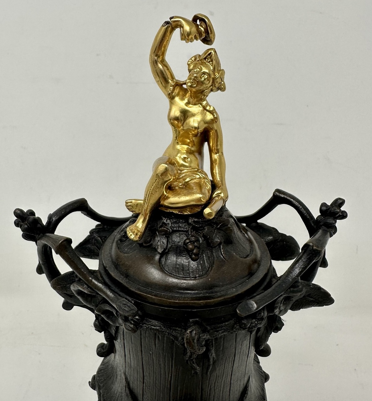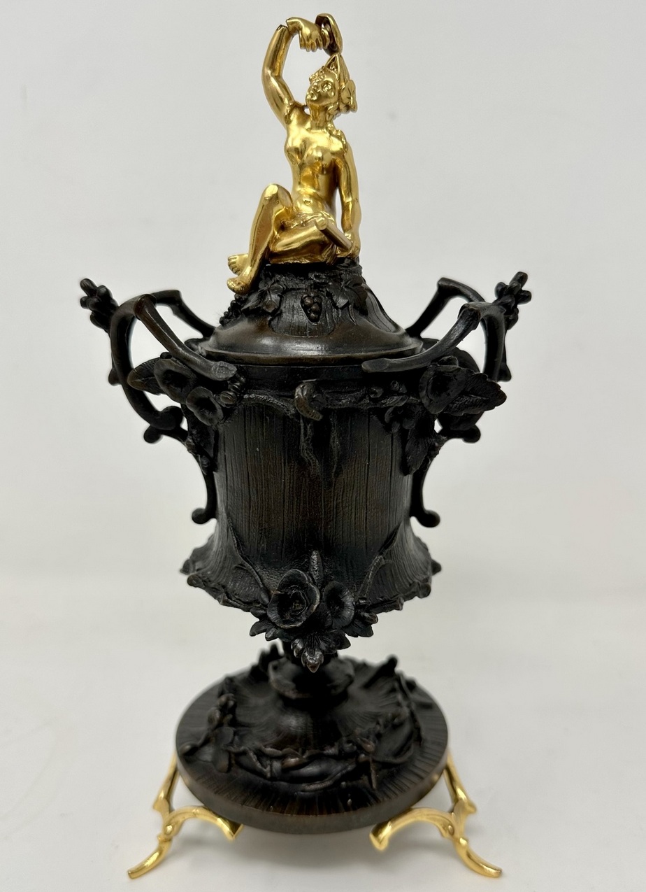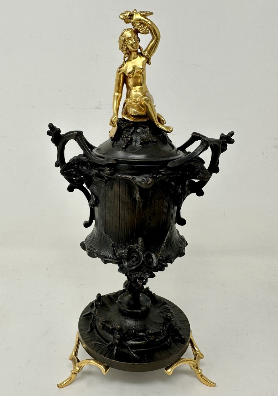 The stunning covers with exceptionally fine cast ormolu Maidens, one holding bunch grapes, the other a vessel.