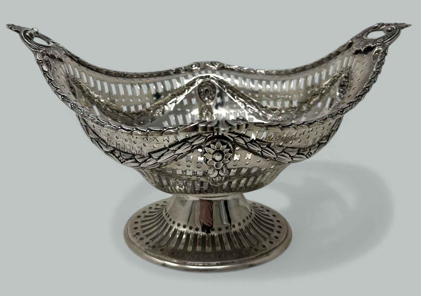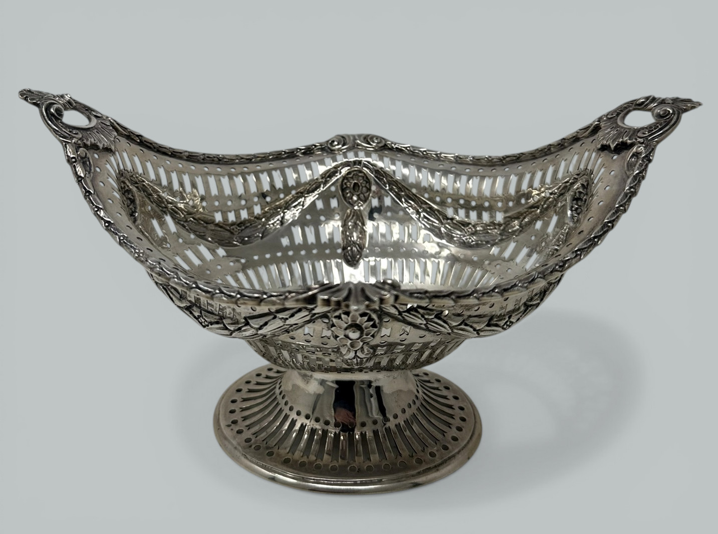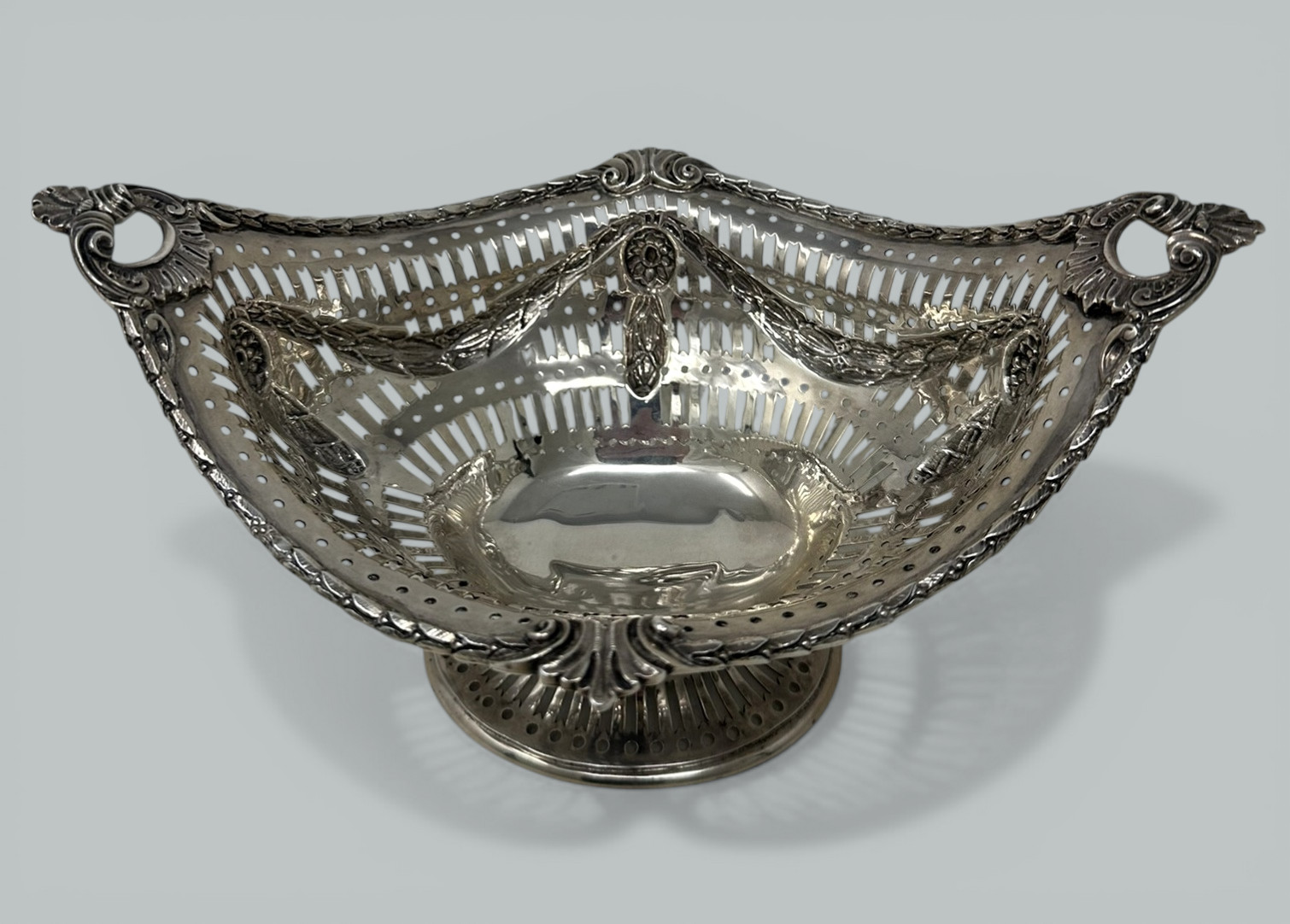The stylish oval bowl with twin pierced handle with lavish pierced body depicting all round swags, ending on a spreadinfg base with similar decoration
