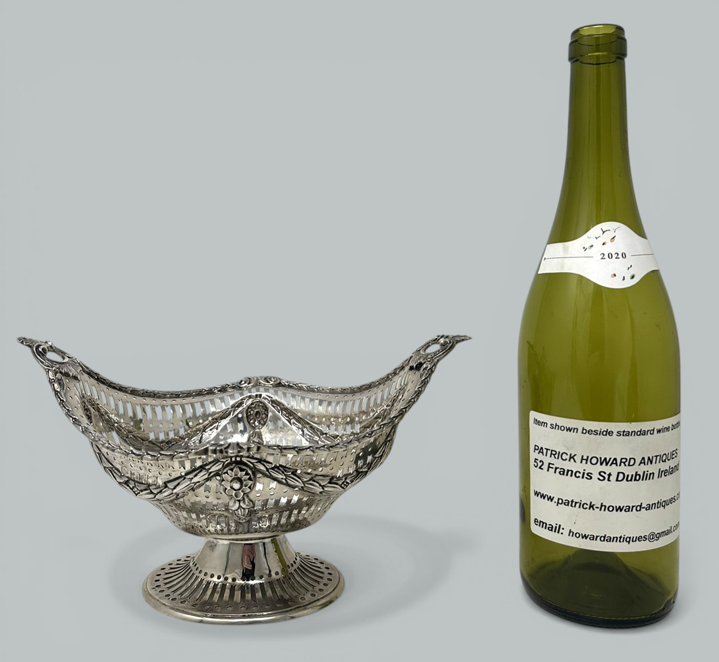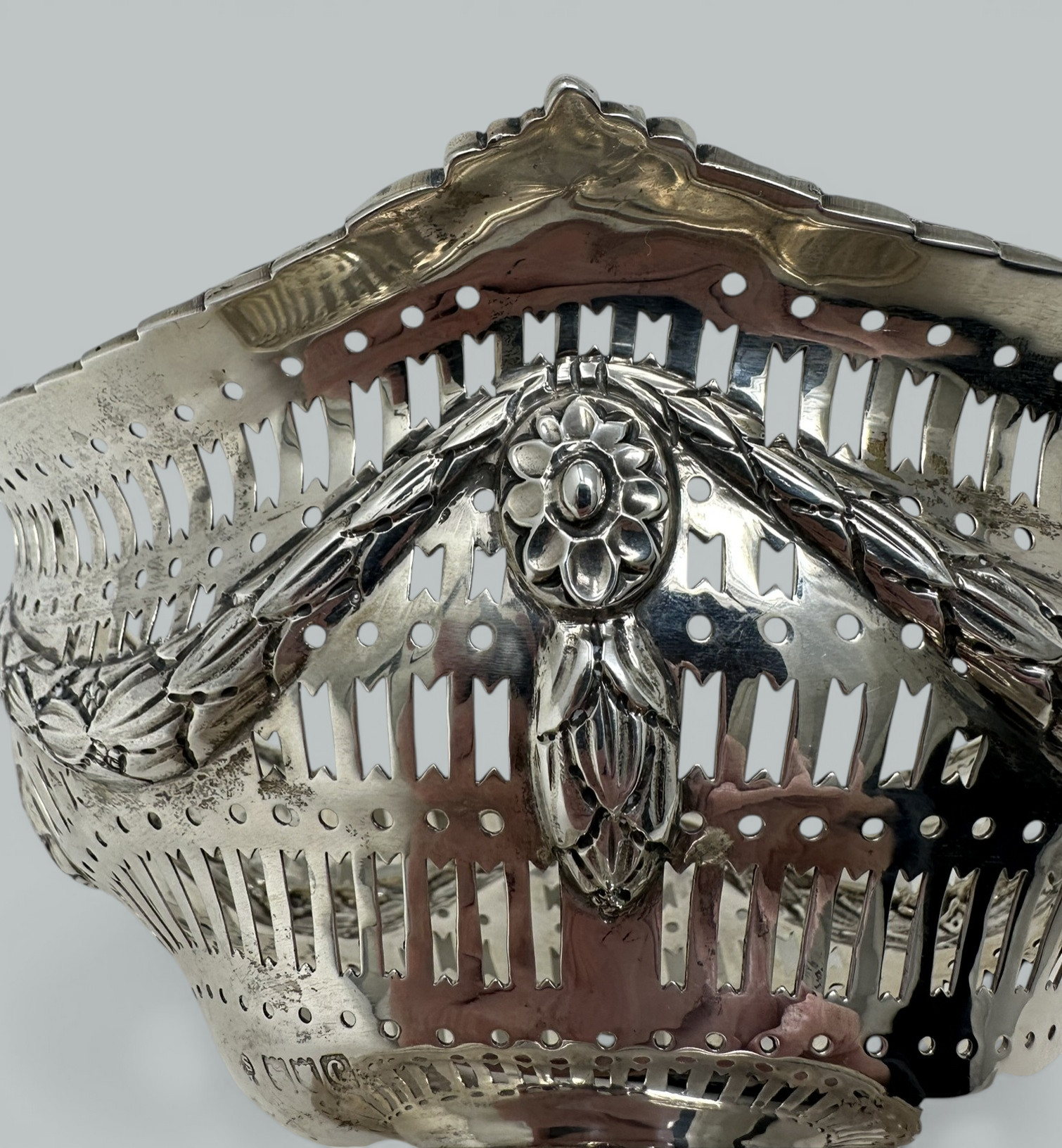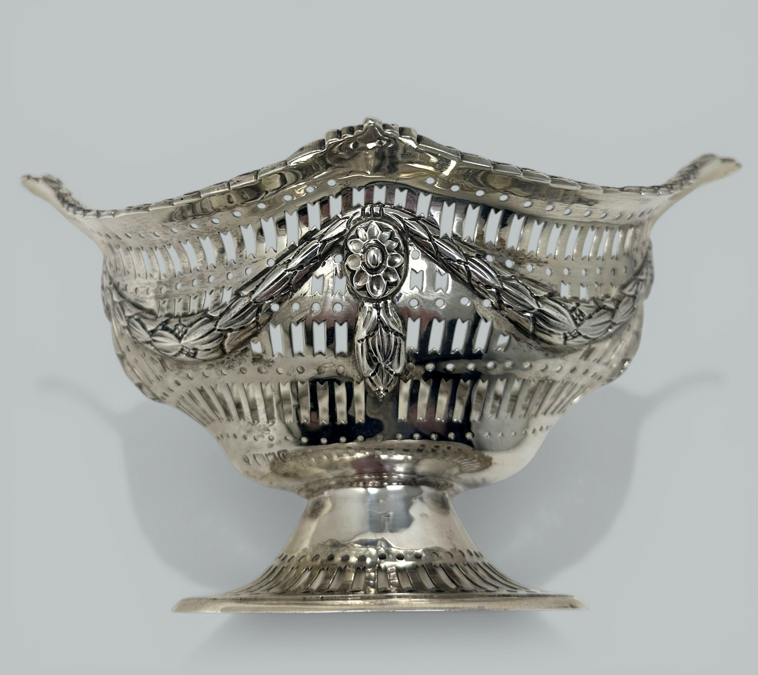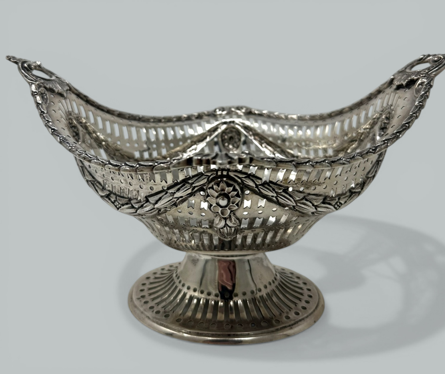 The stylish oval bowl with twin pierced handle with lavish pierced body depicting all round swags, ending on a spreadinfg base with similar decoration
