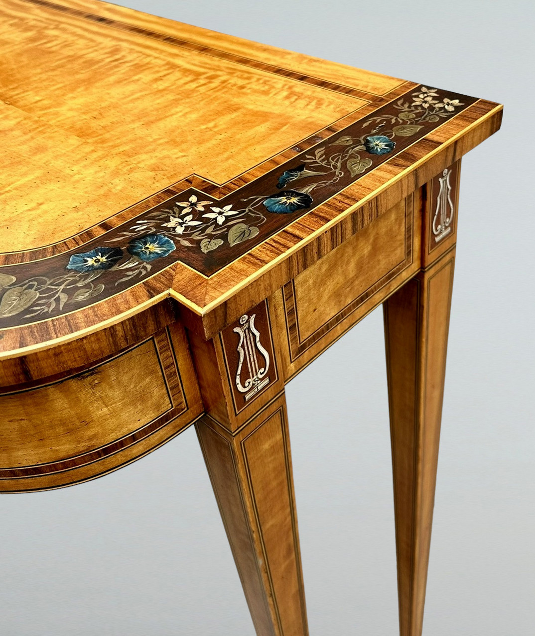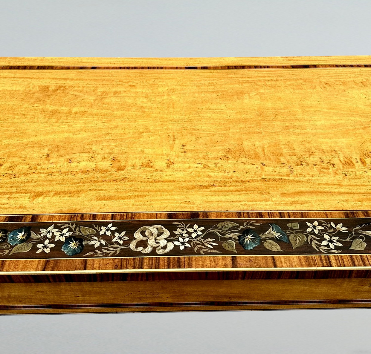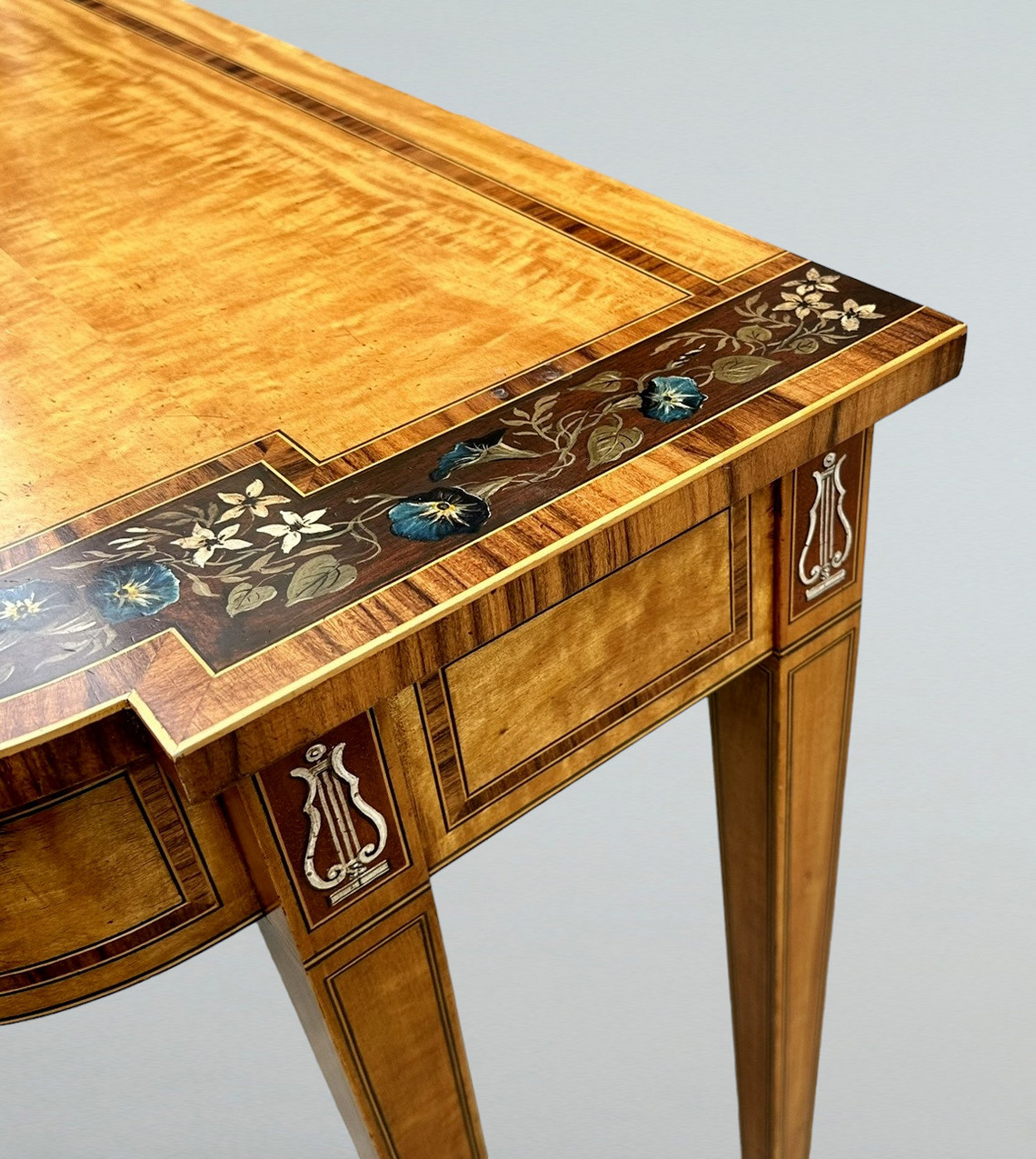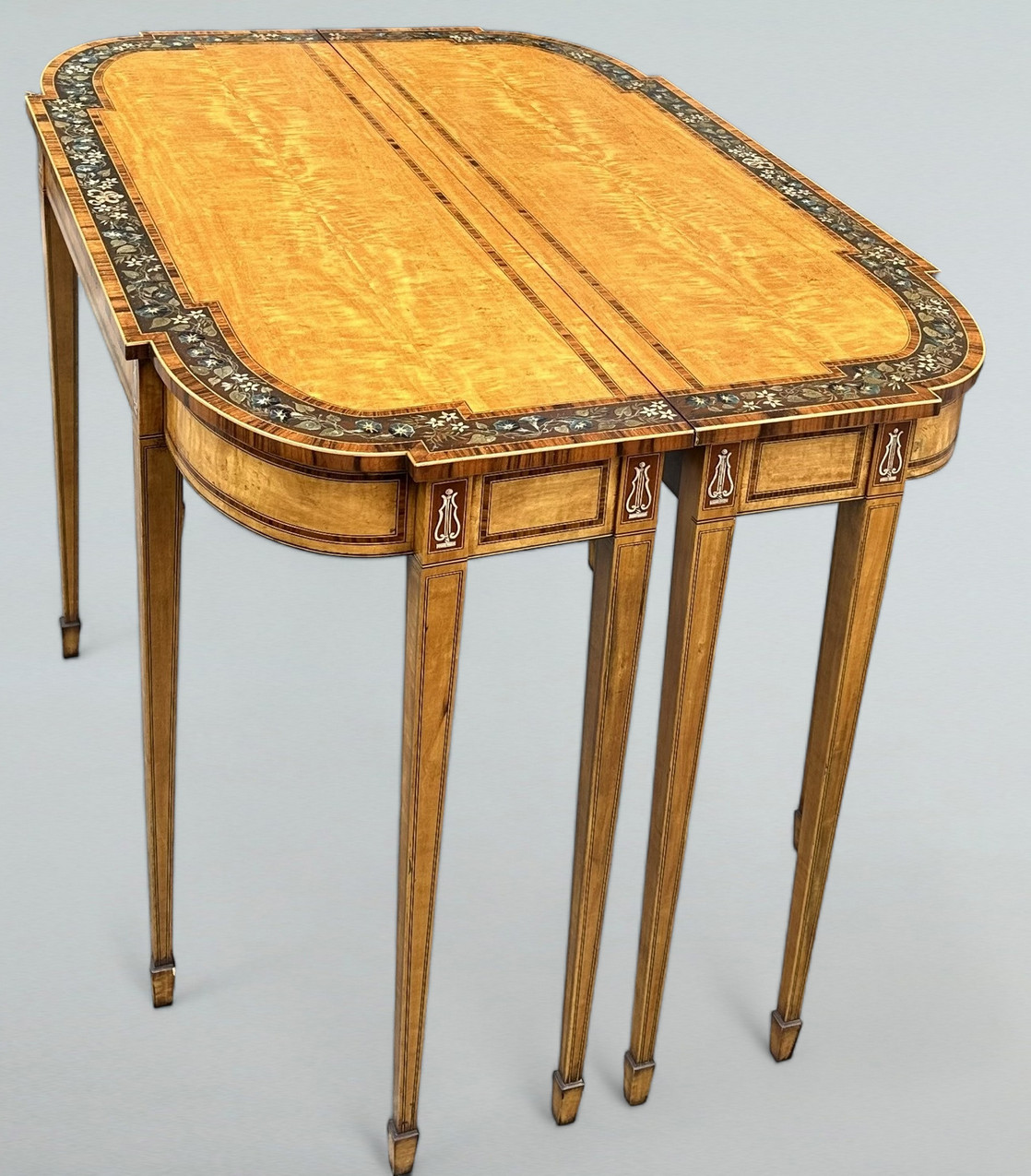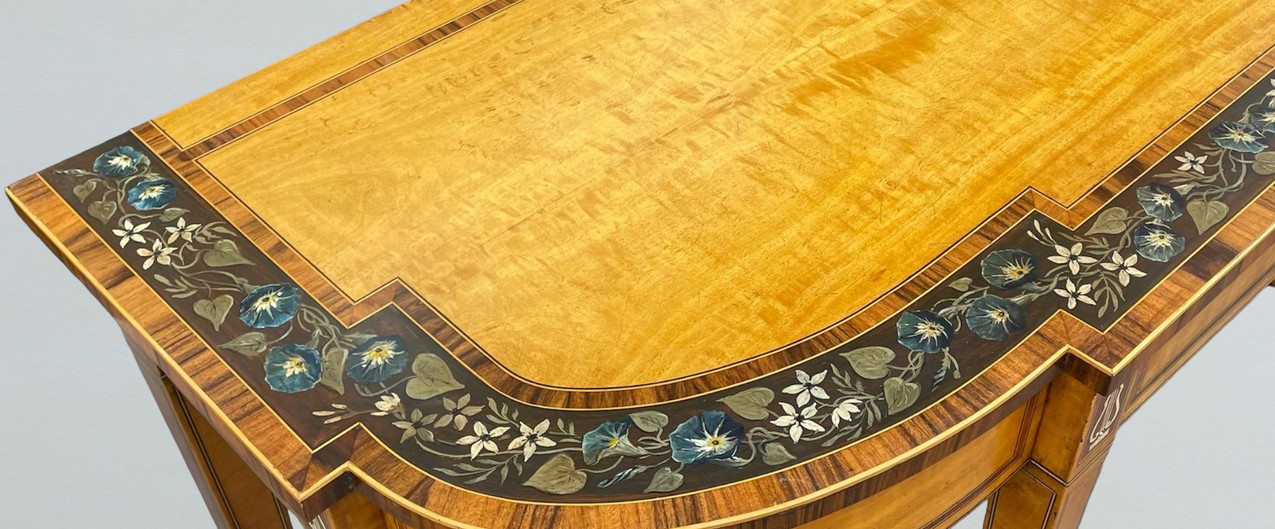These exceptional Tables utilizes sophisticated painted decoration associated with the firm of Seddon. In around 1790 George Seddon took his son-in-law Thomas Shackleton into the business and they traded as Seddon Son and Shackleton from 150 Aldersgate Street, London (1758-1815). Painted furniture from this period is known to have been a feature of the firm’s output thanks to two documented commissions, Hauteville House, St Peter Port, Guernsey (1790) and Bridwell House, Dorset (1792-3). The Hauteville commission included a set of eighteen painted satinwood elbow chairs with three matching window seats (see’A Catalogue and Index of old Furniture and Works of Decorative Art, Pt III’, M. Harris and Sons, p.386-9, and the Bridwell commission, a satinwood card table and pair of Pembroke tables, see C.Gilbert and G.Beard The Dictionary of English Furniture Makers 1660-1840, 1986, pp.796-7.)