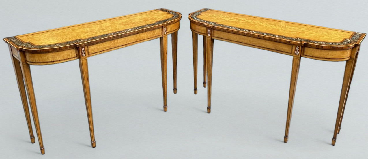 597. Antique Pair English Console Side Demilune Painted Satinwood Tables after Seddon