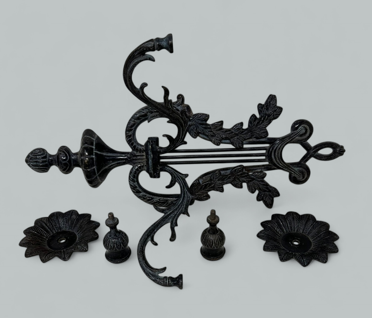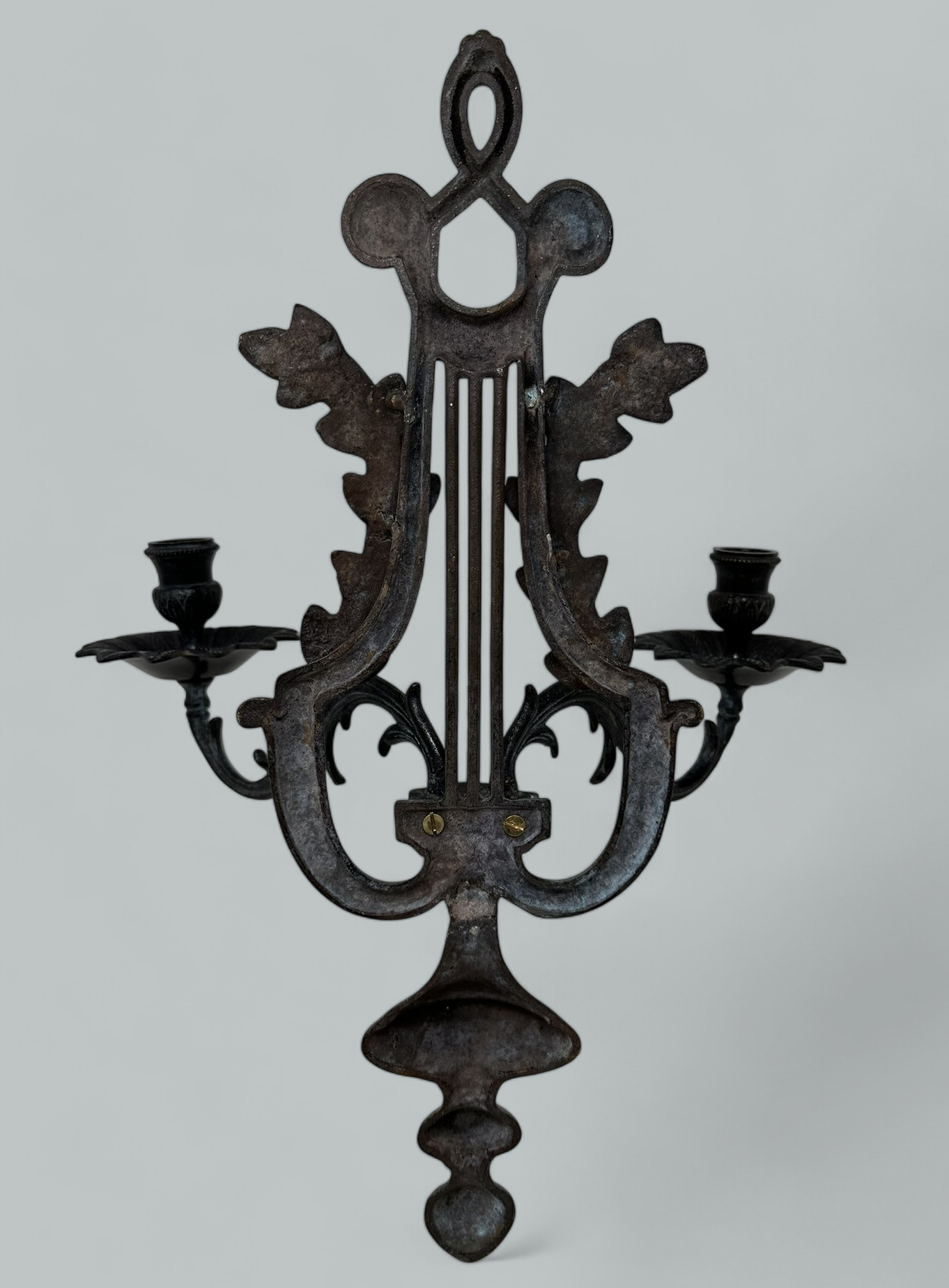 Each central back support modelled as a musical Lyre, flanked by acanthus leaf detailing below a central swag. The twin scroll arms issuing from a single solid back plate. The circular arm plates with leaf cast rim detail and their original candle holders.