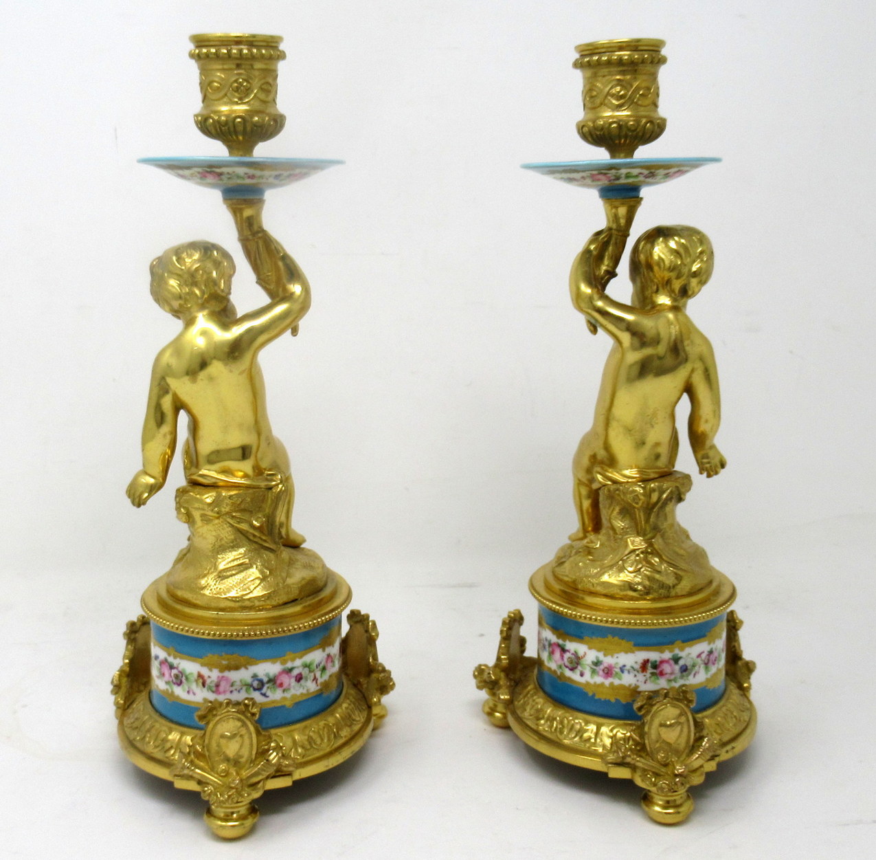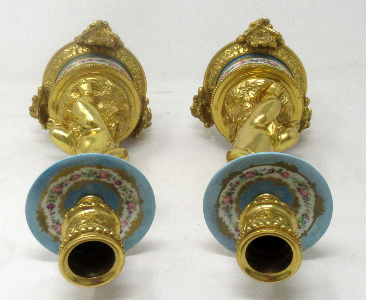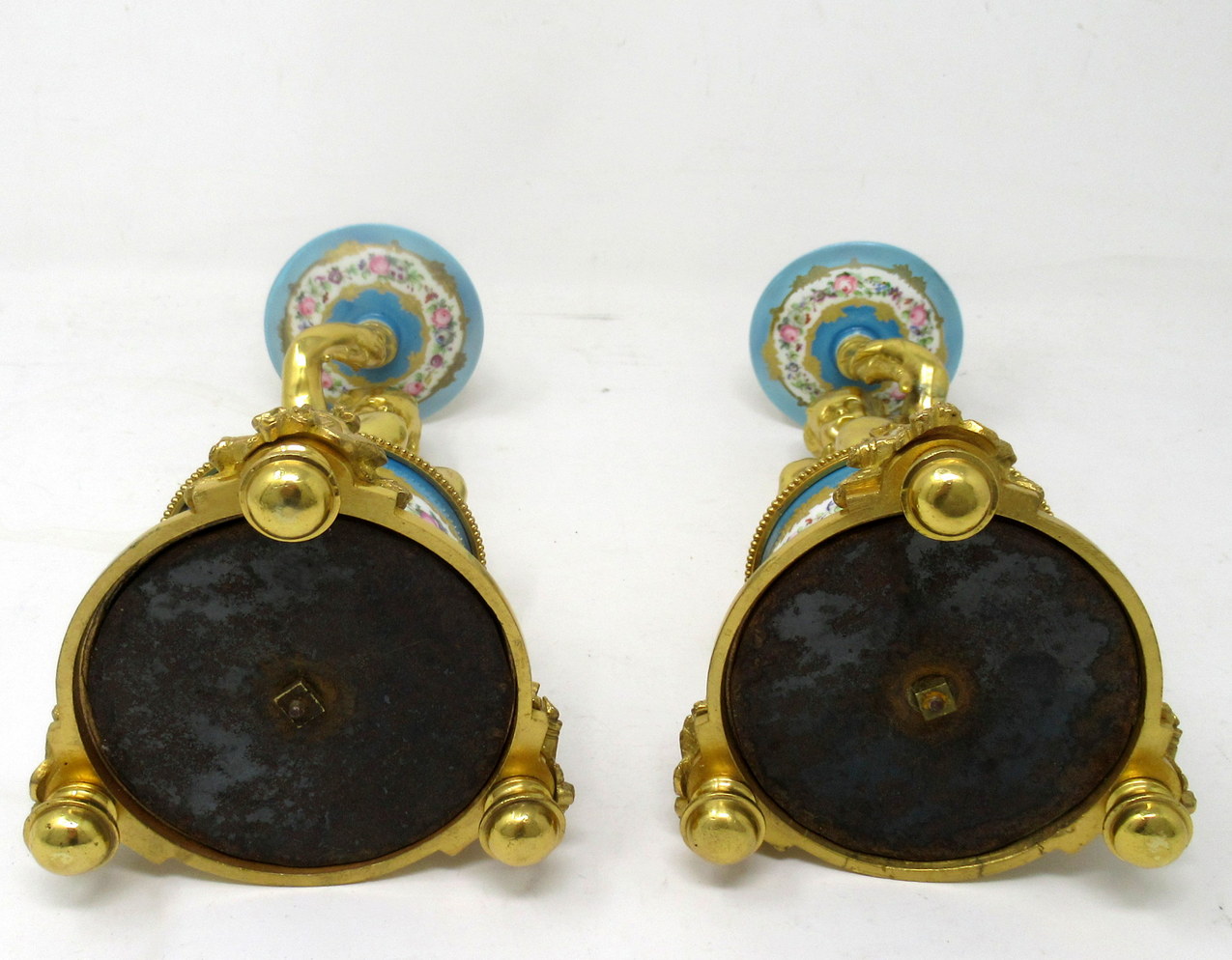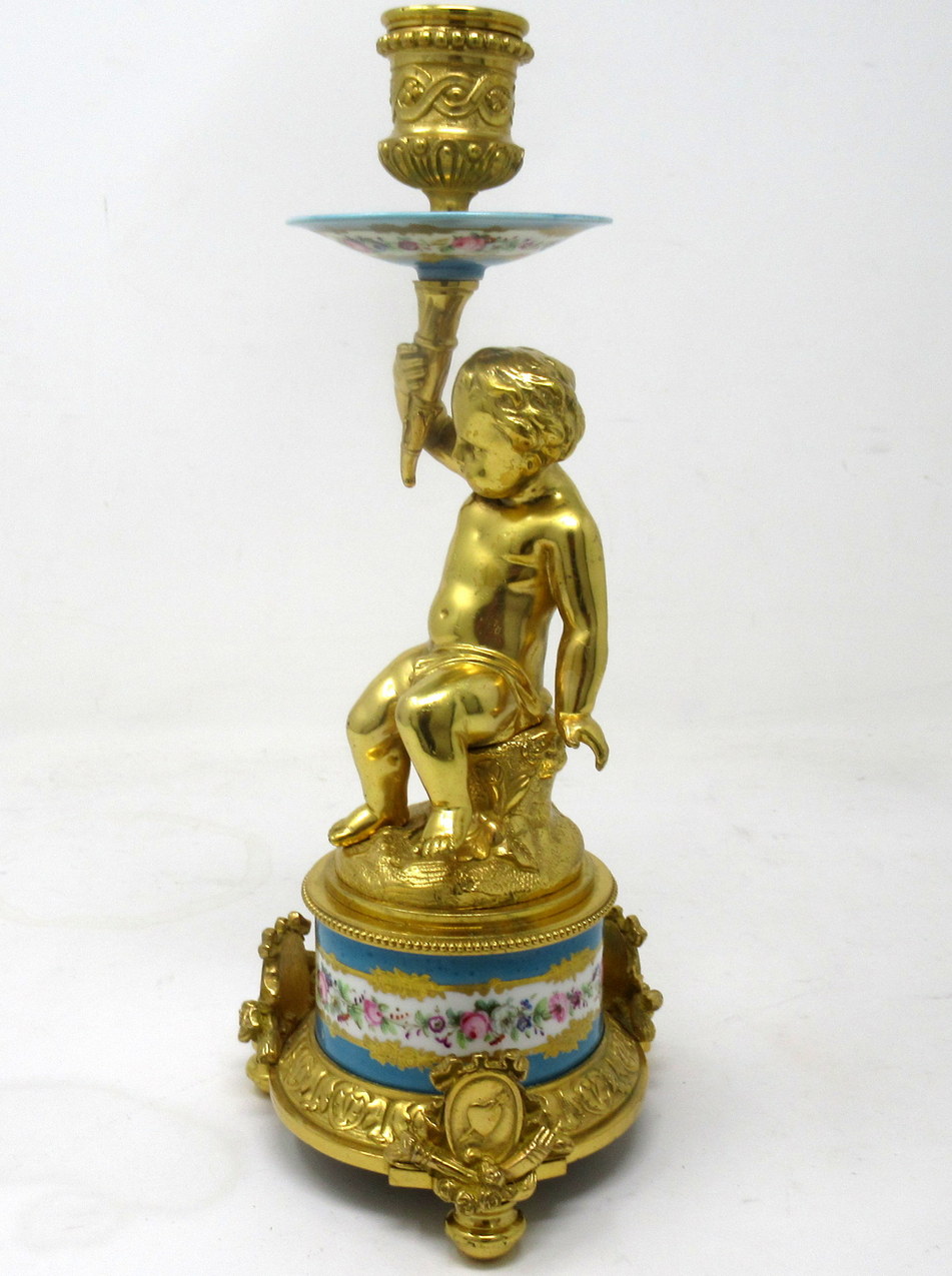 614. Antique Pair Ormolu Sèvres Porcelain Gilt Bronze Celeste Candlesticks Candelabra
