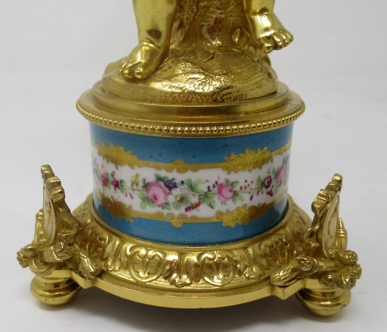 Each central support modelled as a Cherub seated on a naturalistic base above a soft paste porcelain socle with a band of hand painted flowers within a lavish gilt surround on a celeste blue ground. Raised on three very decorative ormolu supports
