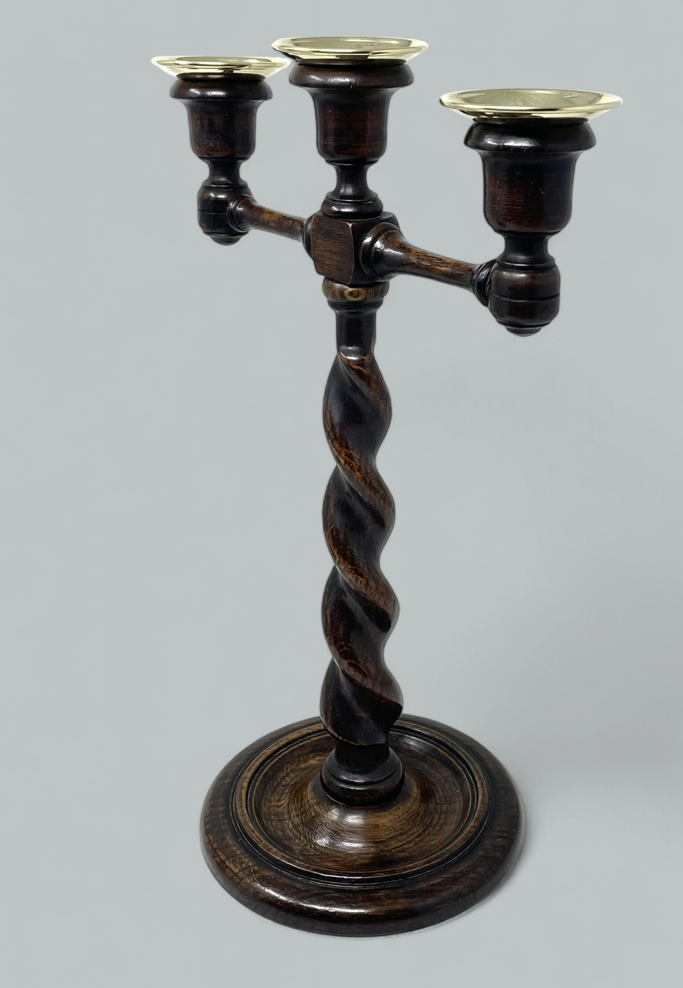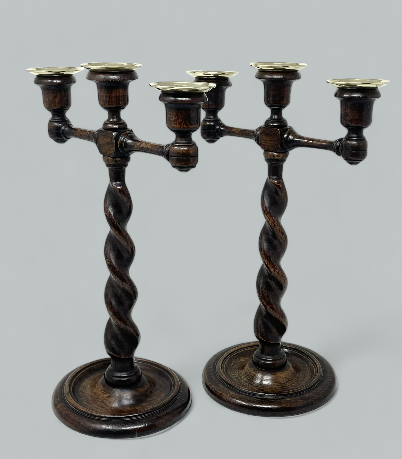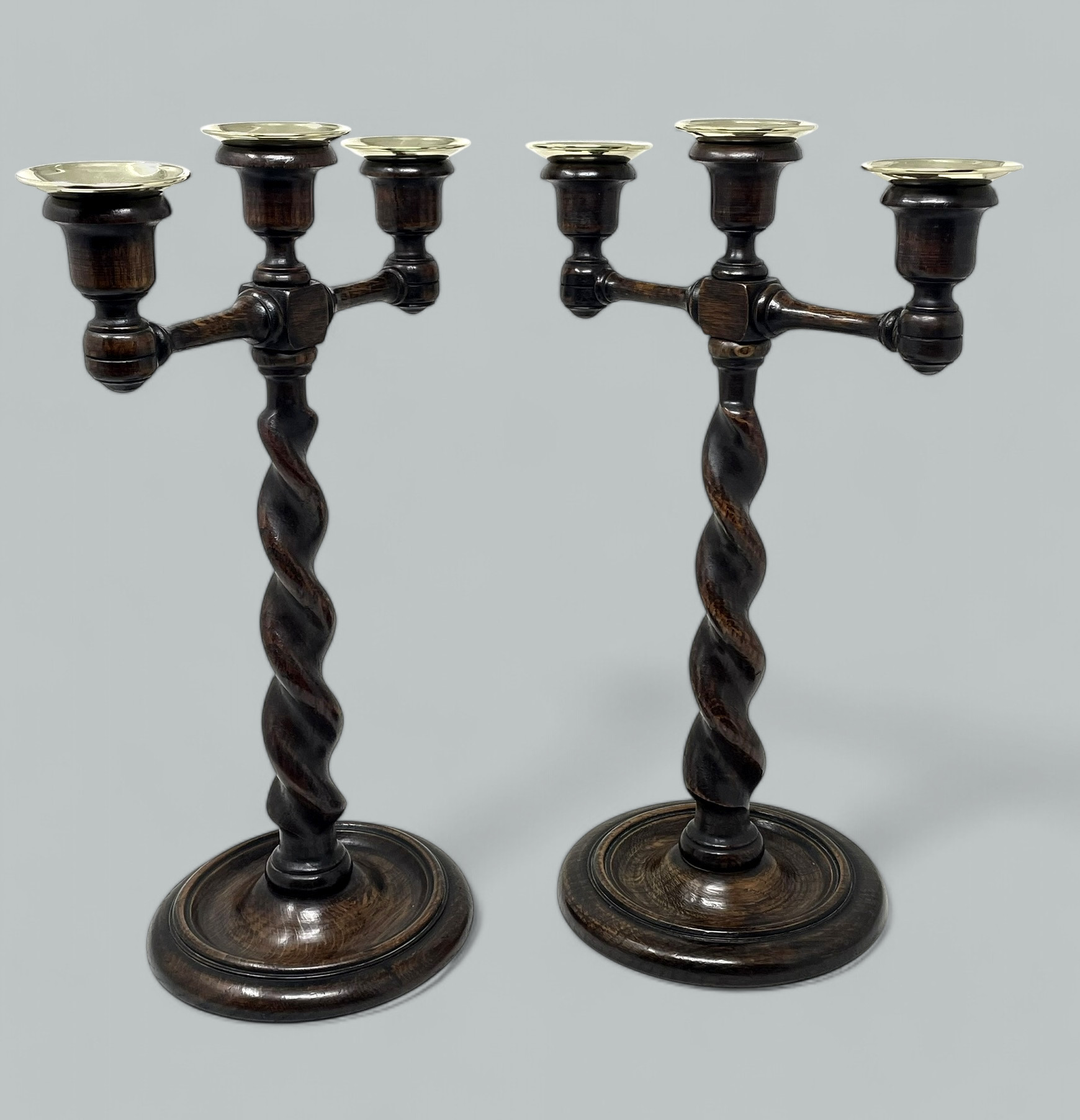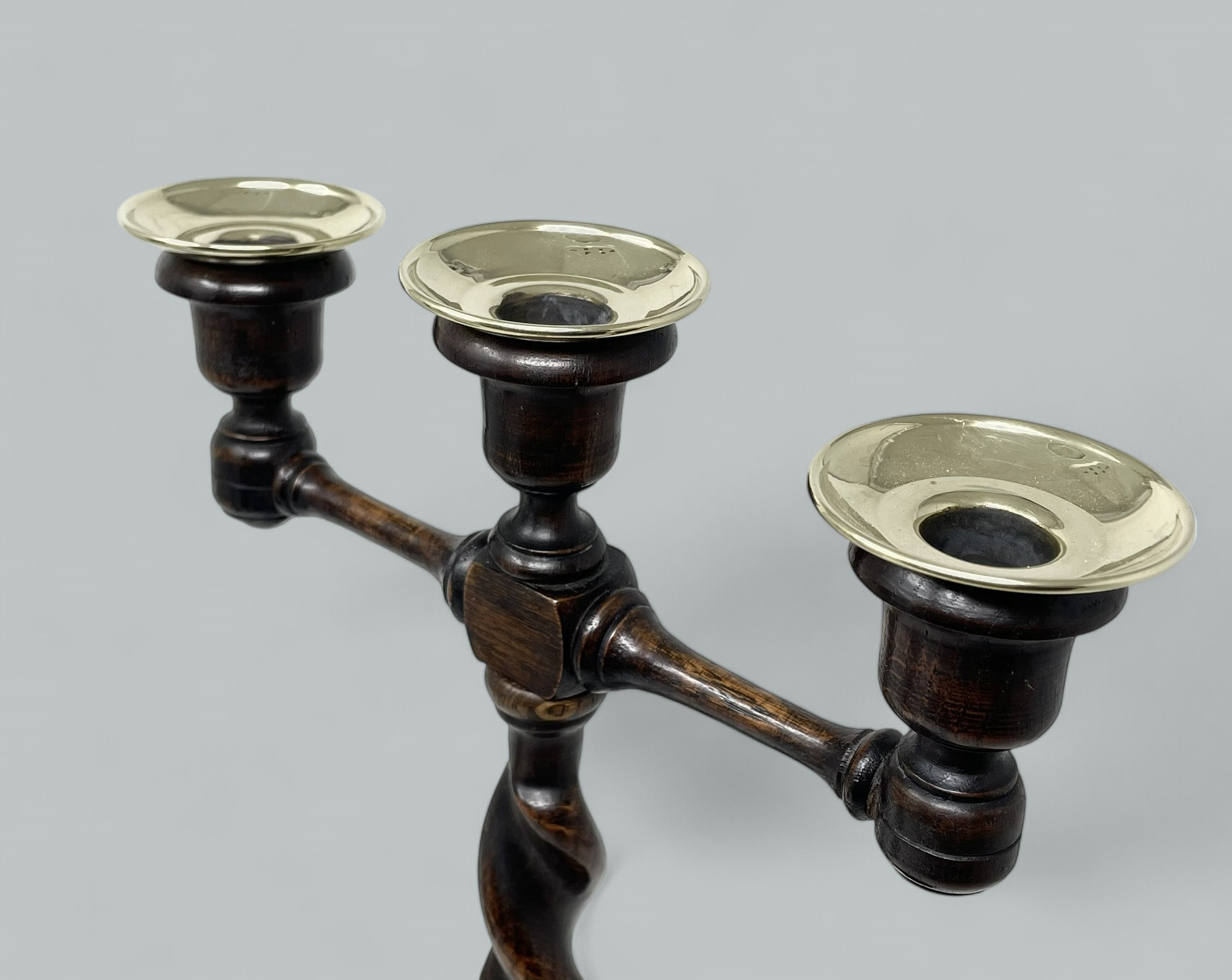 An Exceptionally Stylish Pair of late Victorian Polished Oak Three Light Candelabra of English origin, complete with their original polished brass drip pans.